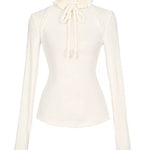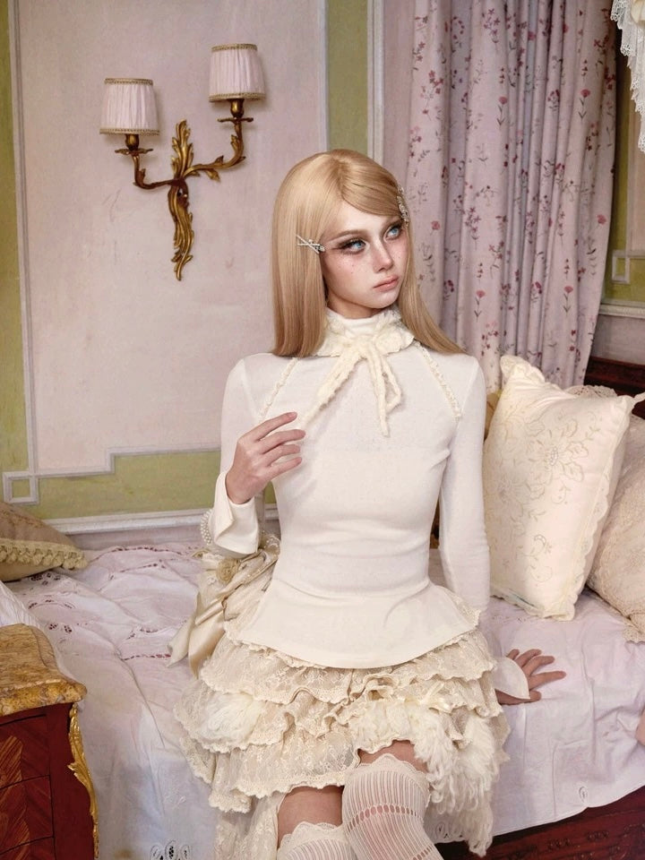 Inspired by classic winter heirloom fashion, blending soft milk-ivory tones with delicate knitted textures. The rib-knit fabric provides a light, breathable fit while maintaining warmth, and adds a romantic decorative element reminiscent of vintage aristocratic attire.