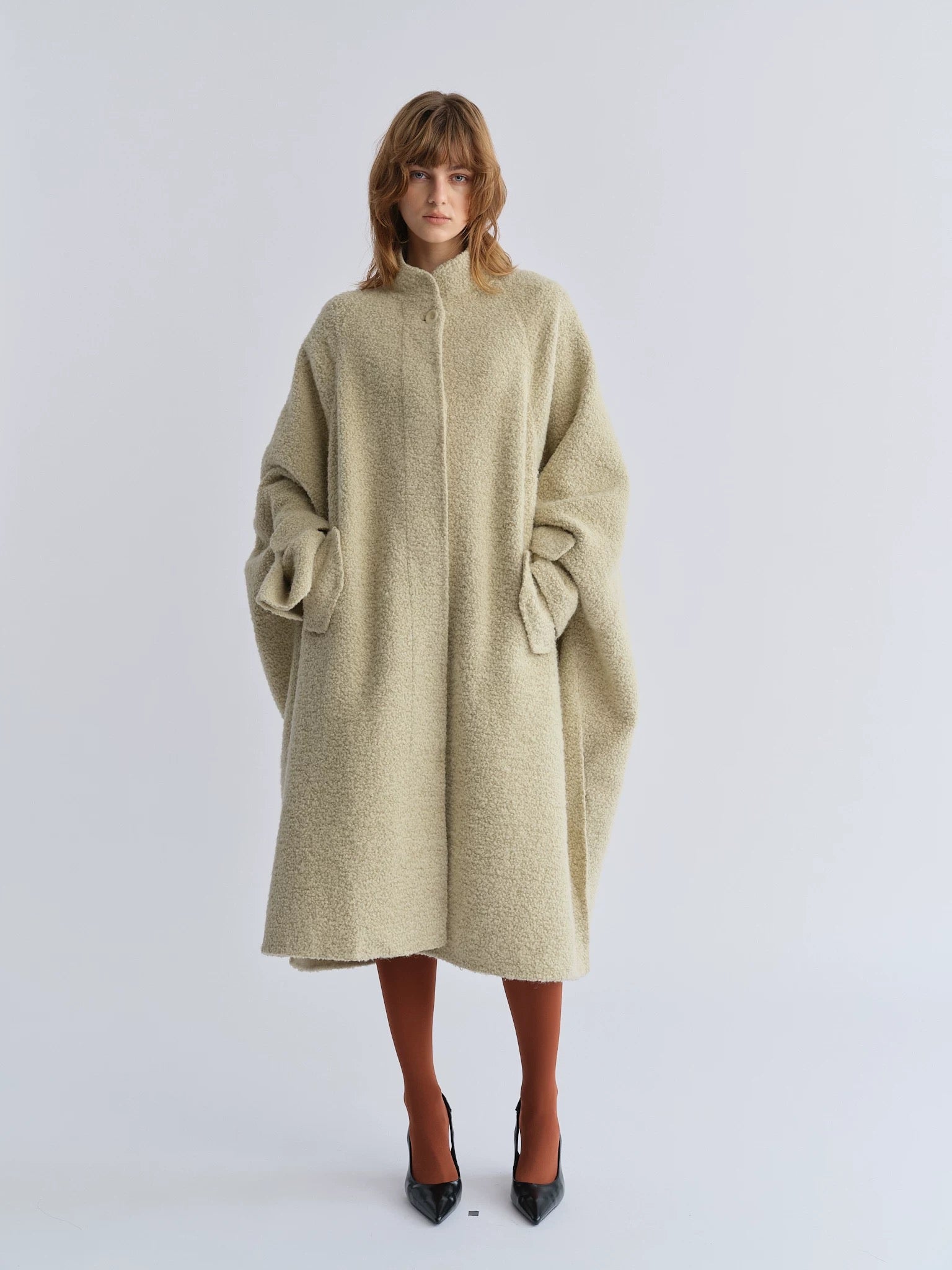 The detachable brown-grey faux-fur neck warmer adds warmth and a soft textural contrast, allowing two versatile looks: minimalist without the collar, or cozy and elevated with it. Extra-wide sleeves, generous volume, and asymmetric side openings create fluid movement and a modern architectural shape.