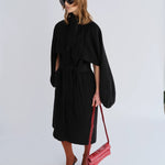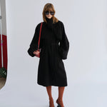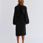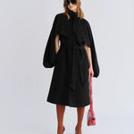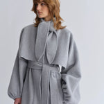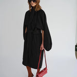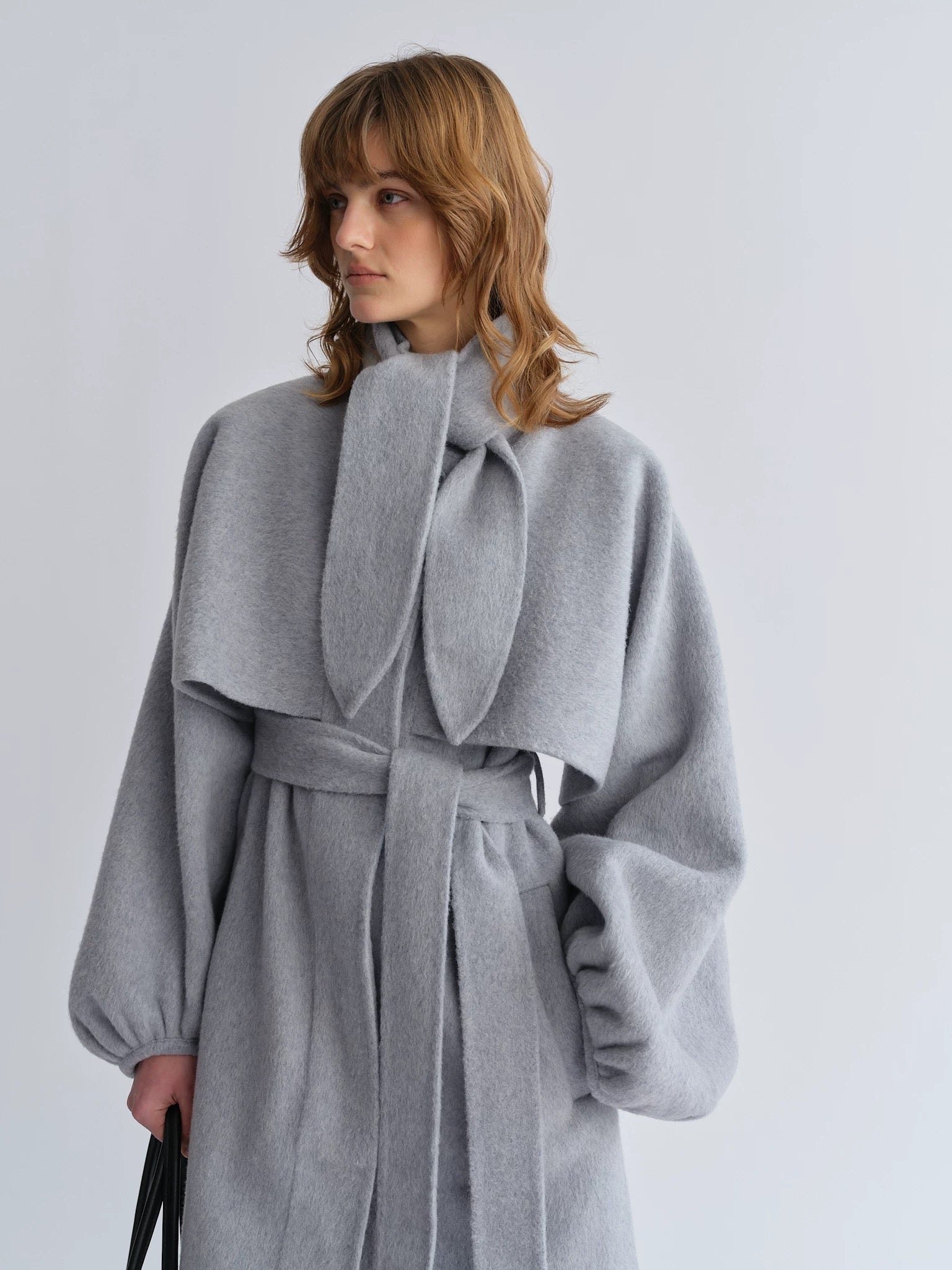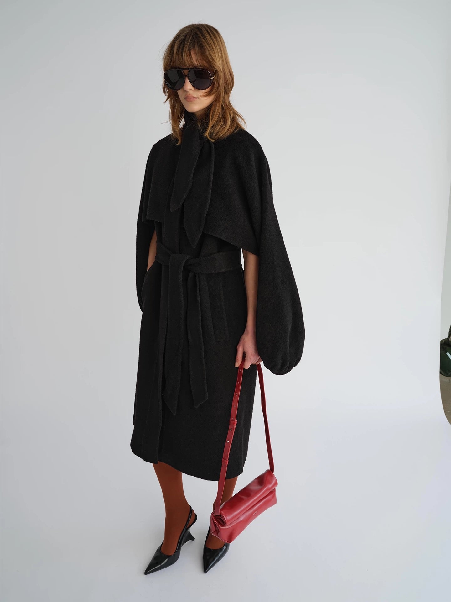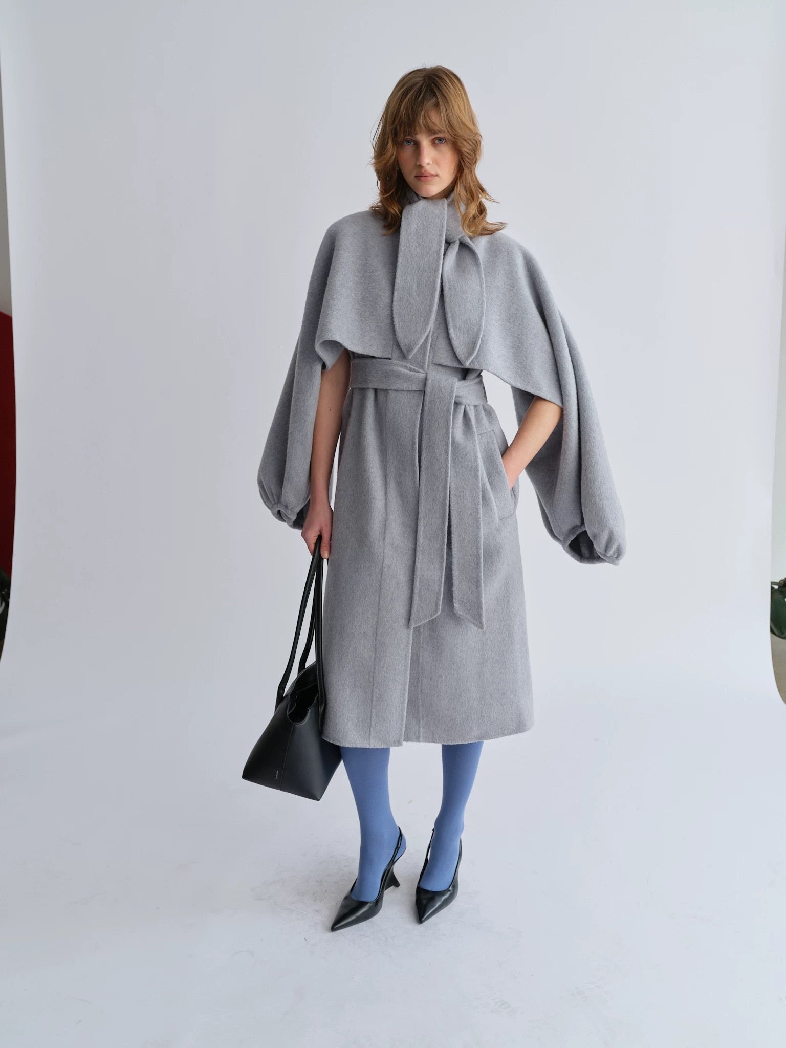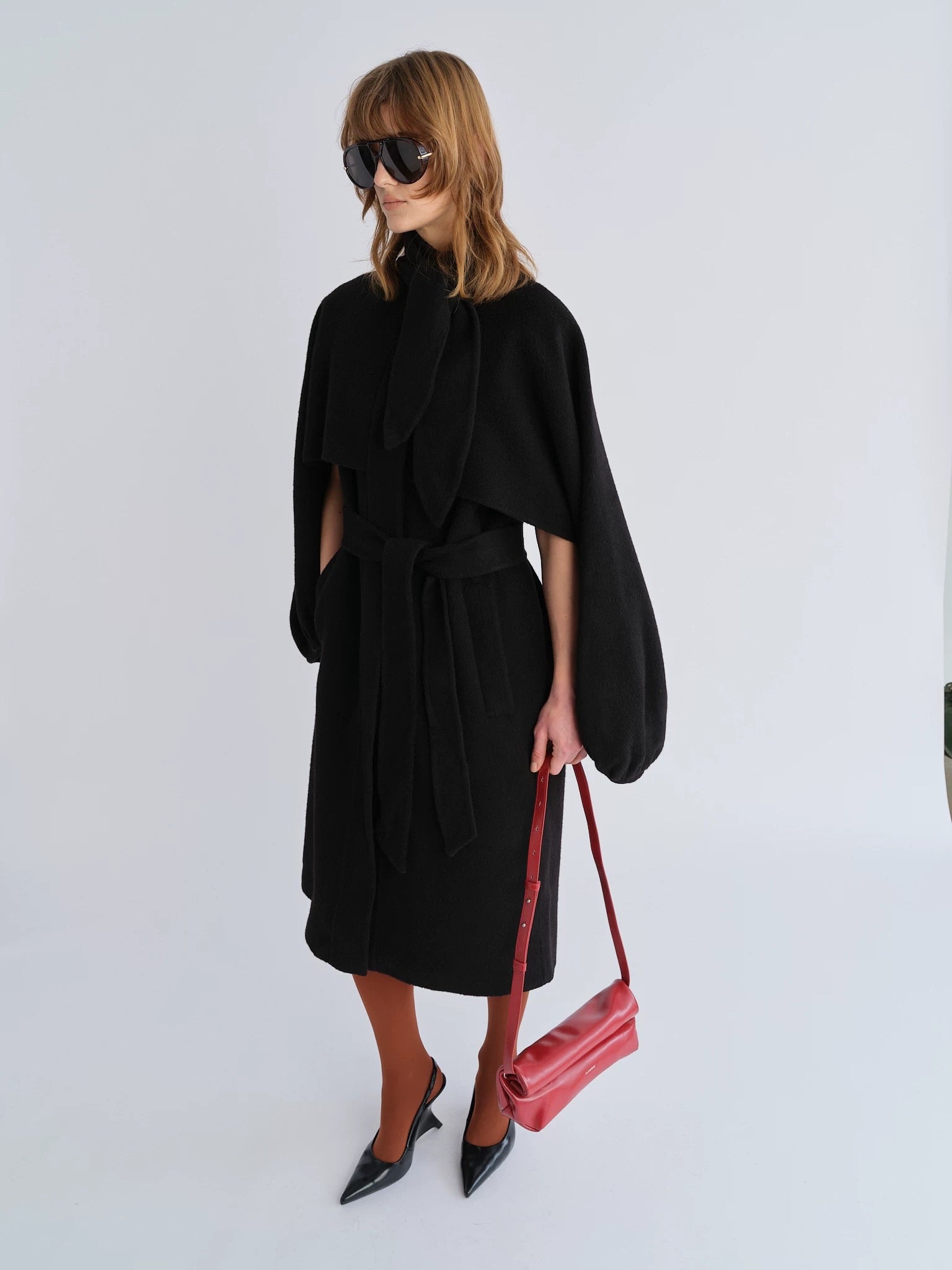 This mid-length design features PREEKEND’s signature sculptural silhouette: voluminous lantern sleeves, a flowy cape overlay, and a playful knotted “bunny-ear” collar that adds personality while maintaining an elegant, city-ready attitude.