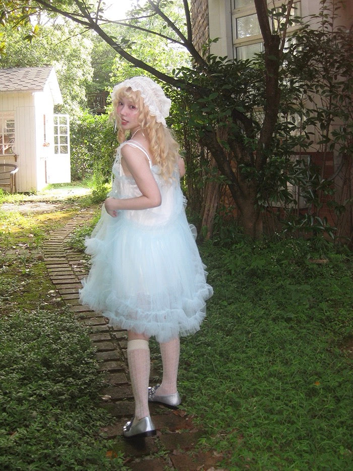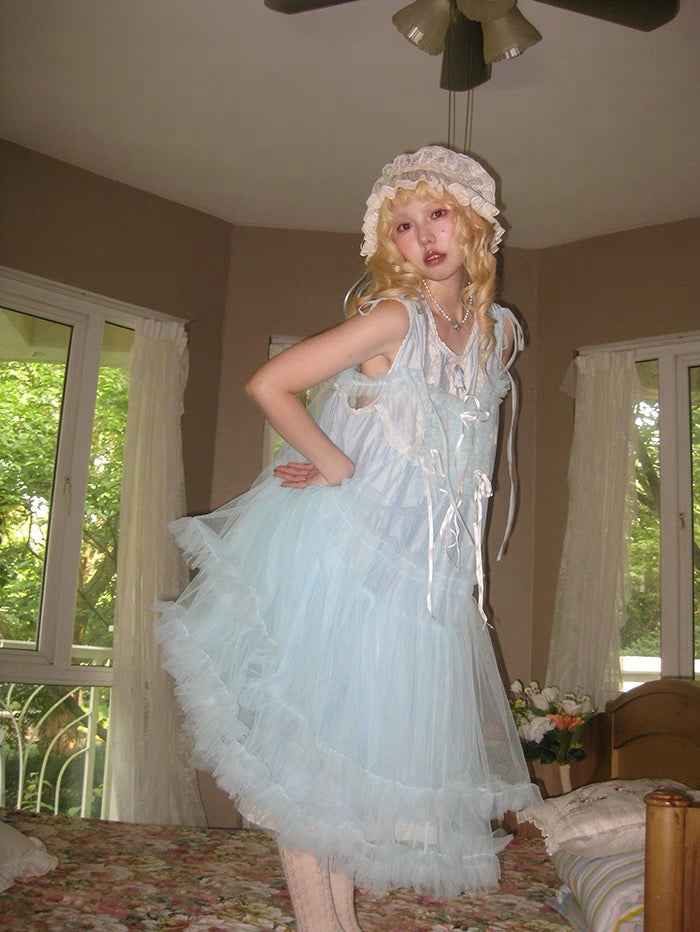 Finished with satin ribbon bows and shoulder ties, this delicate piece creates the illusion of sitting atop the clouds. A seasonal favorite for ethereal souls, dollcore girls, or anyone embracing their soft fairy side 🧚‍♀️💕