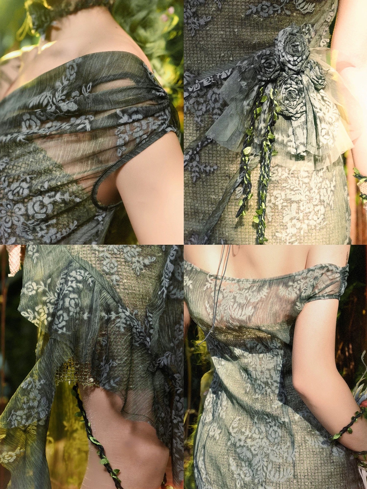 The outer layer of deep moss-green mesh adds depth and texture, draping like a veil of enchanted mist. The off-shoulder gown is made from lightweight, semi-sheer flocked fabric, its mottled patterns resembling damp moss clinging to ancient stone walls. The translucent base subtly reveals the textures of the underlying mesh, creating an aura of hidden allure.