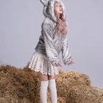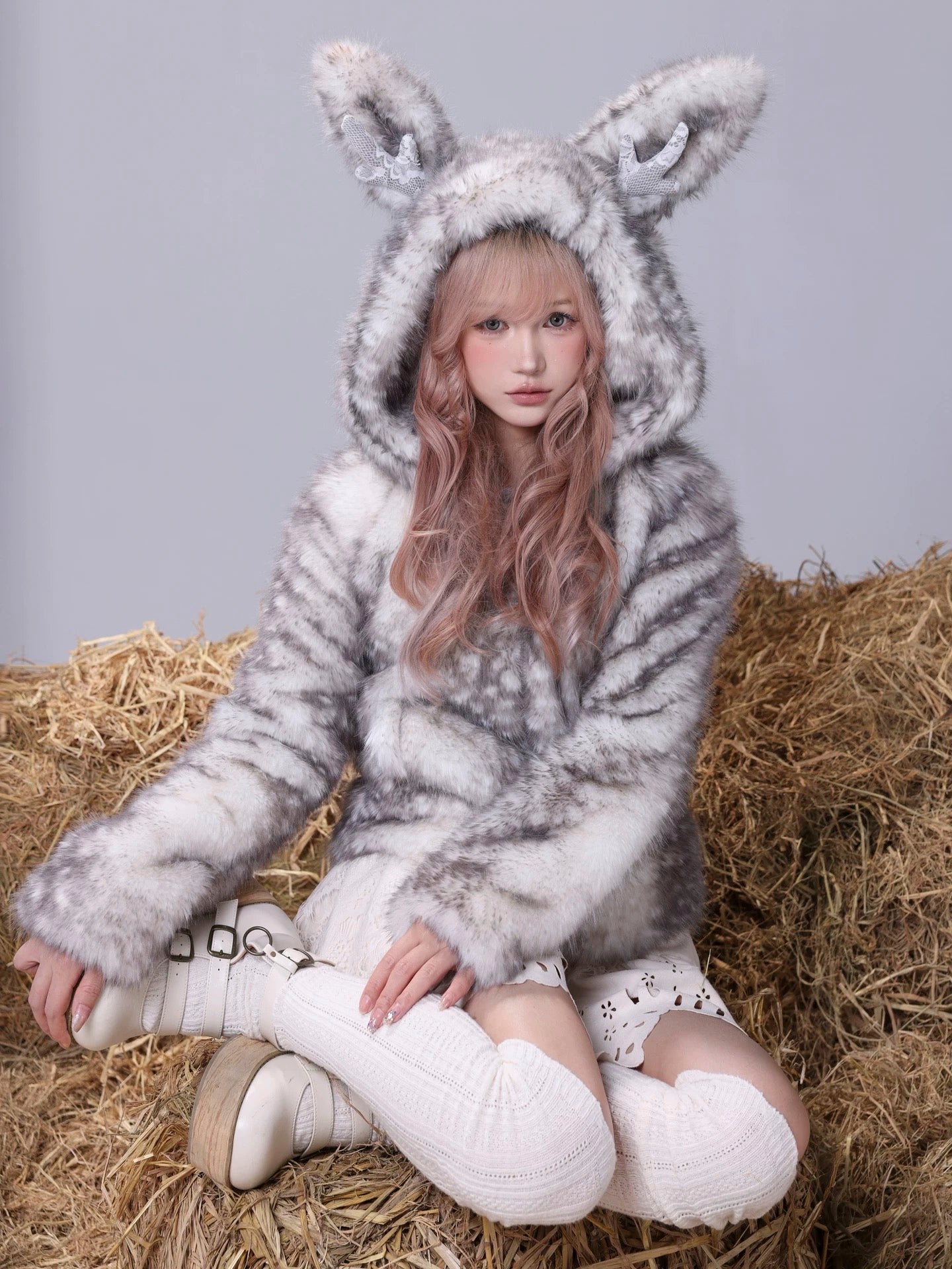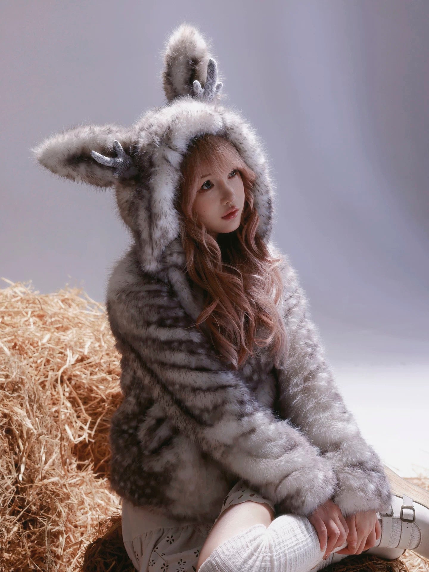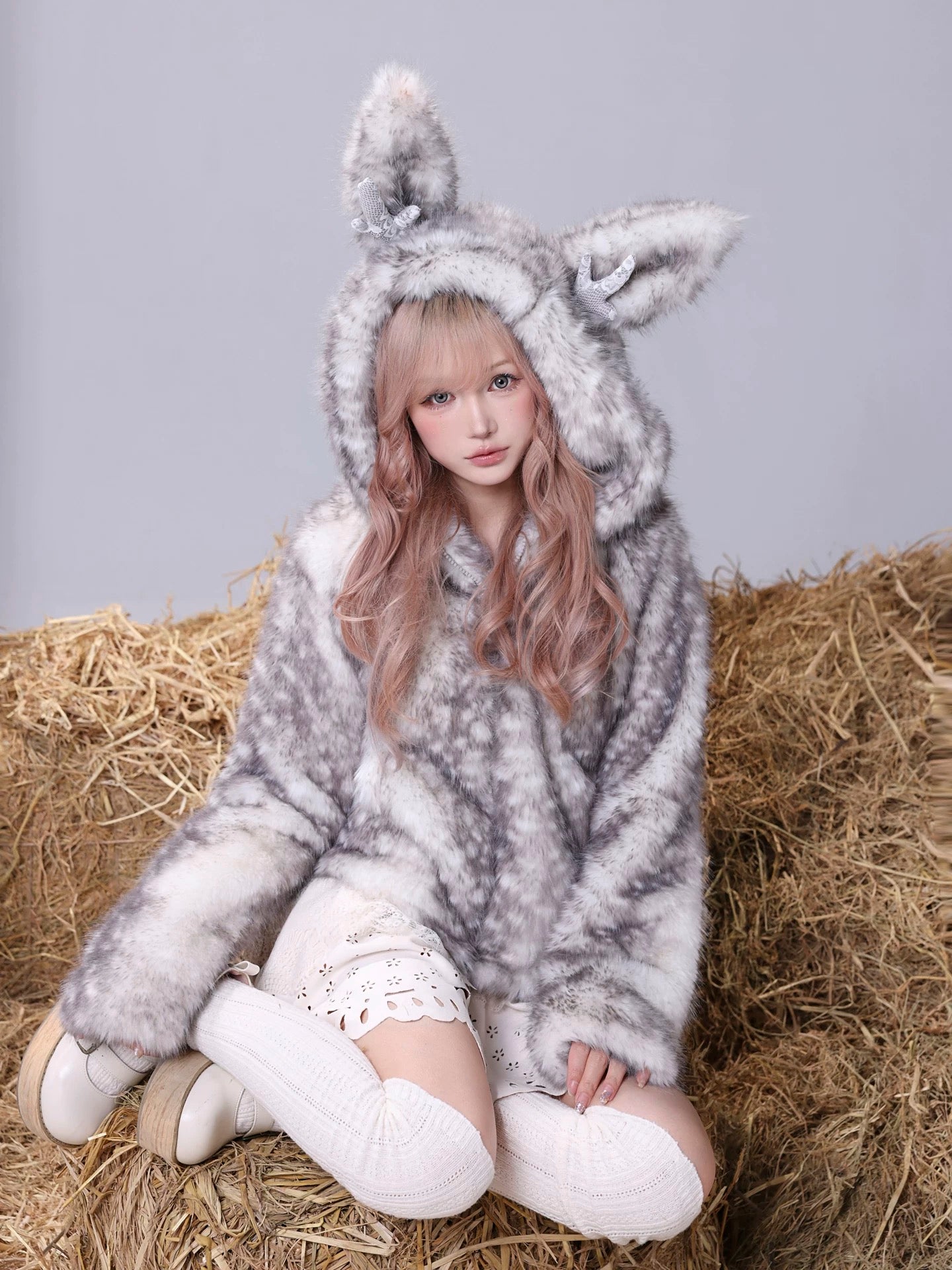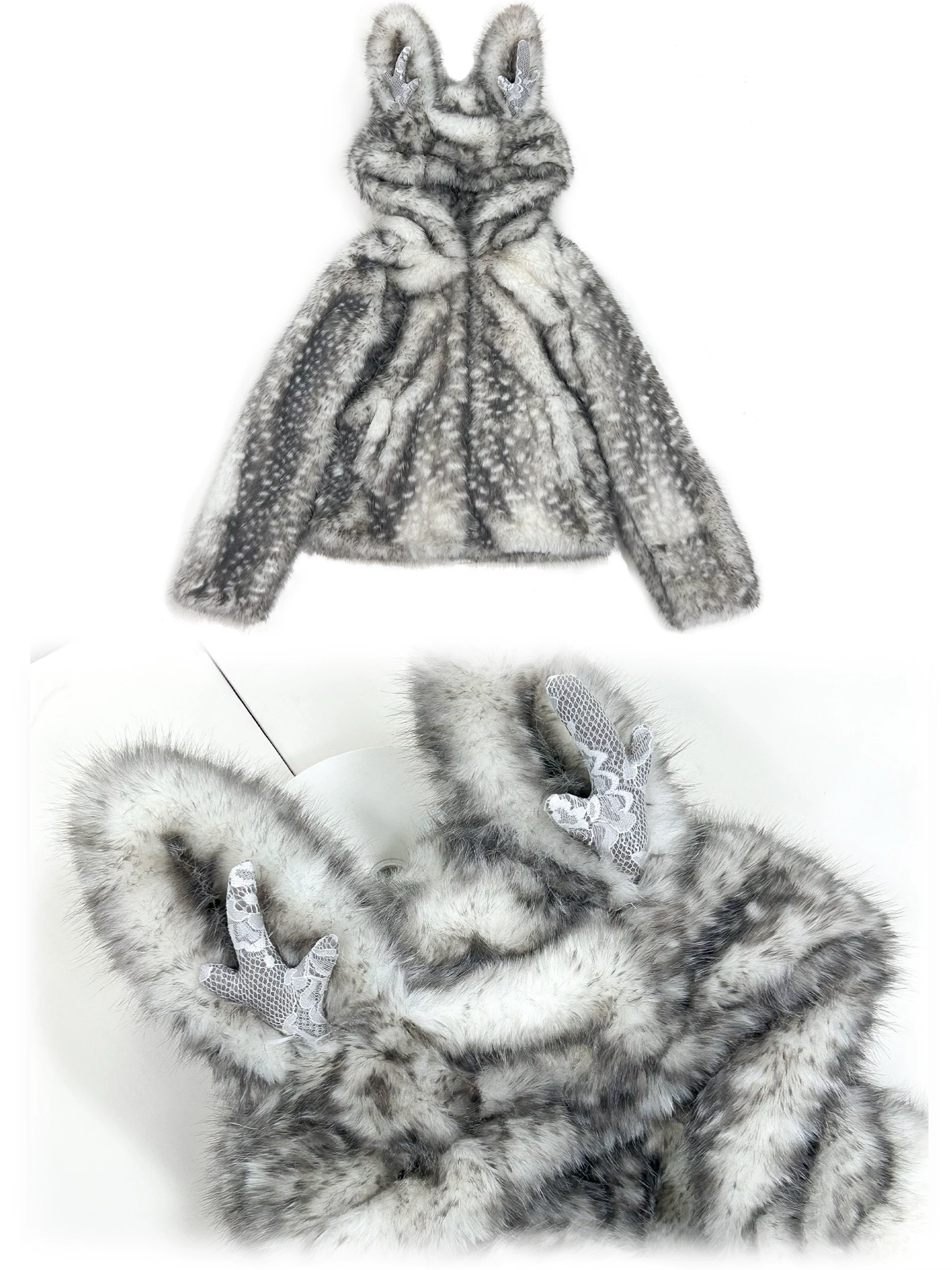 The Nordic Lucky Deer Jacket captures that same spirit of warmth and luck — soft grey fawn-pattern faux fur with long ears and delicate silver lace antlers, carrying a little piece of Nordic magic that brings you good luck wherever you go.