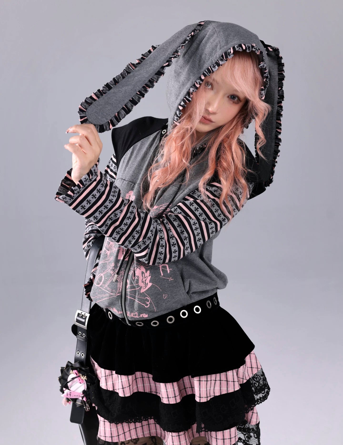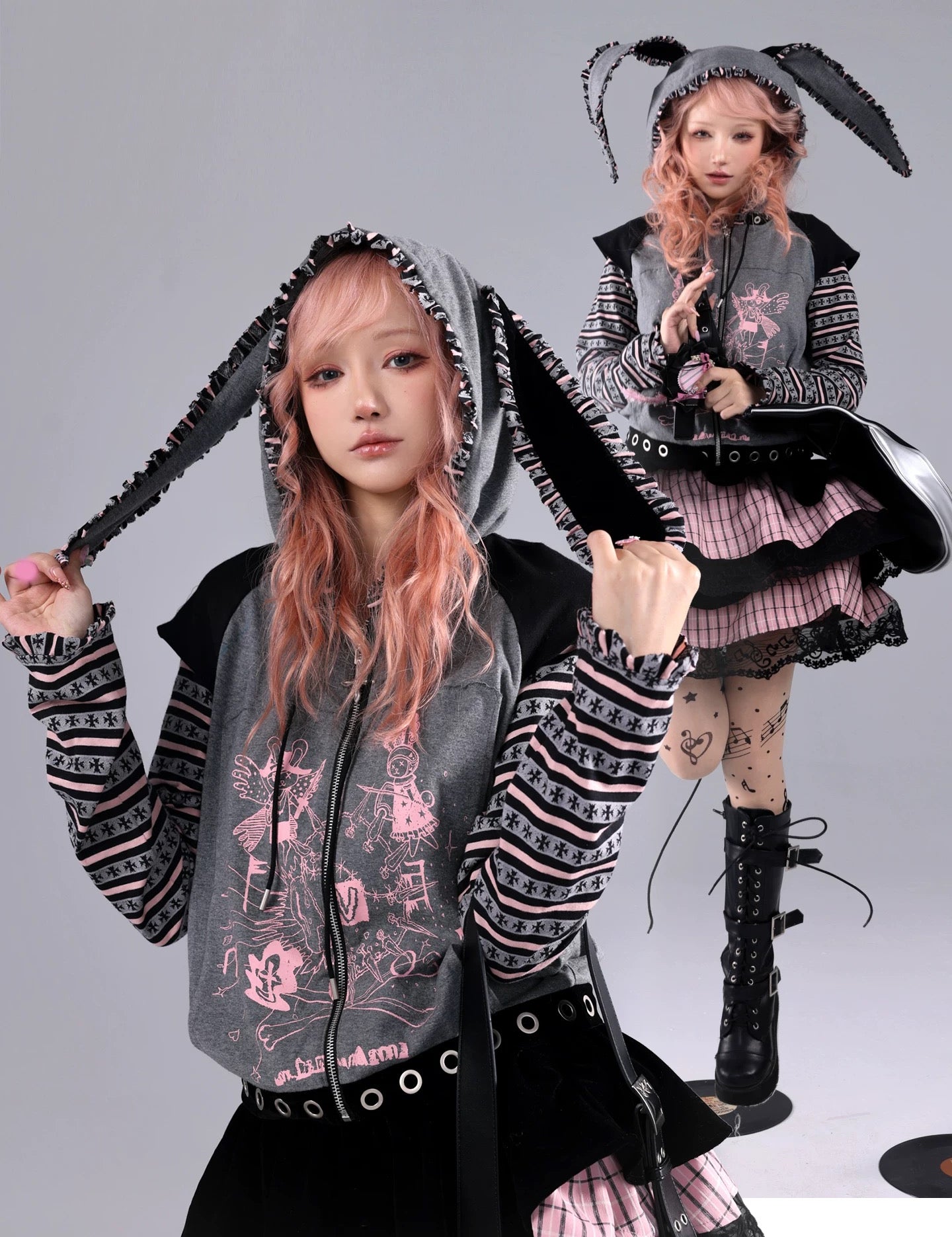 Two girls wearing matching pink and white outfits with cat ears faux fur fluffy cape front view