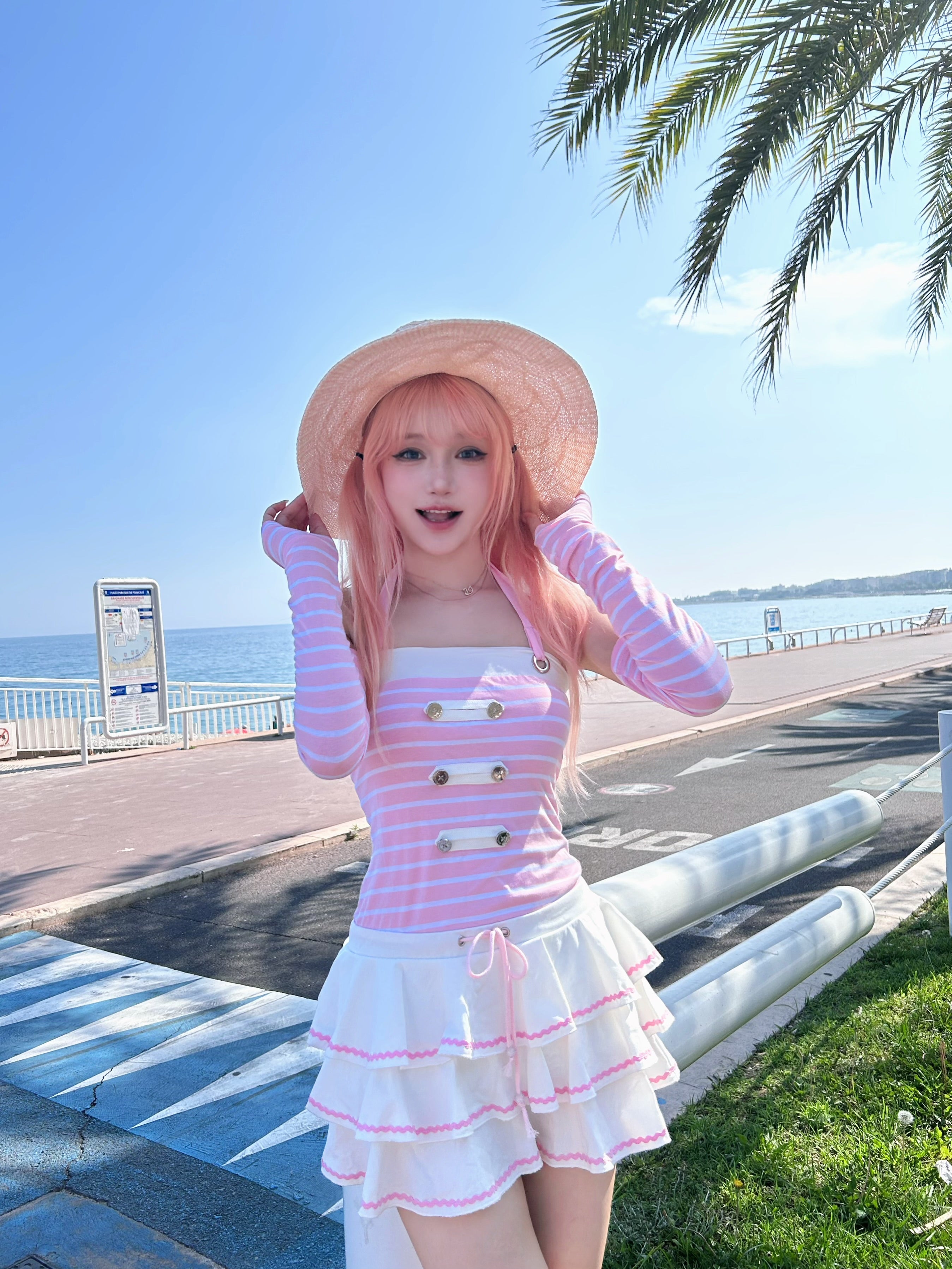 Set sail on a pastel voyage with this iconic Evil Tooth halter dress—where sweet sailor charm meets a touch of 地雷 (jiraikei) moodiness. Featuring a faux two-piece design, this all-in-one look includes a striped, figure-hugging halter top, double sailor button rows, and a flouncy layered mini skirt, tied up with a dainty bow. Complete with removable matching arm sleeves for customizable styling, this outfit brings maximum impact from boardwalk to boulevard.