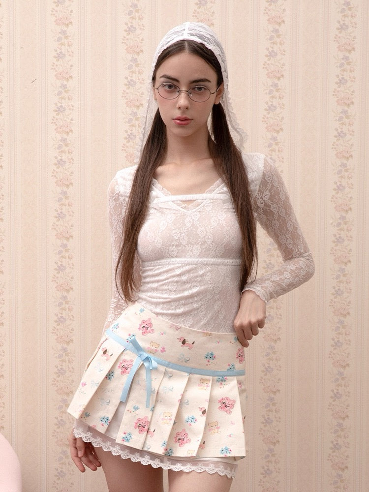 This dreamy outfit is made for soft mornings and vintage hearts. The delicate lace hoodie top is light as a whisper, featuring ribbon bow accents and a romantic hood that gives a fairytale touch. Paired with a pleated cream skirt decorated with nostalgic pastel animals and tiny flowers, this look is straight out of a dollhouse.