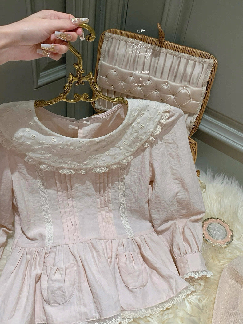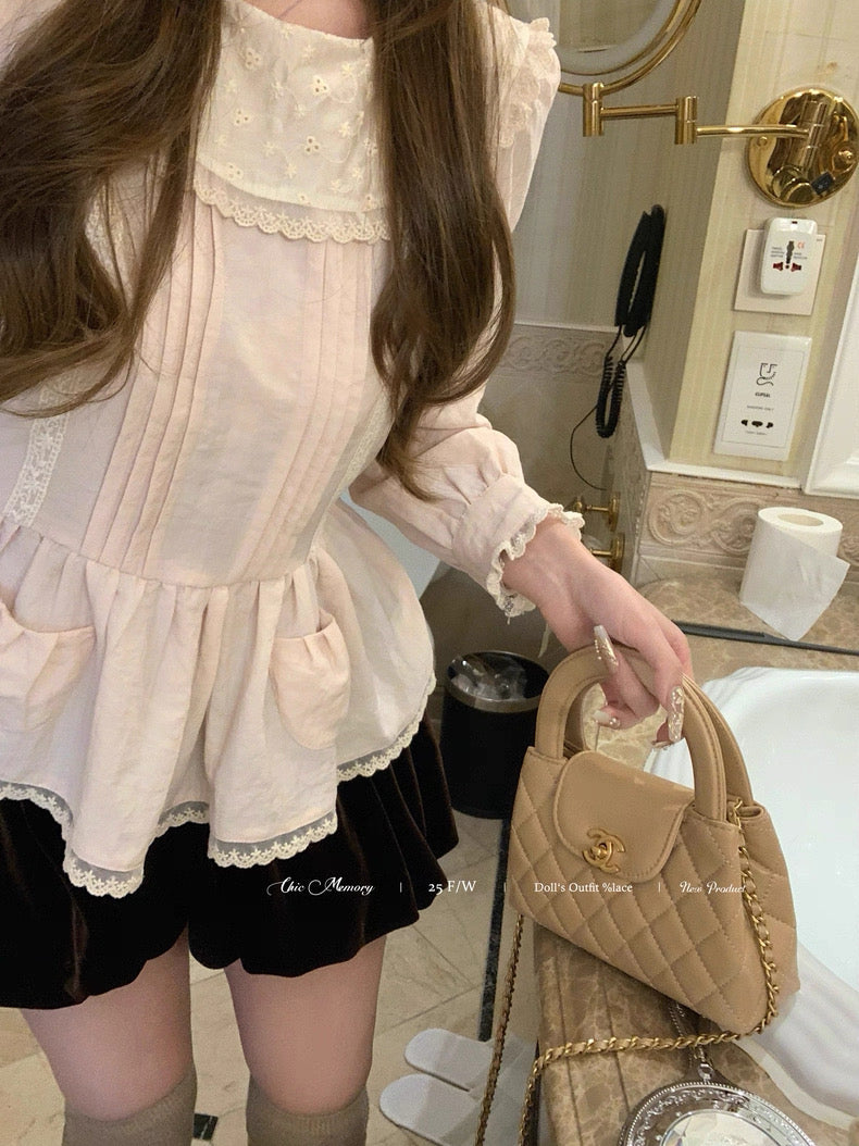 The delicate embroidered lace collar and tiny gathered pockets add a doll-like charm — perfect for your coquette or soft girl wardrobe.