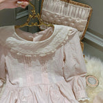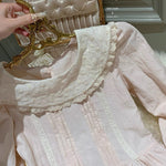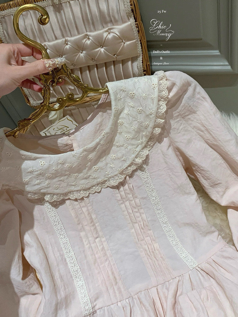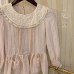 Design highlights: embroidered lace collar, puff sleeves, double pockets, soft gathered hem