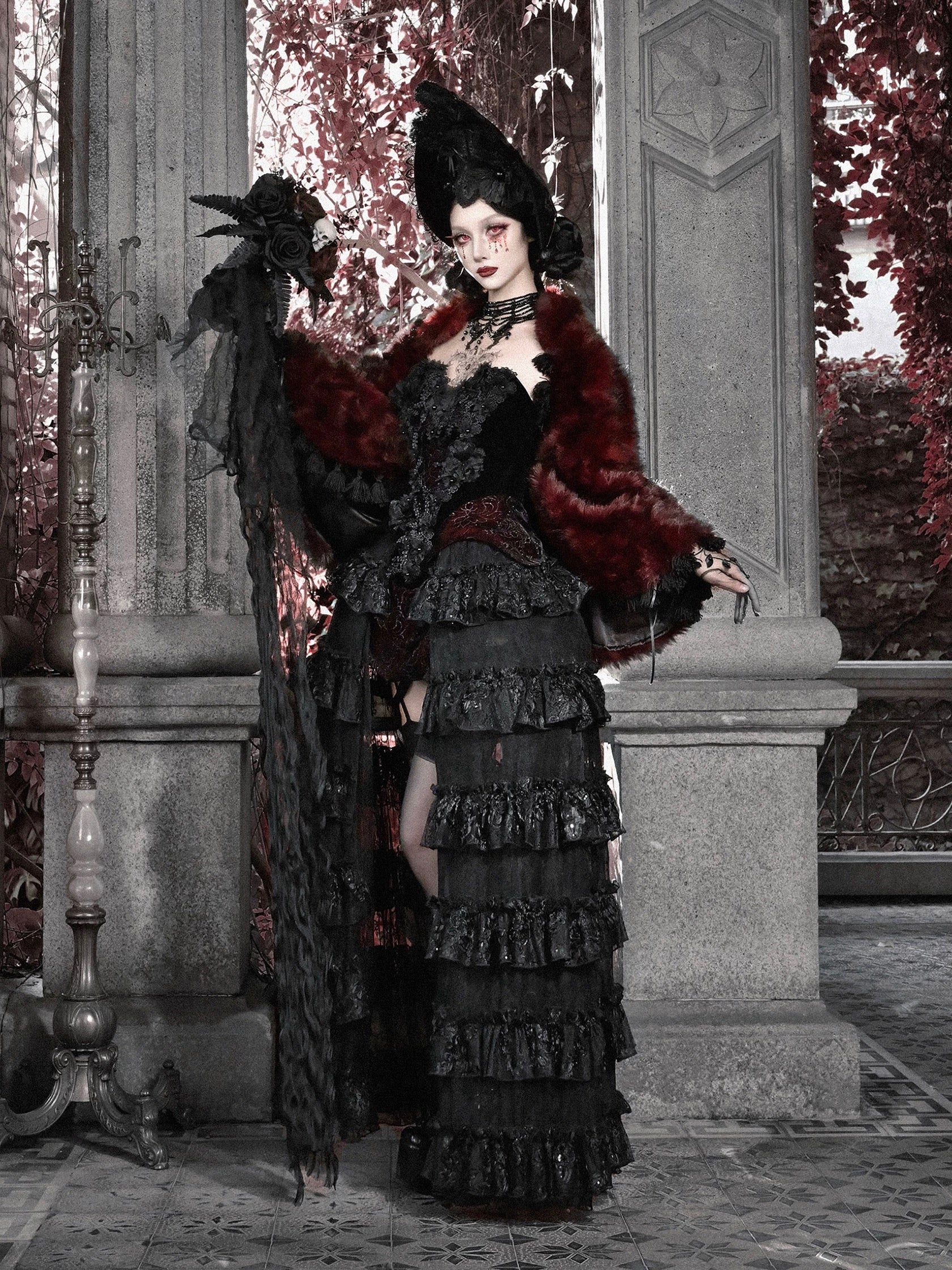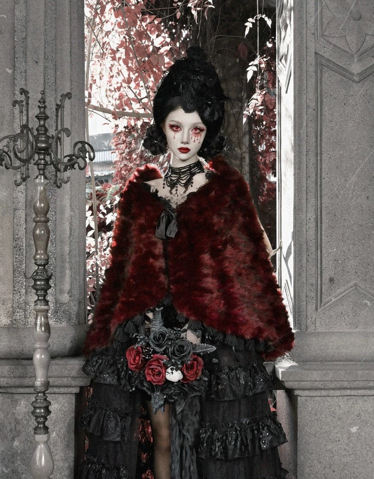 The Crimson Ritual Fur Cape draws inspiration from Gothic vampire tales and baroque romanticism.