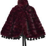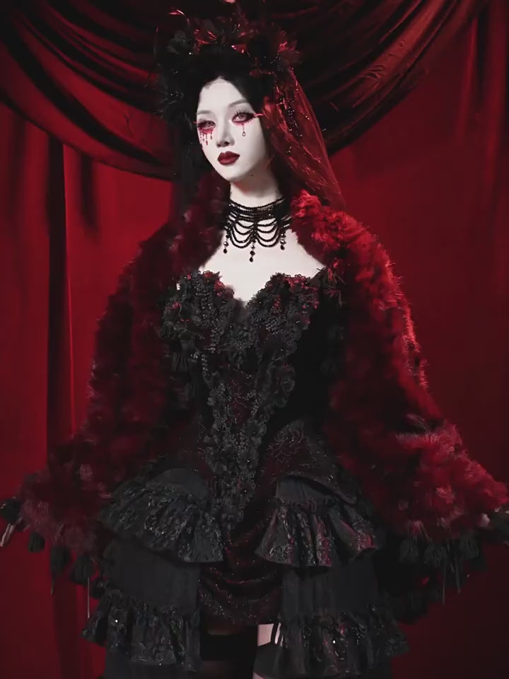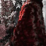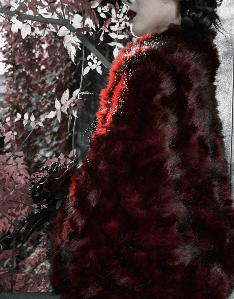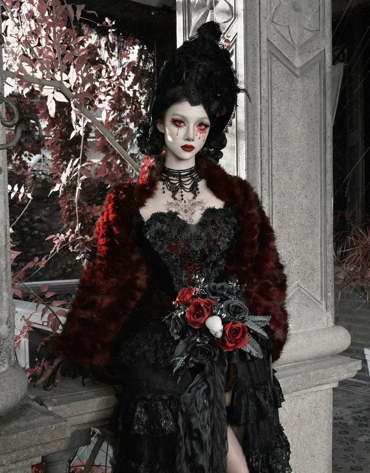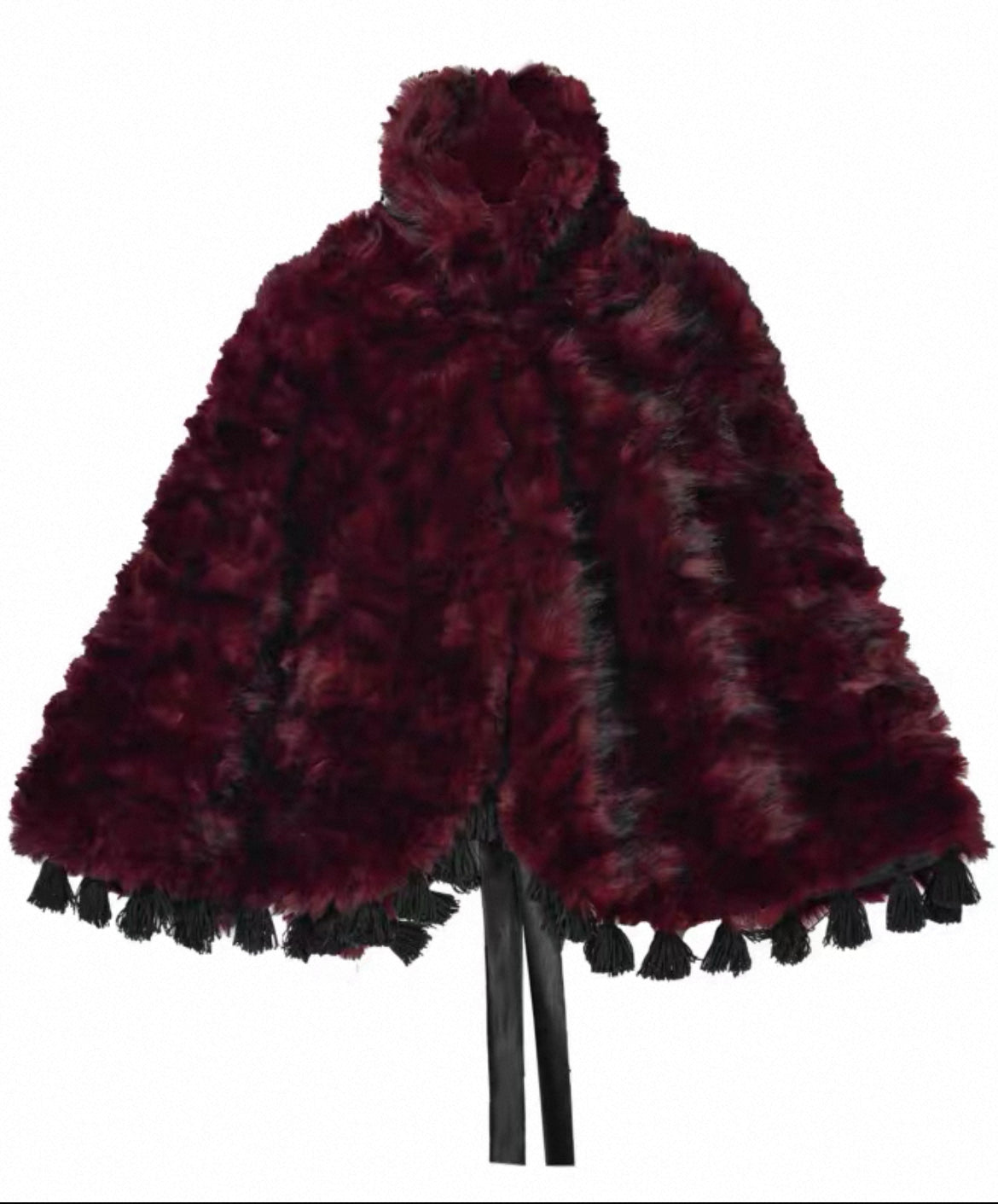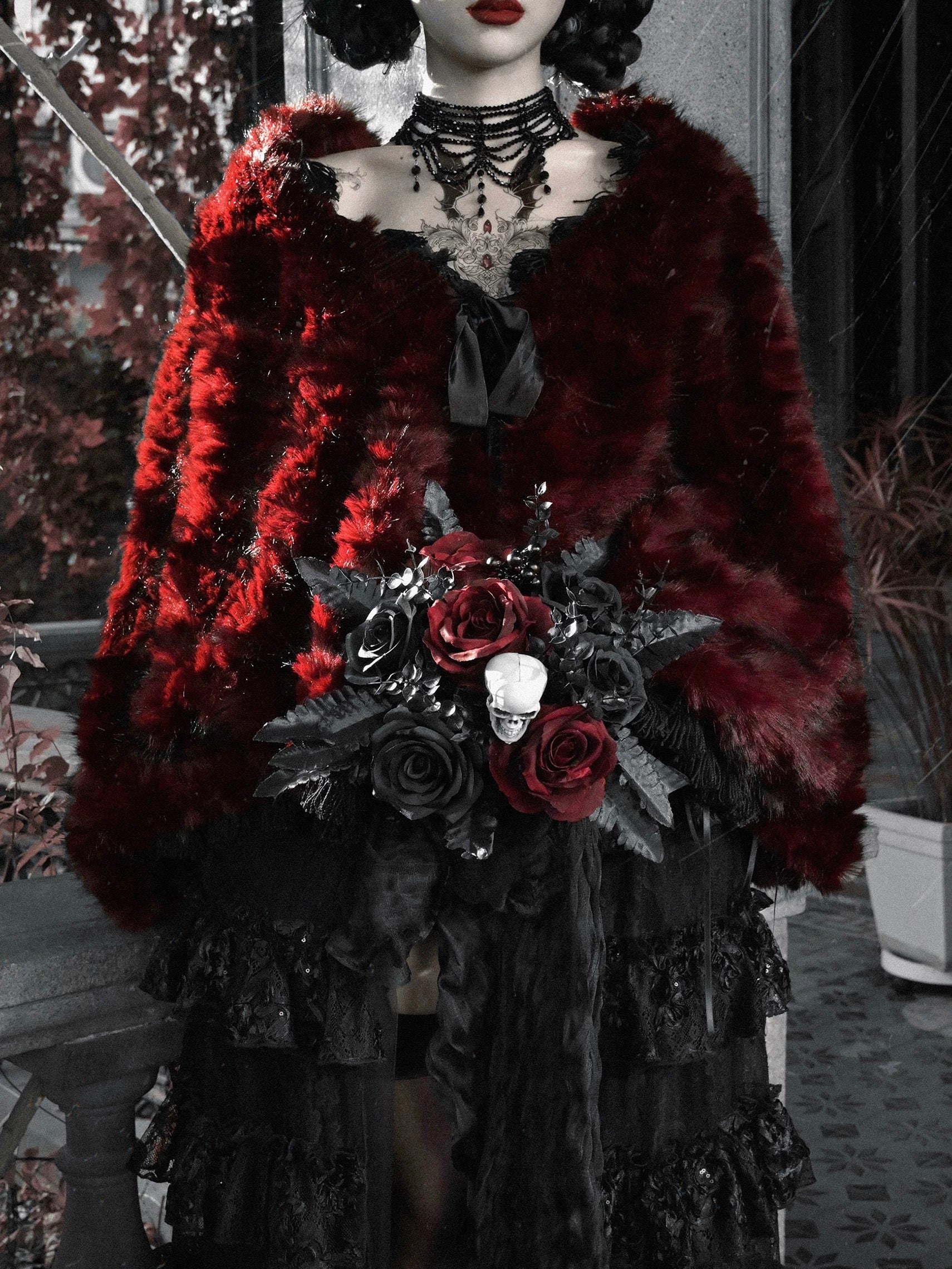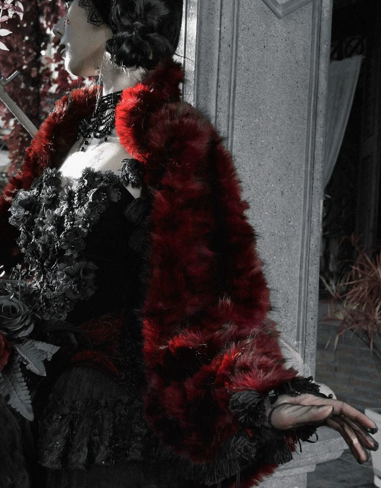 Its rich wine-red faux fur recreates the shade of blood roses, while black tassel edges and a satin ribbon tie embody the elegance of midnight ceremonies.