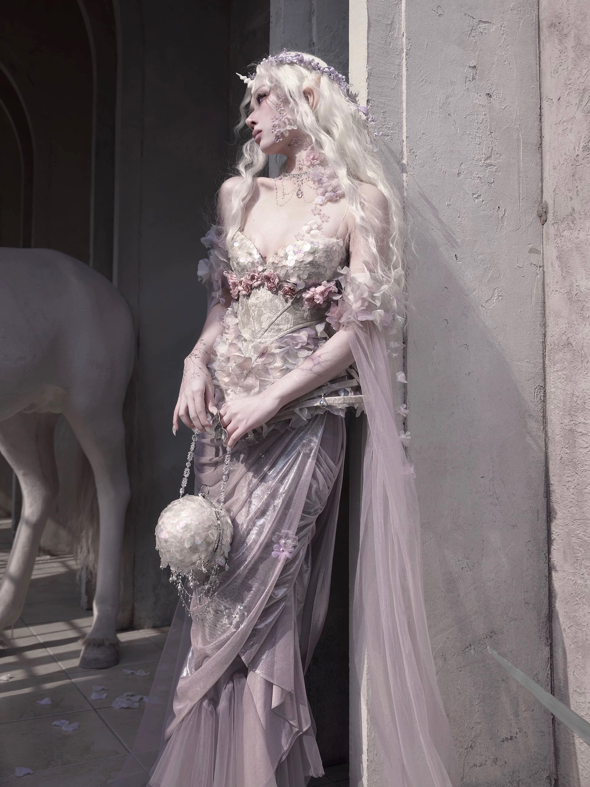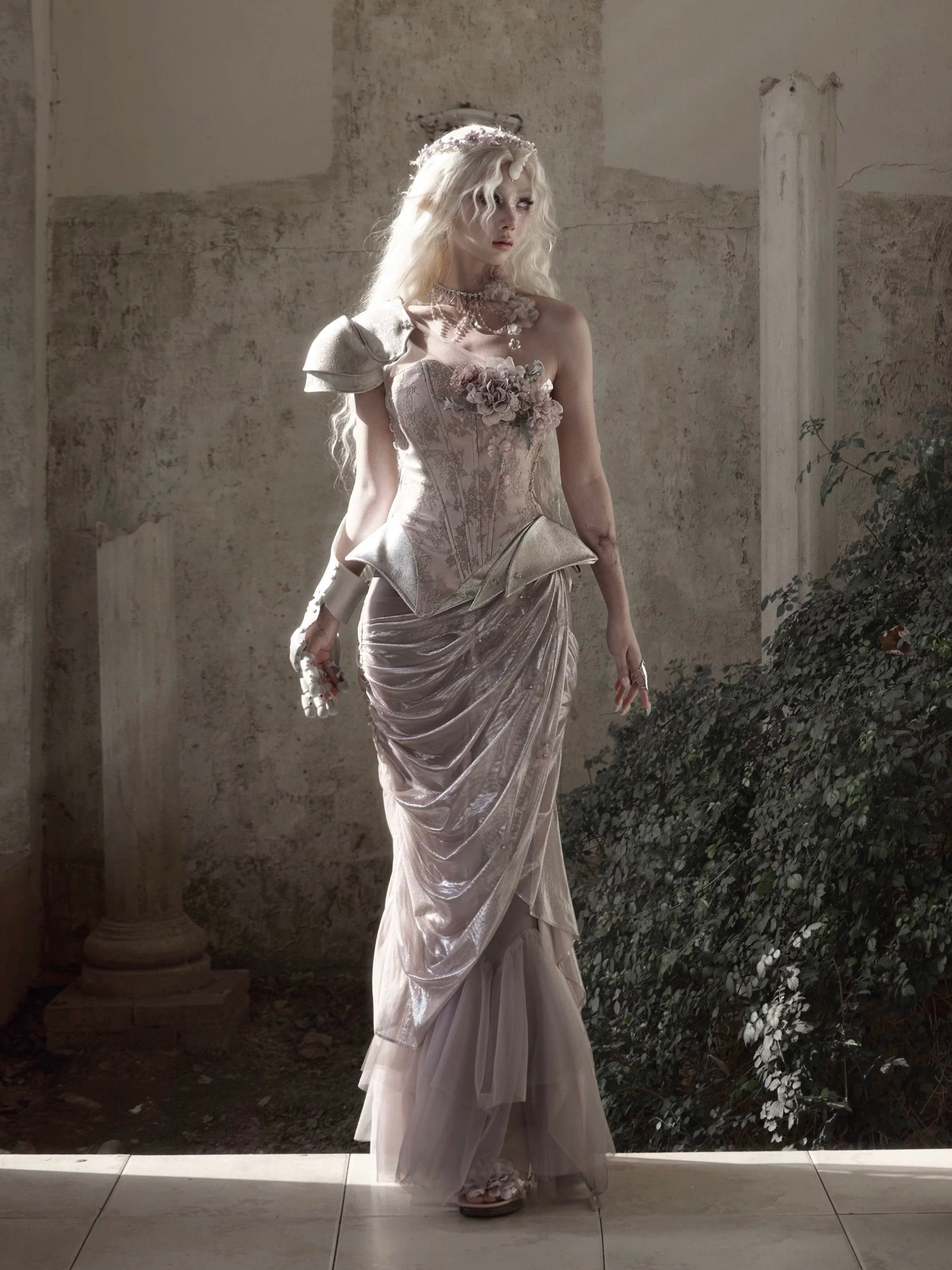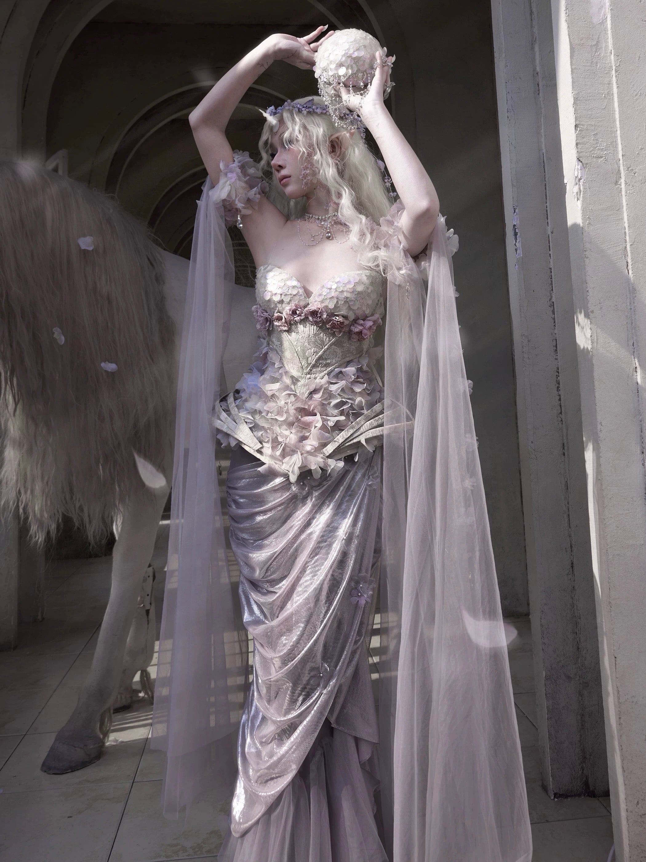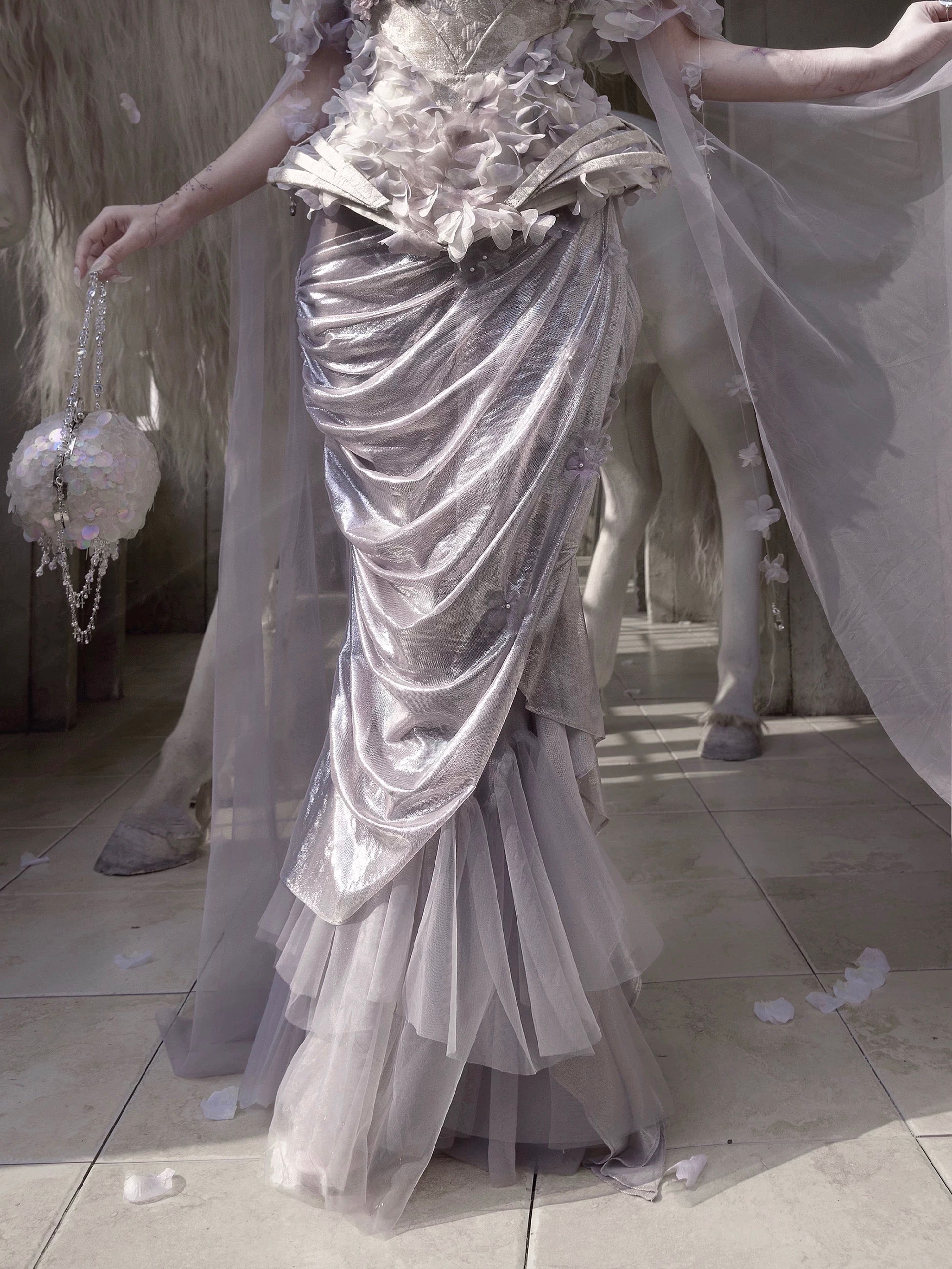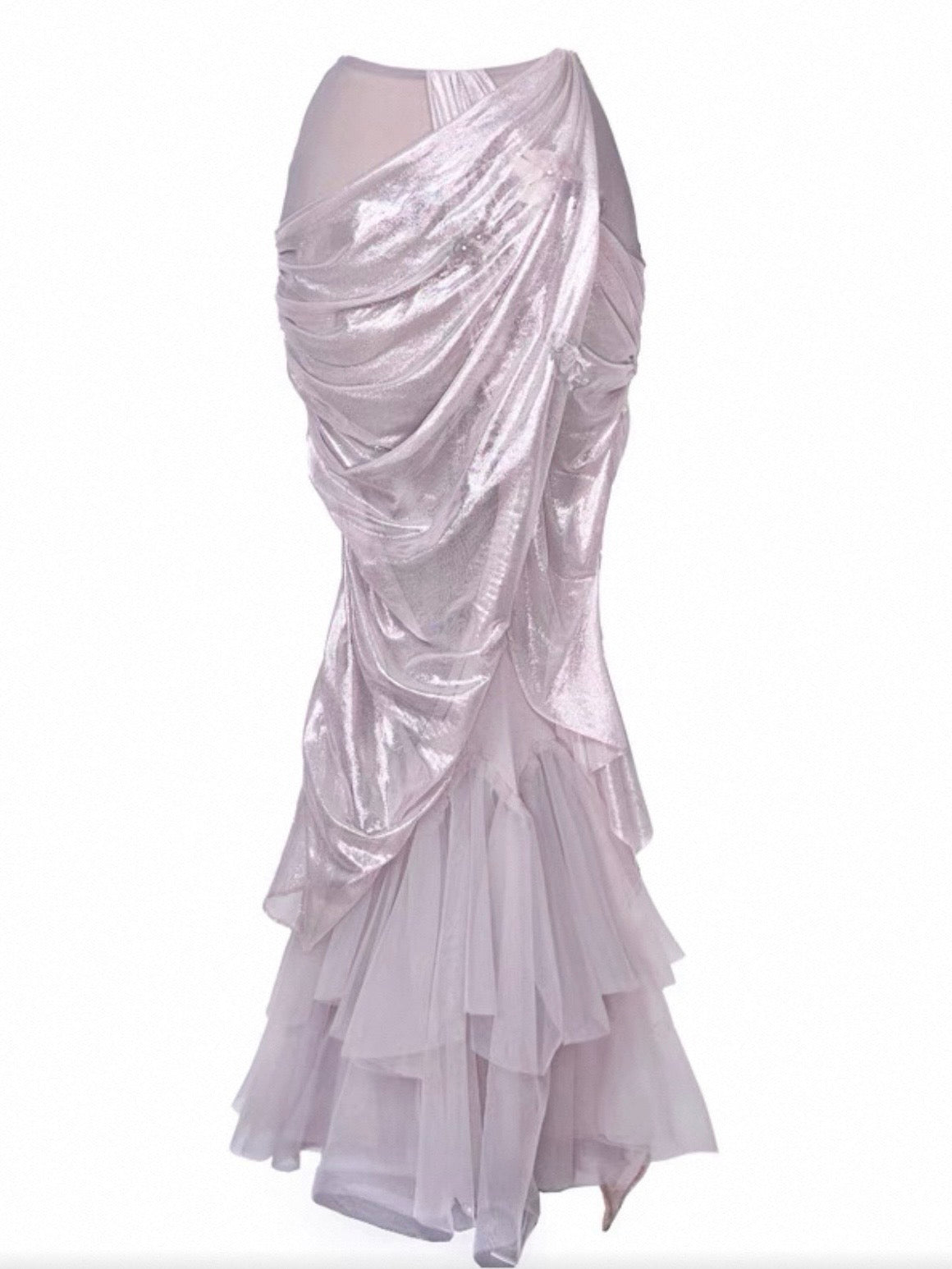 Soft draped metallic fabric creates a gentle mermaid silhouette, while layers of airy tulle add lightness and movement.