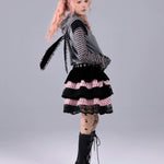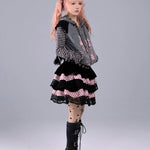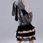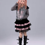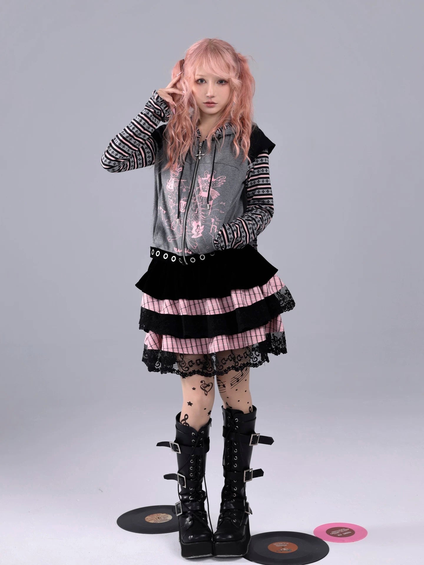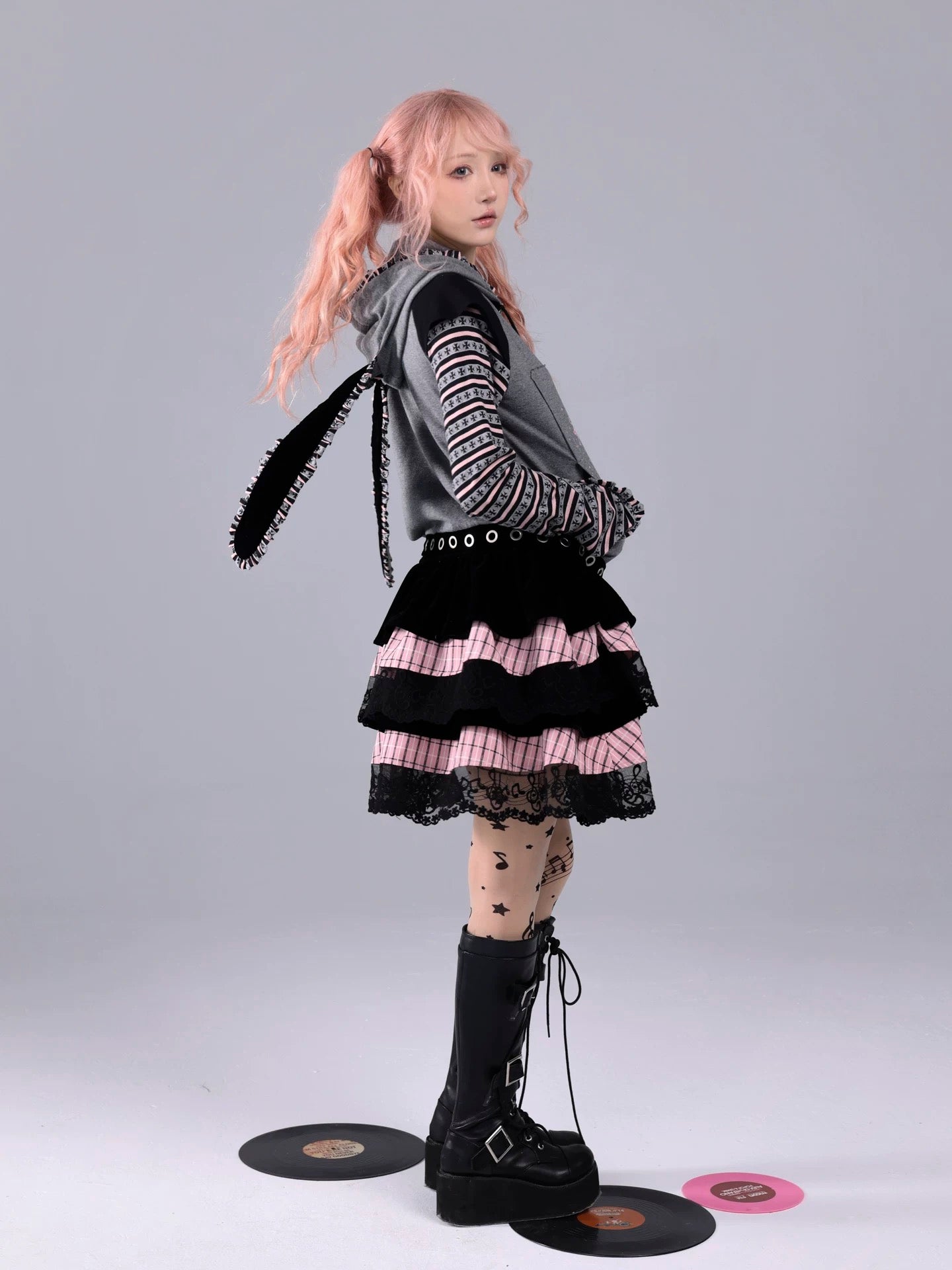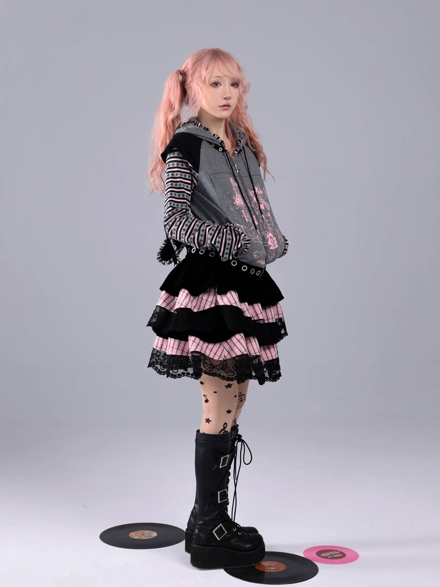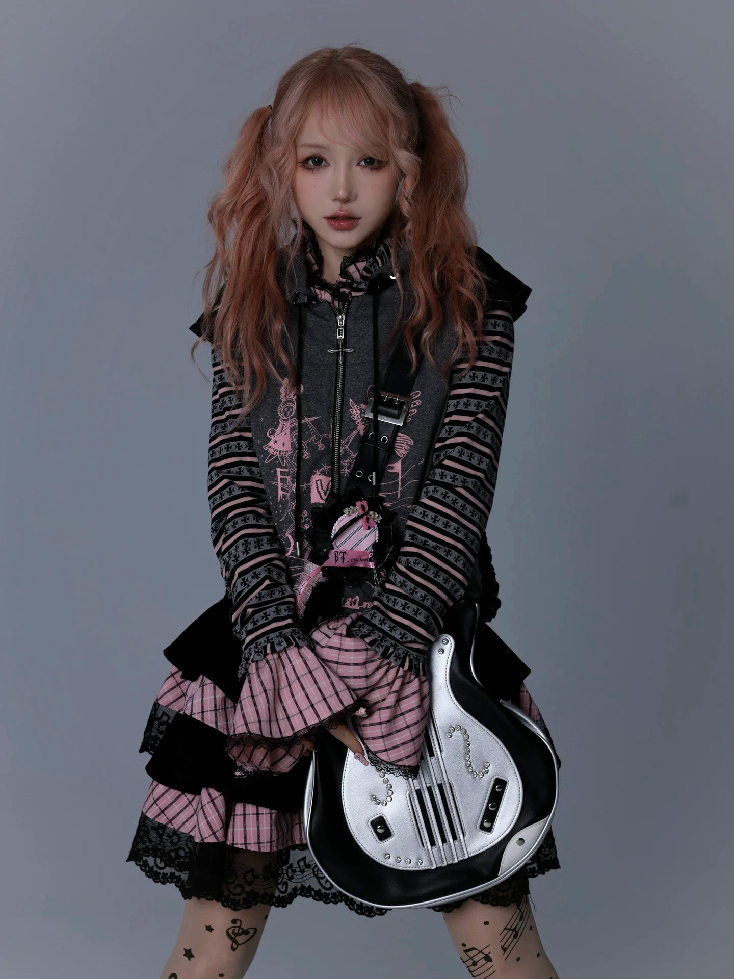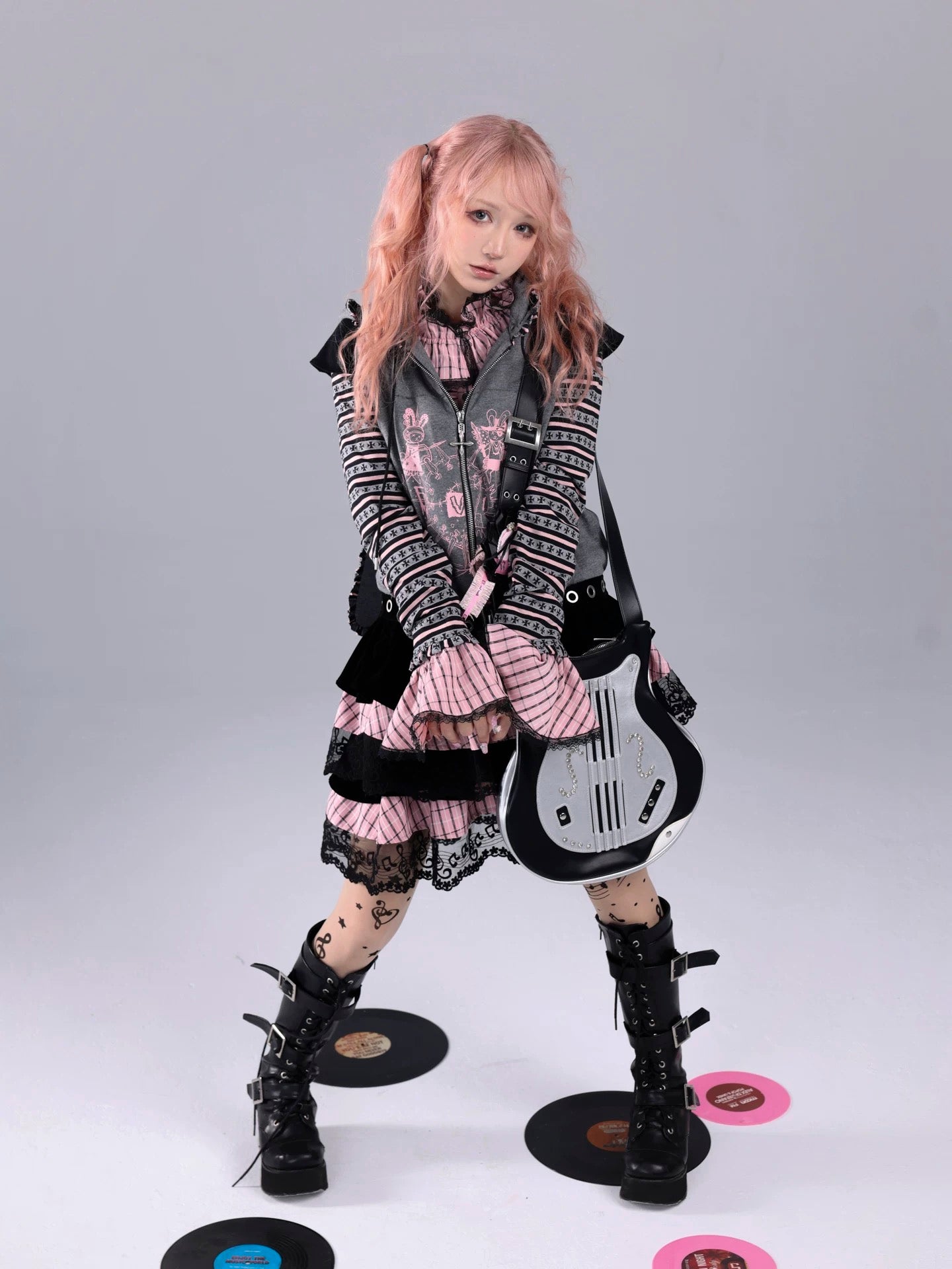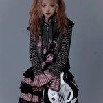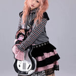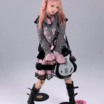 The striped long sleeves give a fake-layered look, adding extra visual rhythm — almost like a stage outfit for a punk idol unit. The front zipper and metal eyelets along the waist add a rock-band mood, making it perfect for concerts, street snaps, and dark cute styling.