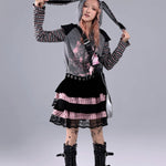 ストライプ柄のロングスリーブは重ね着風で、まるでパンク系アイドルのステージ衣装のようなリズム感。フロントジップやウエストのハトメがロックバンドらしさをプラスし、ライブ、撮影、原宿ストリートにもぴったりです。