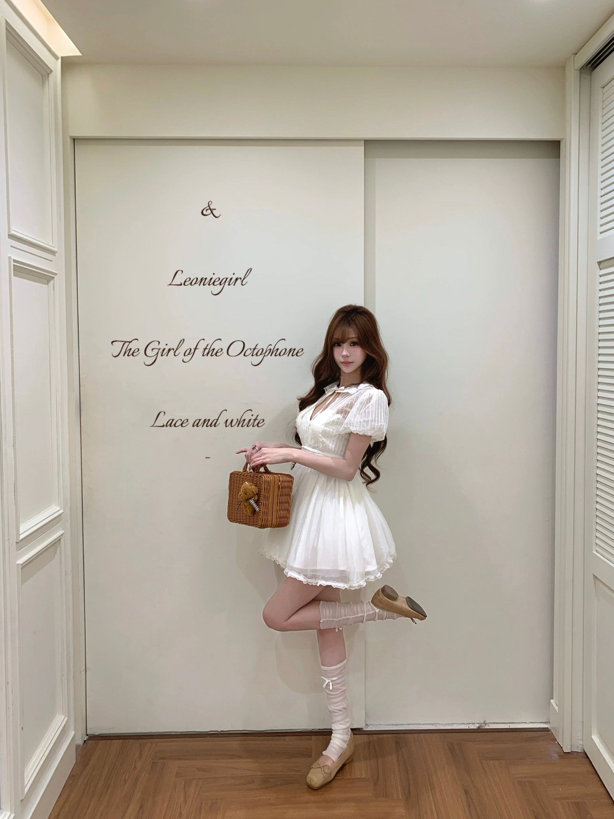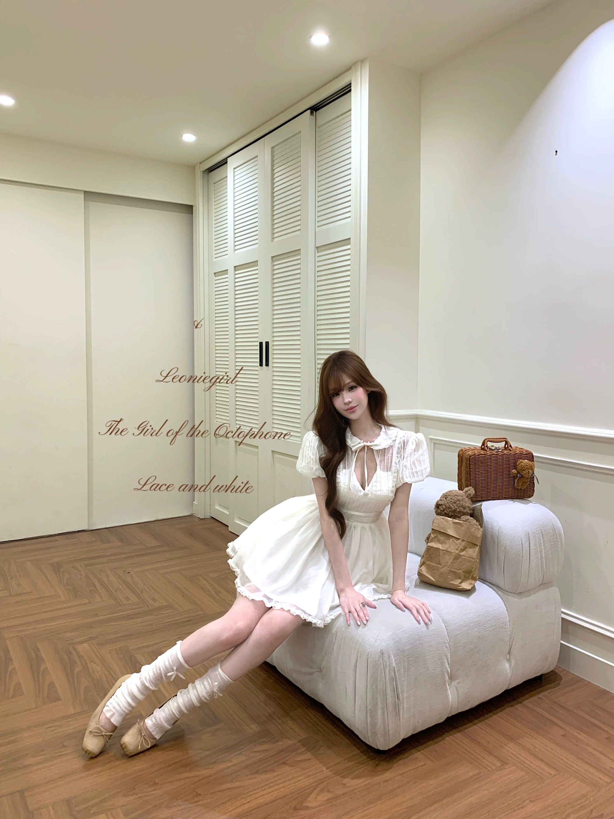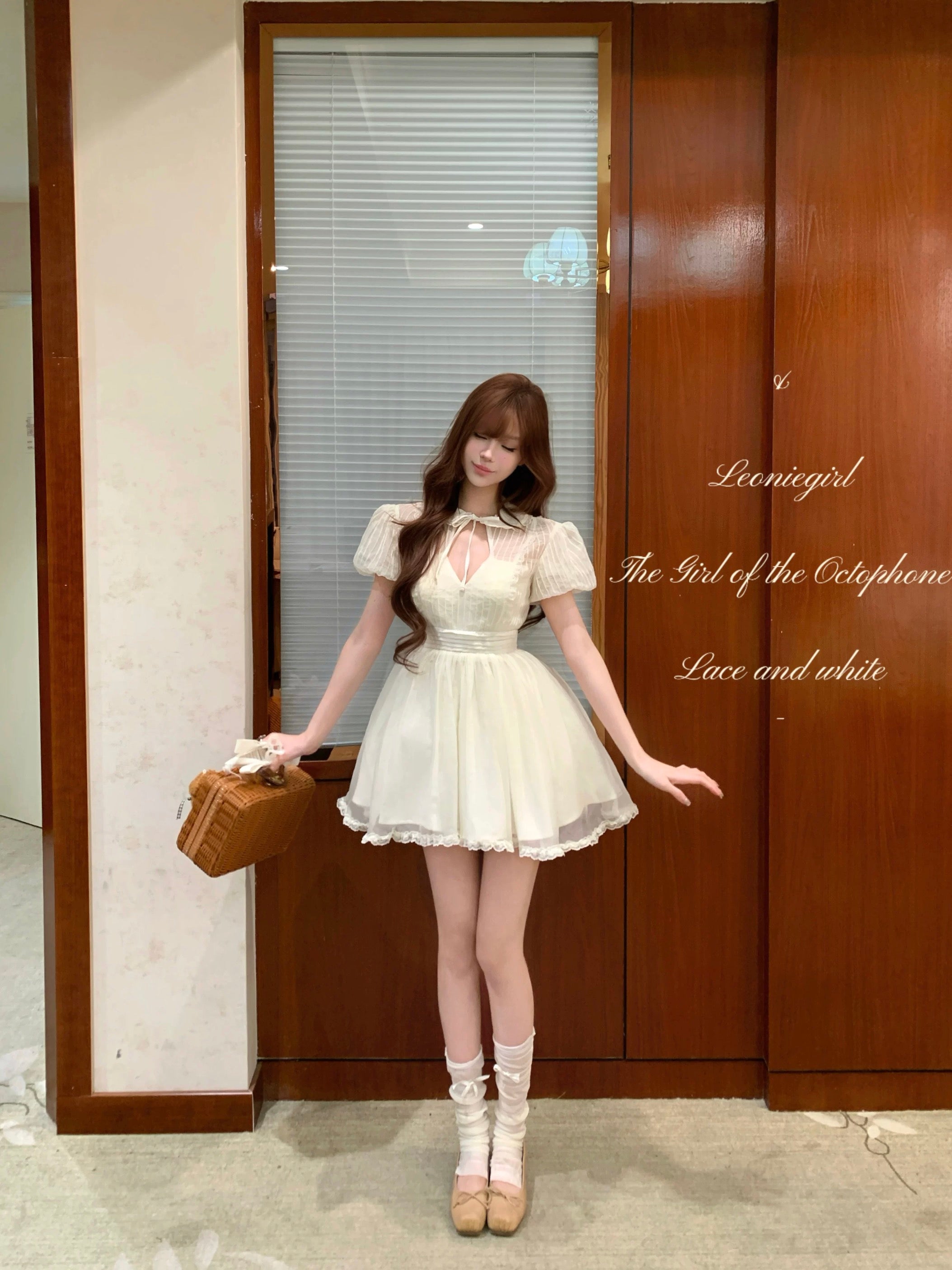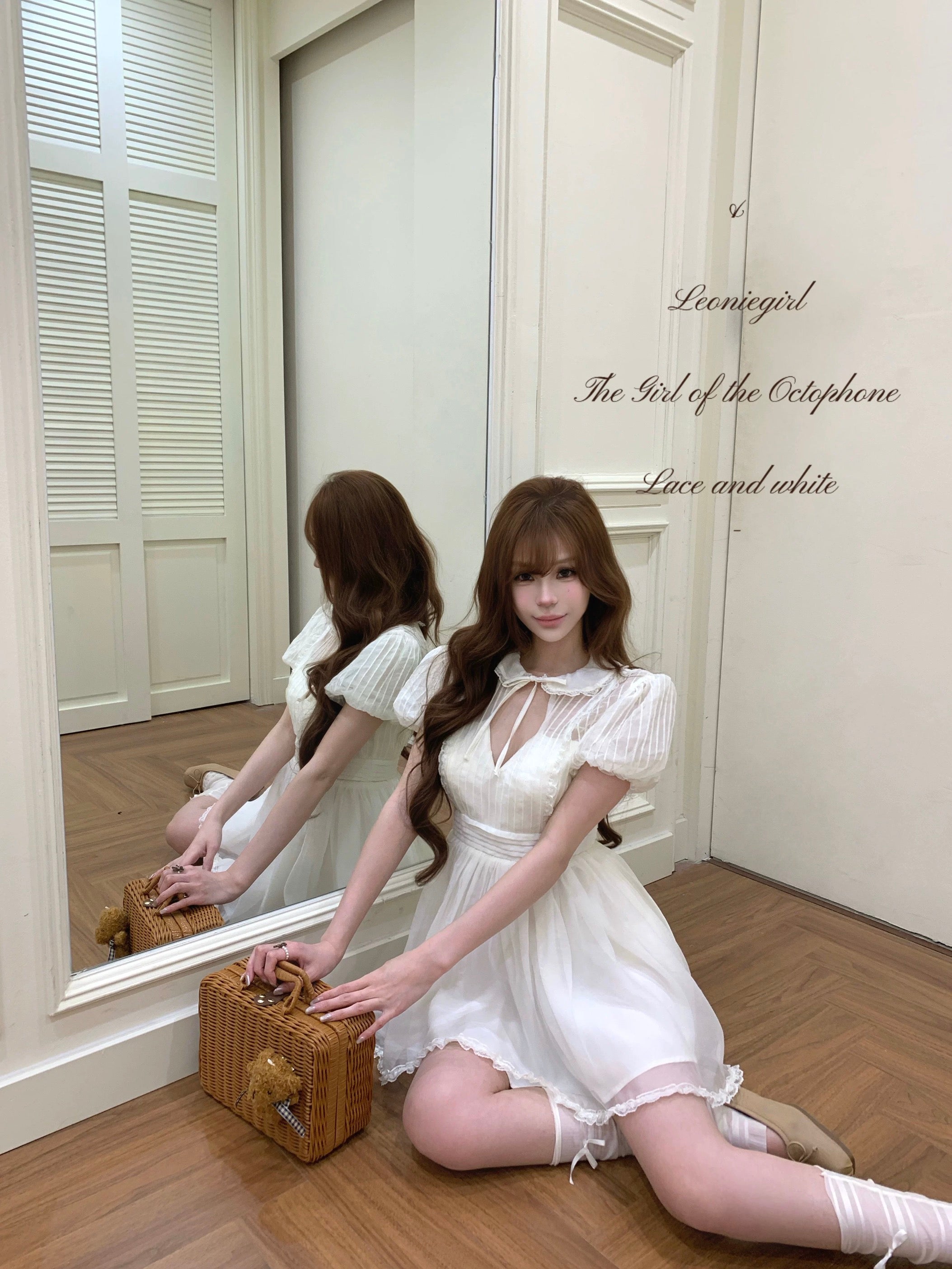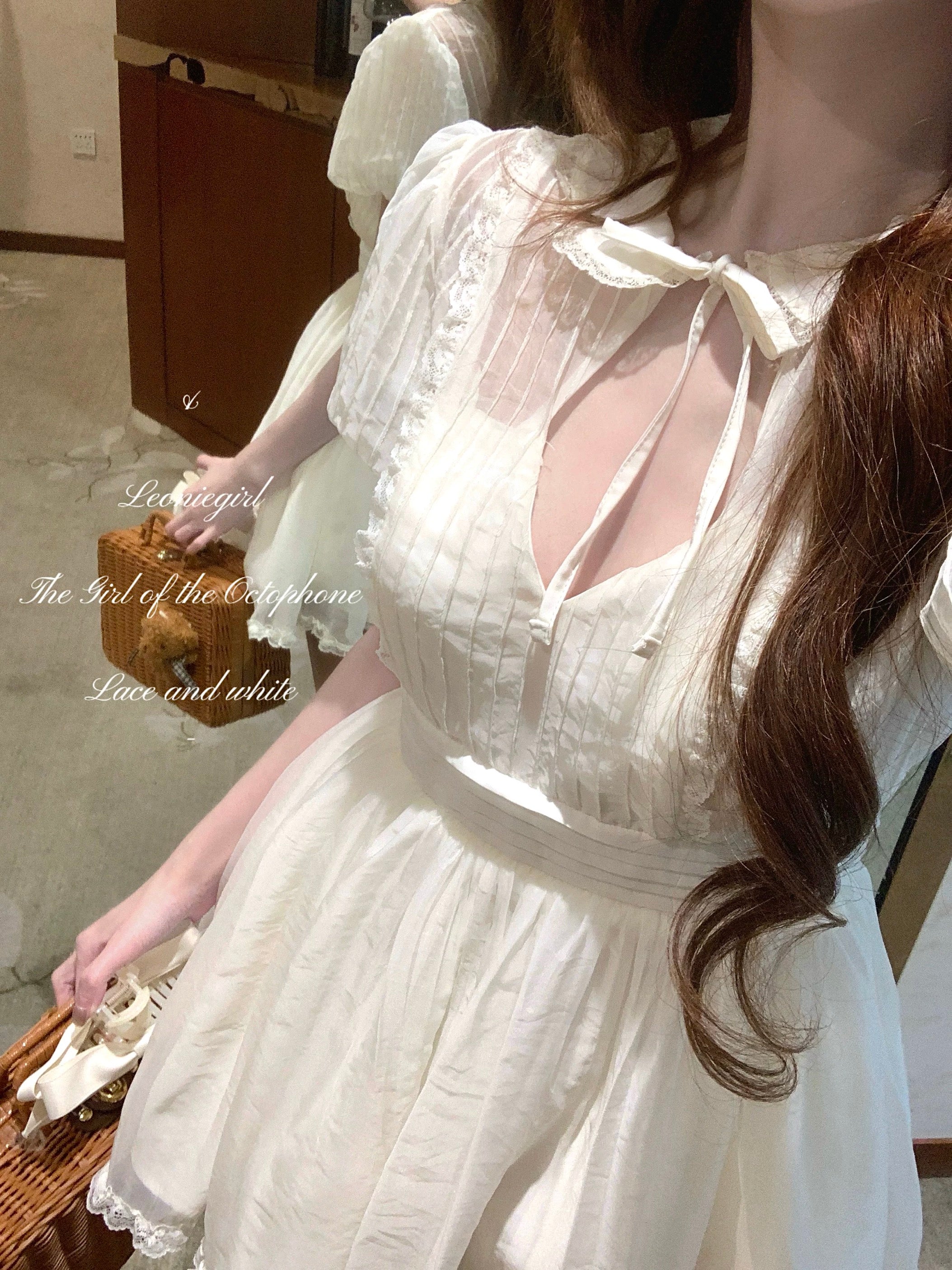The neckline features a subtle cut-out design paired with a sweet Peter Pan collar and ribbon bow, creating a gentle doll-like silhouette. The puff sleeves add volume and softness, while the structured tuck pleats shape the waist beautifully.