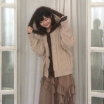 The oversized silhouette and gently puffed sleeves offer a relaxed and comfortable fit, while the textured cable pattern adds a vintage charm.