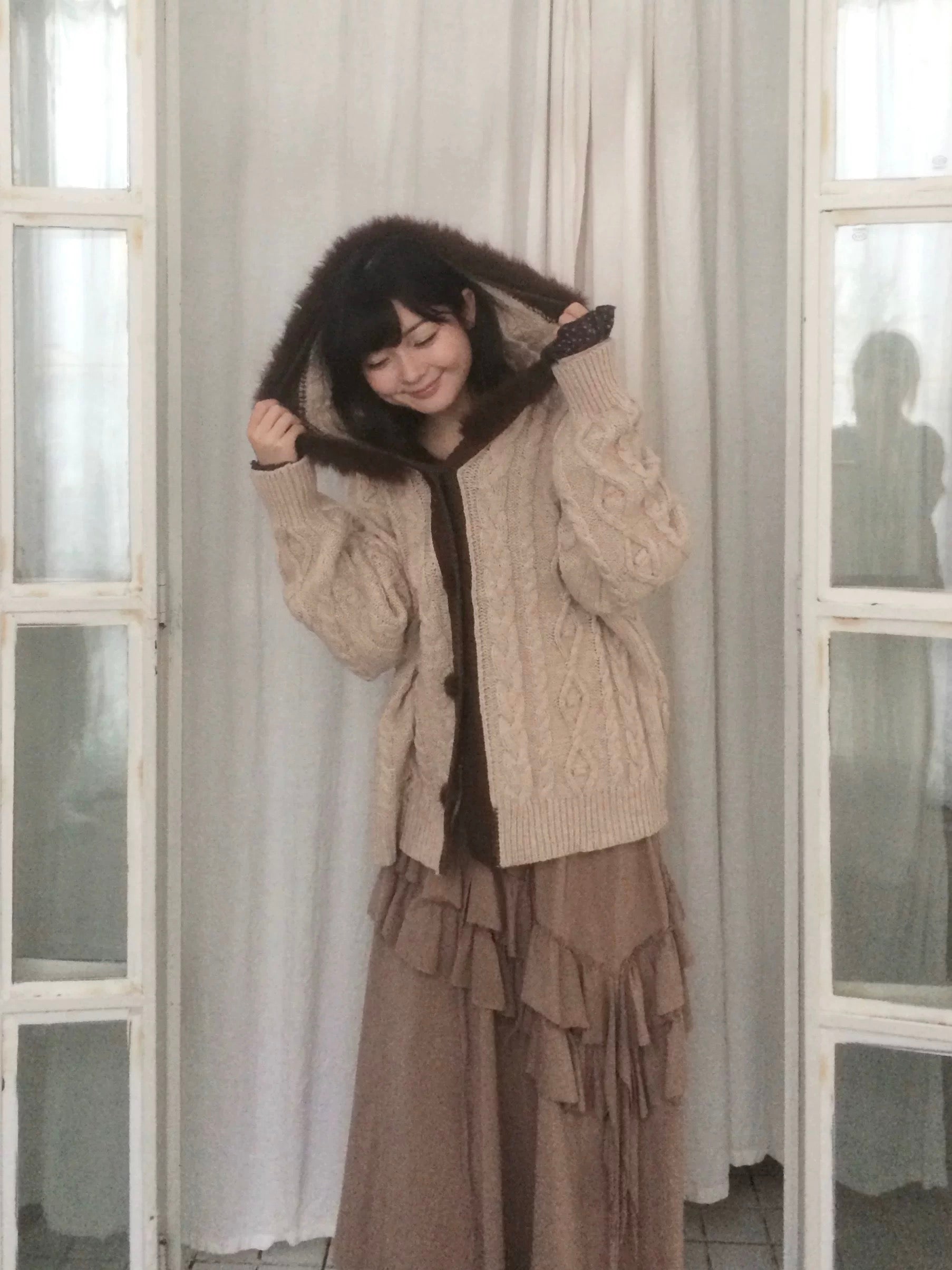 The hood and button placket are trimmed with soft curly faux-fur, giving the cardigan a cozy winter feel and a touch of woodland sweetness.