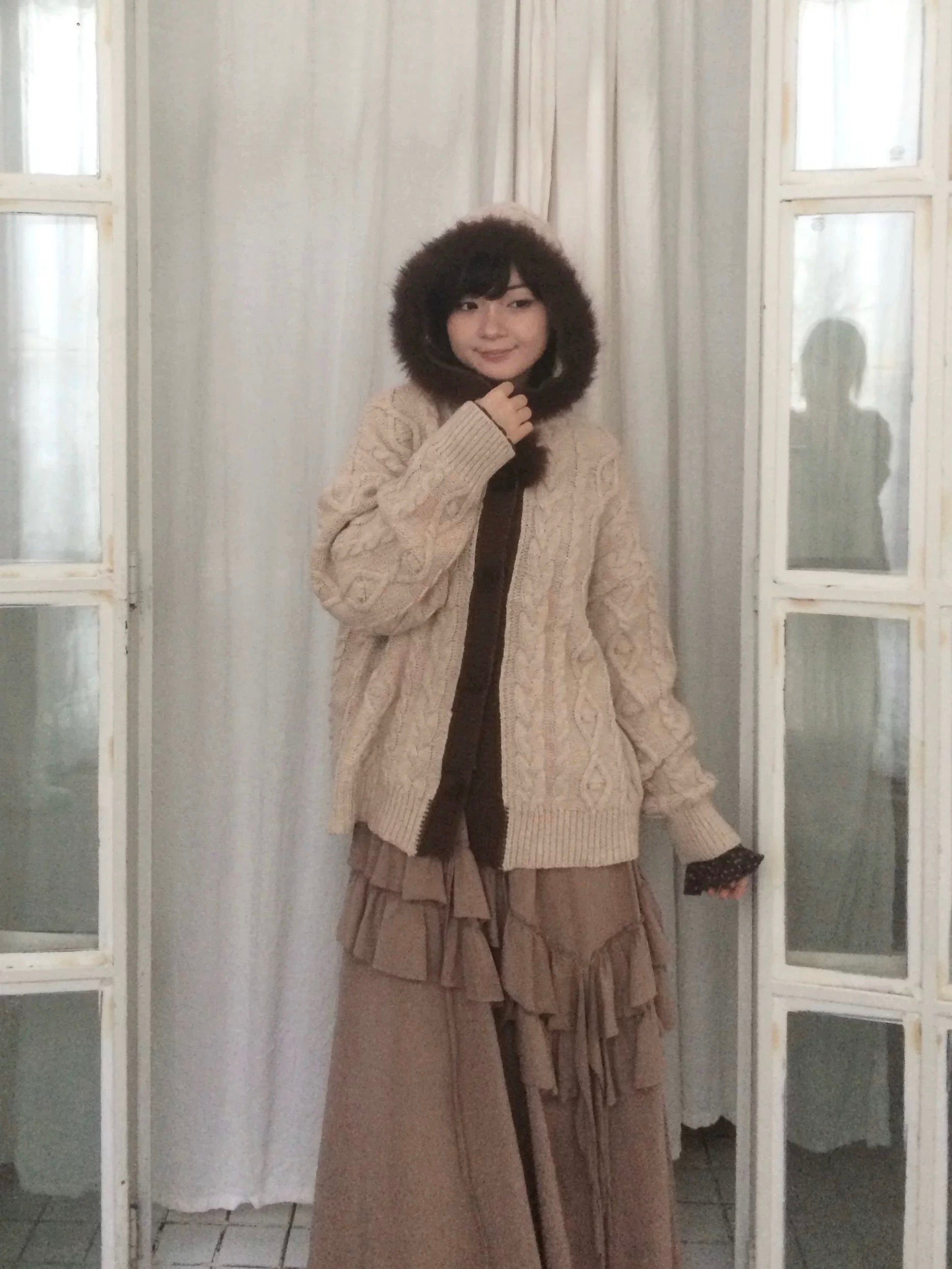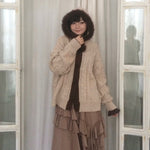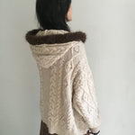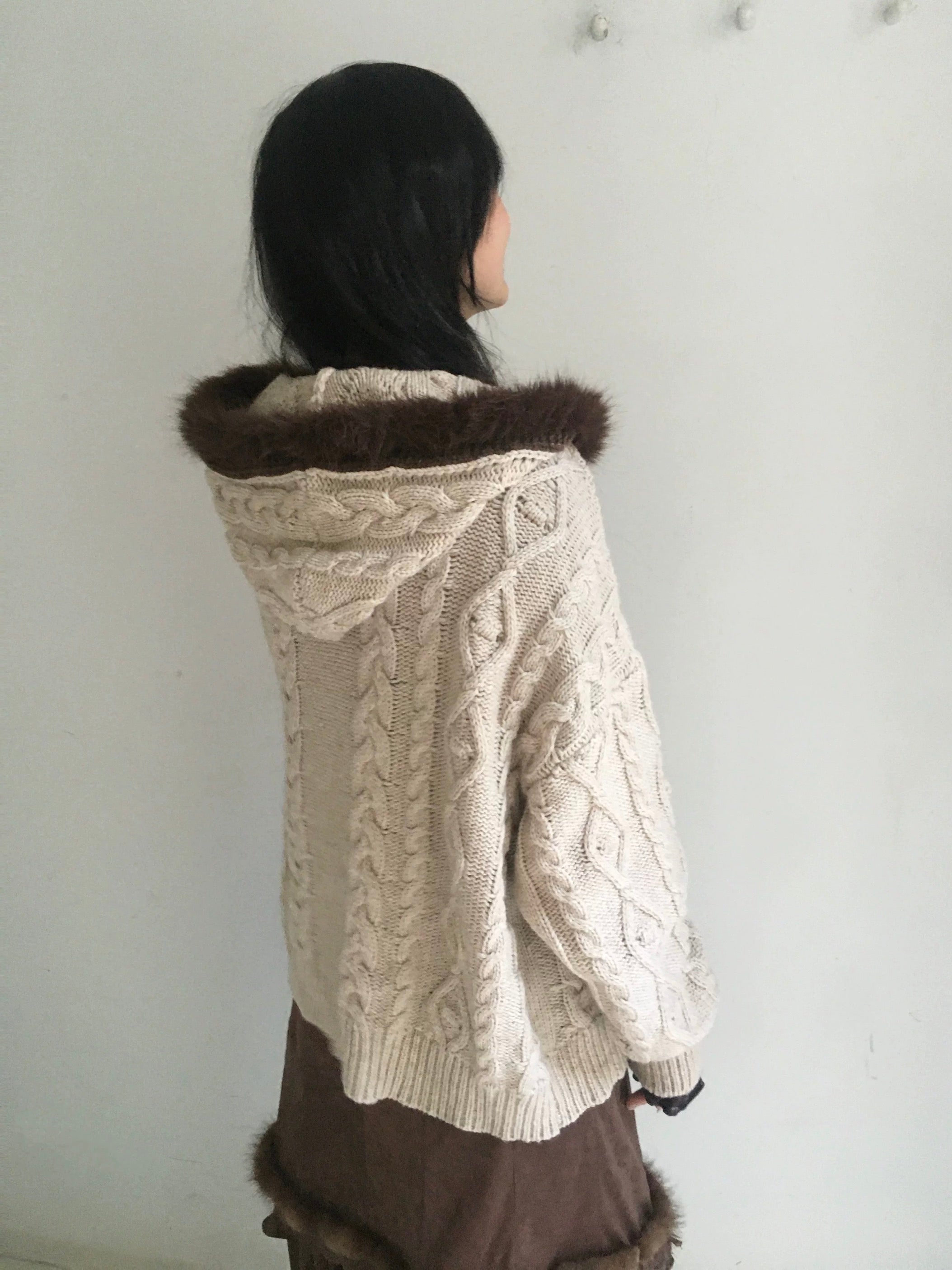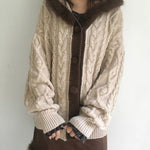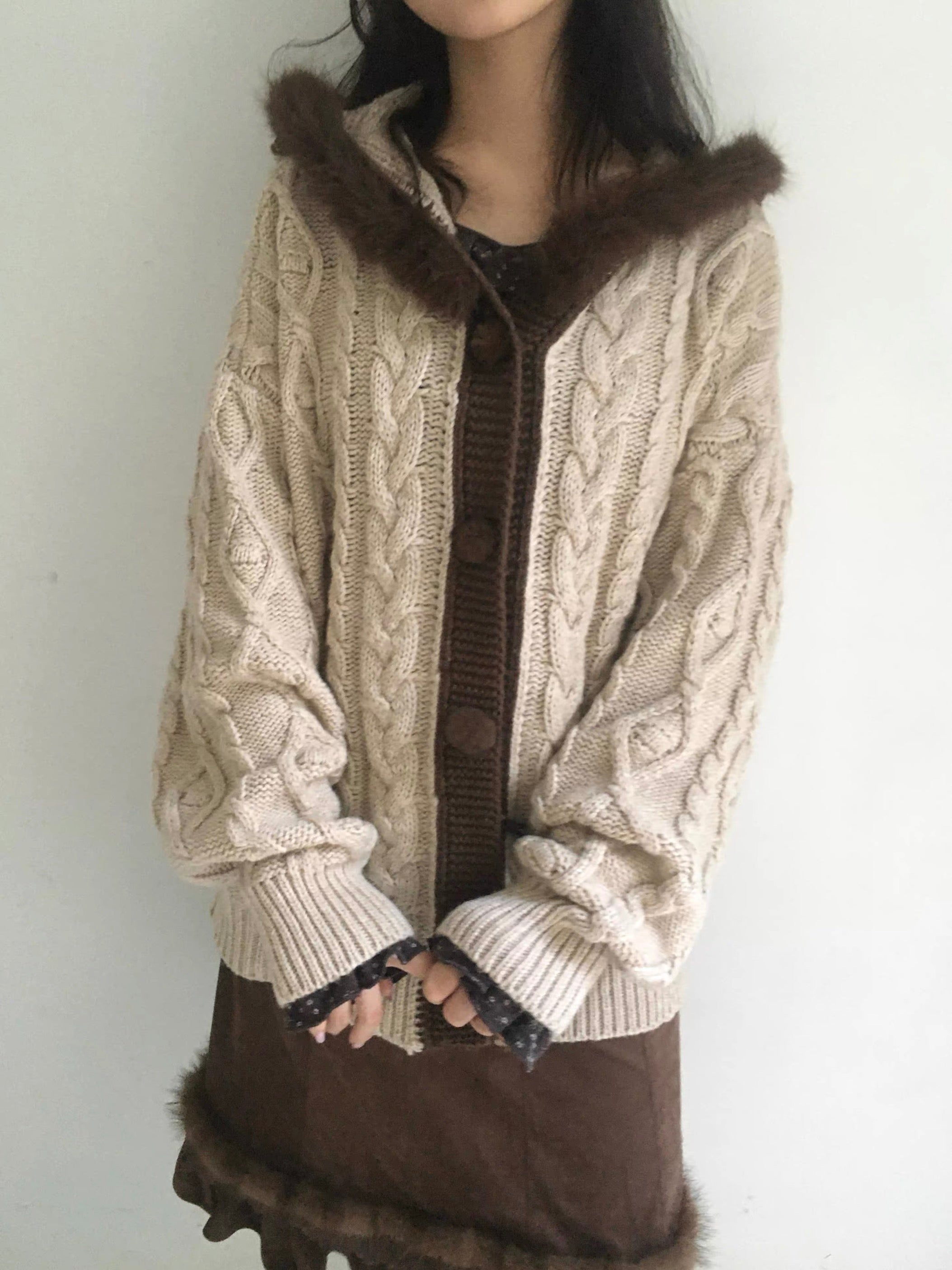 A warm and vintage knit cardigan designed in a soft almond tone, paired with a plush faux-fur trim along the hood and placket.