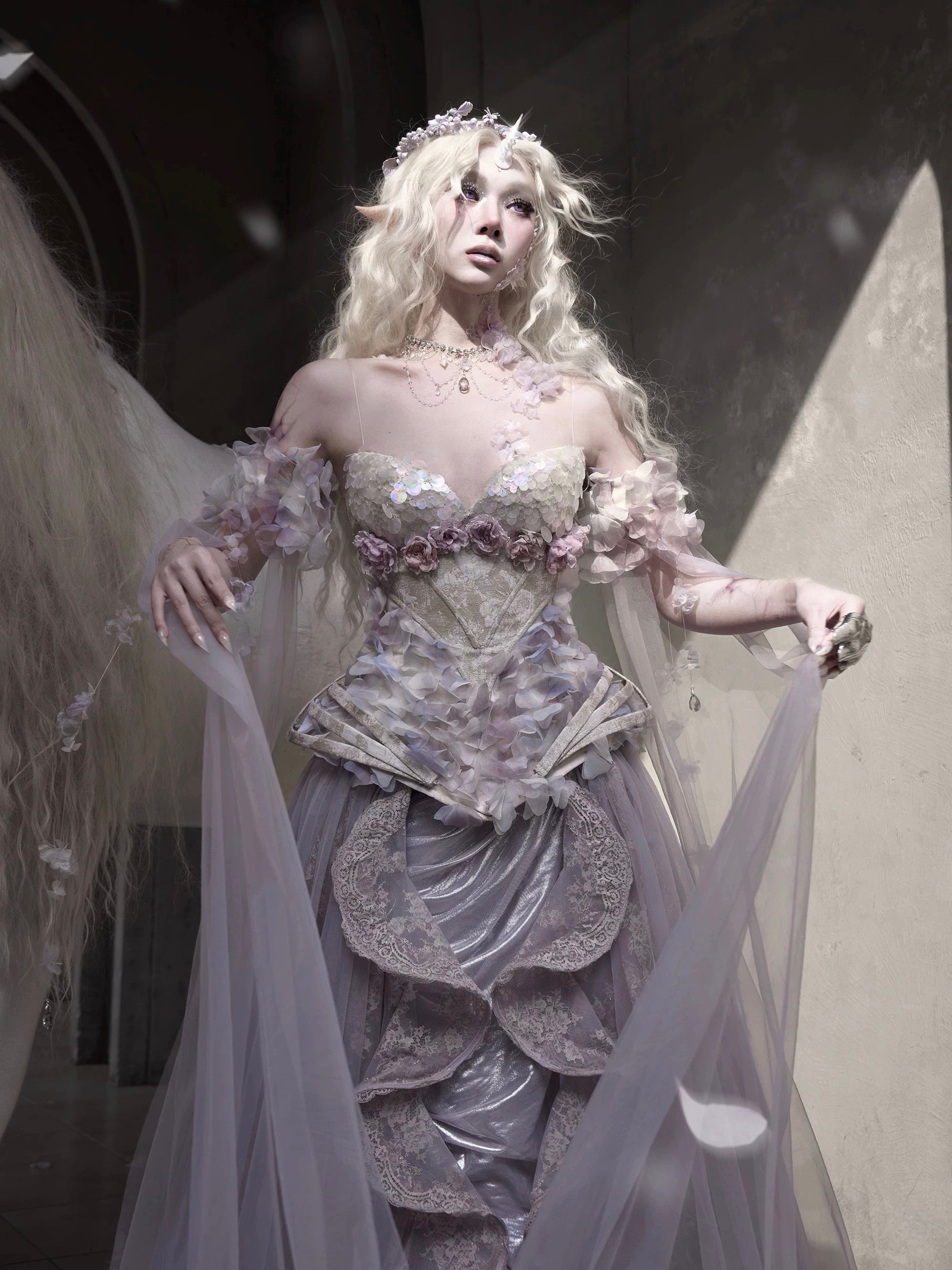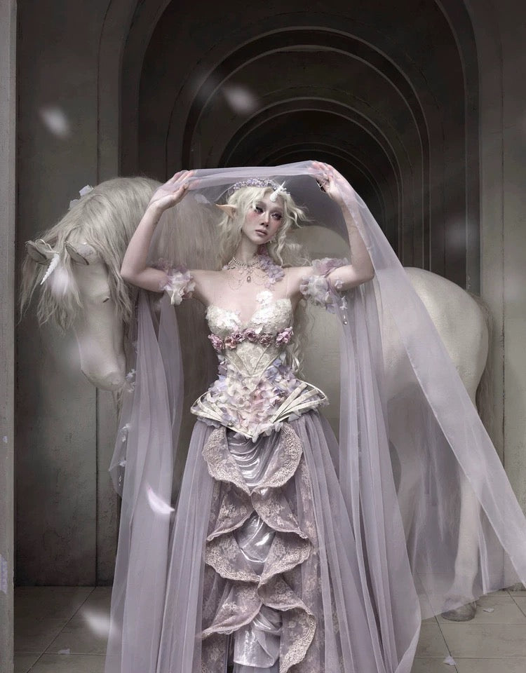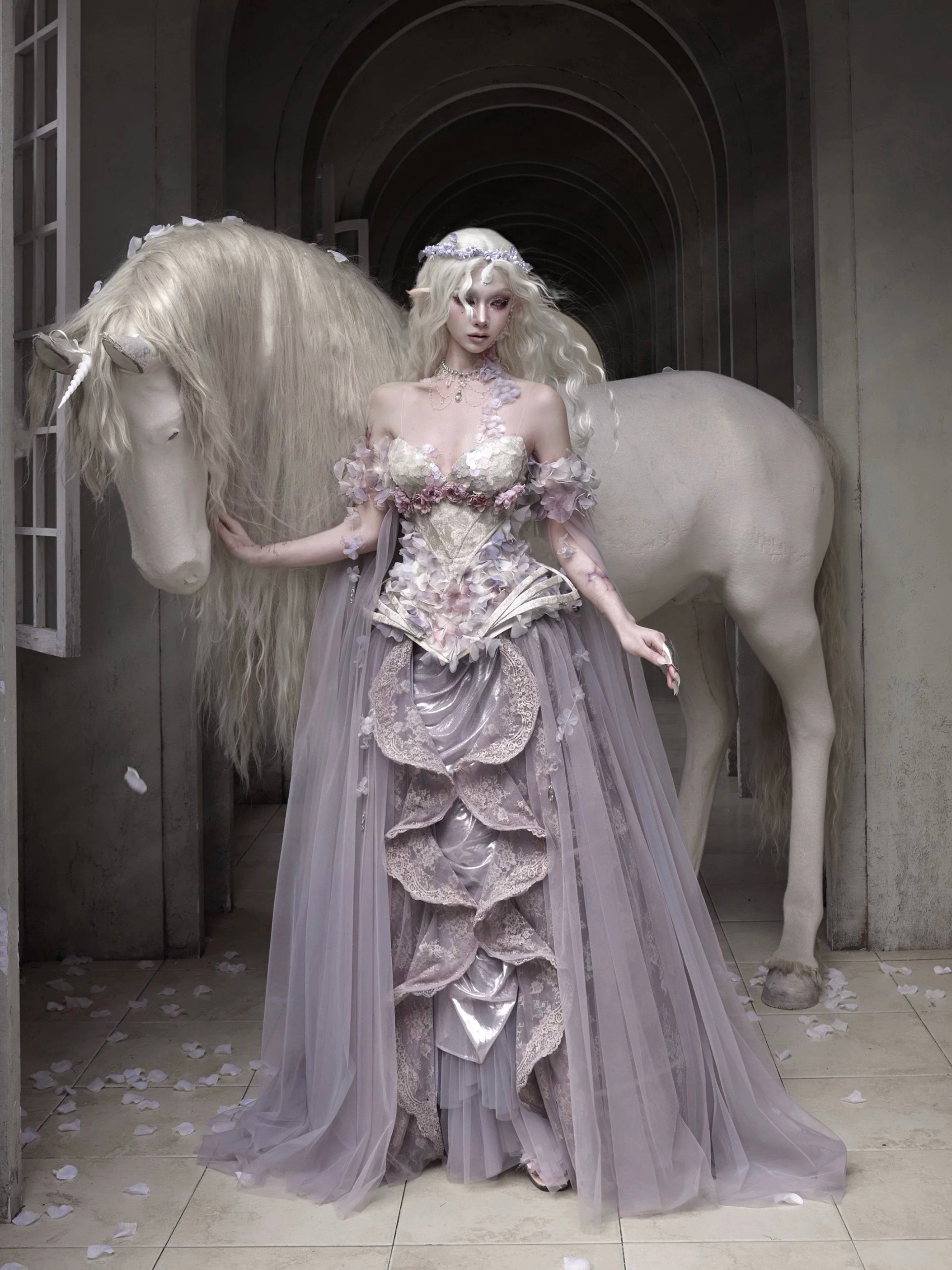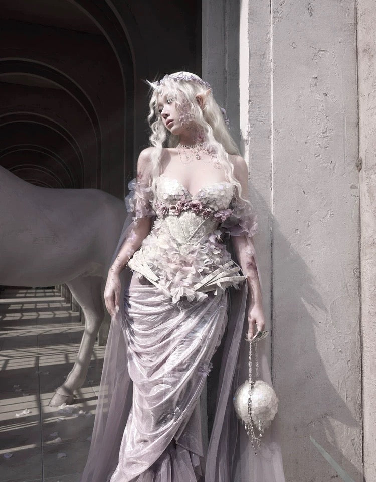 The shimmering textures and layered floral details create a dreamy silhouette that reflects soft silver and pale lavender tones. The design blends vintage elegance with a magical elven atmosphere, bringing a sense of quiet fantasy and graceful strength.