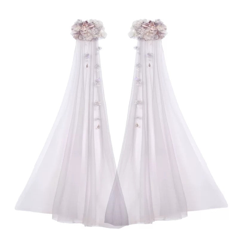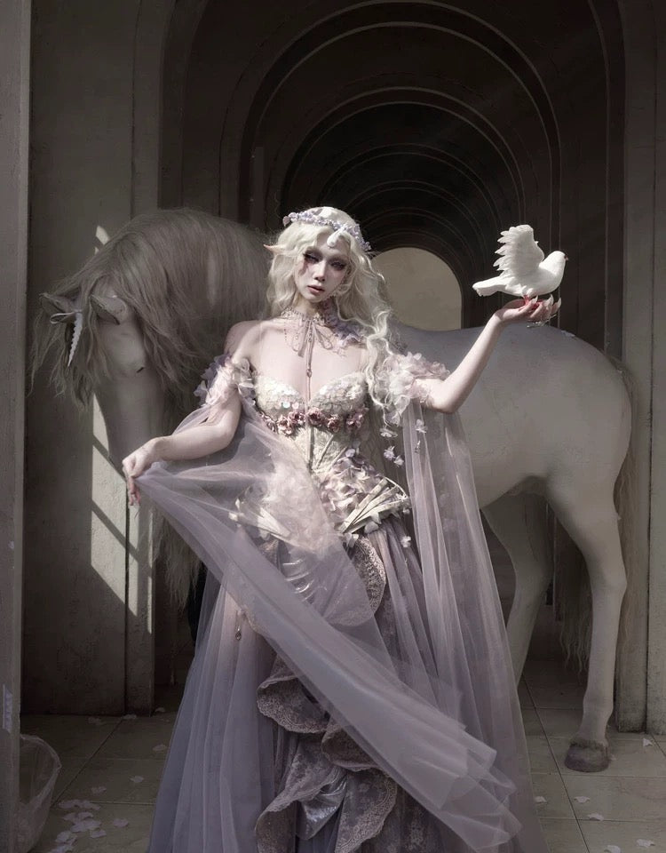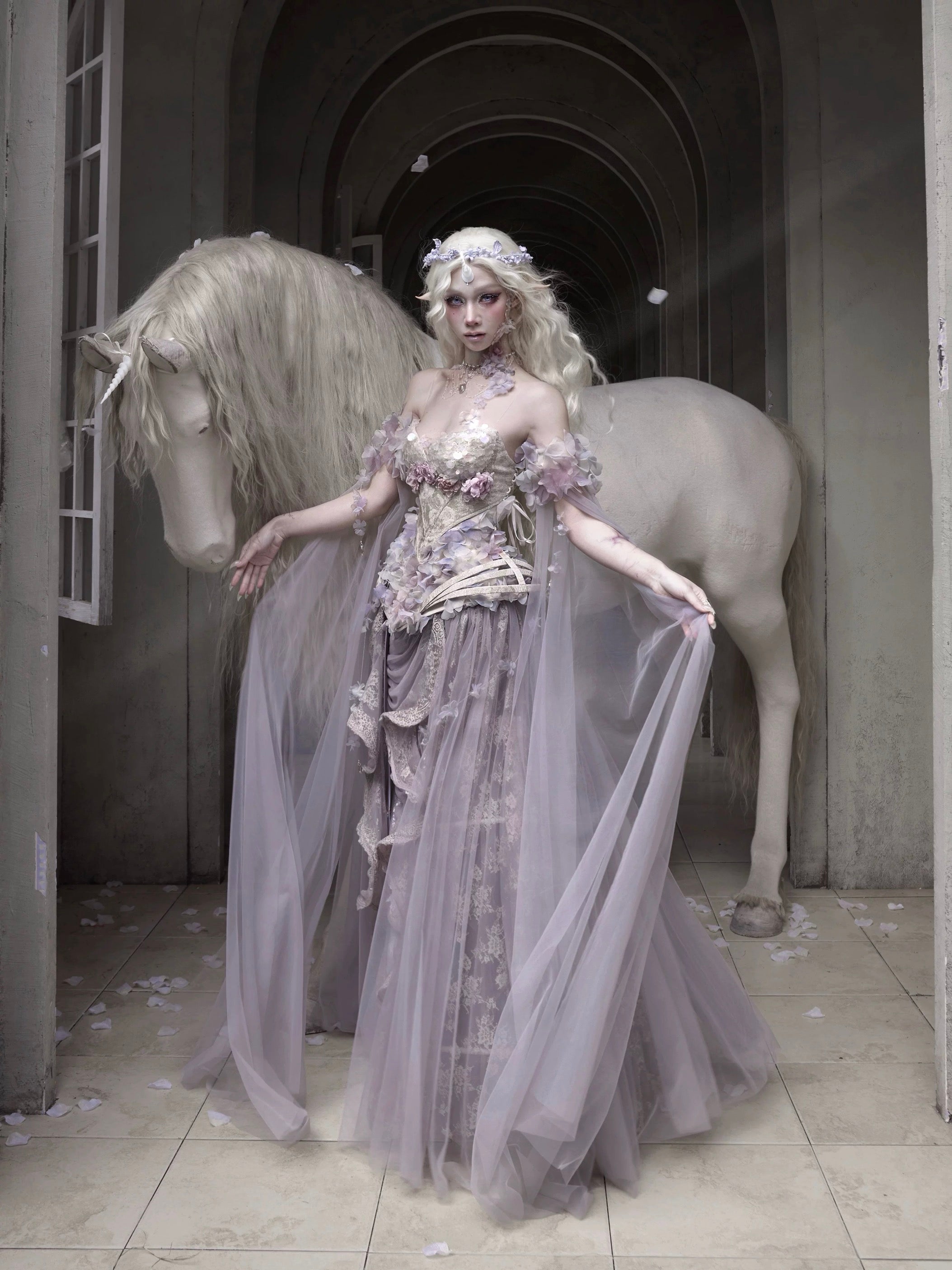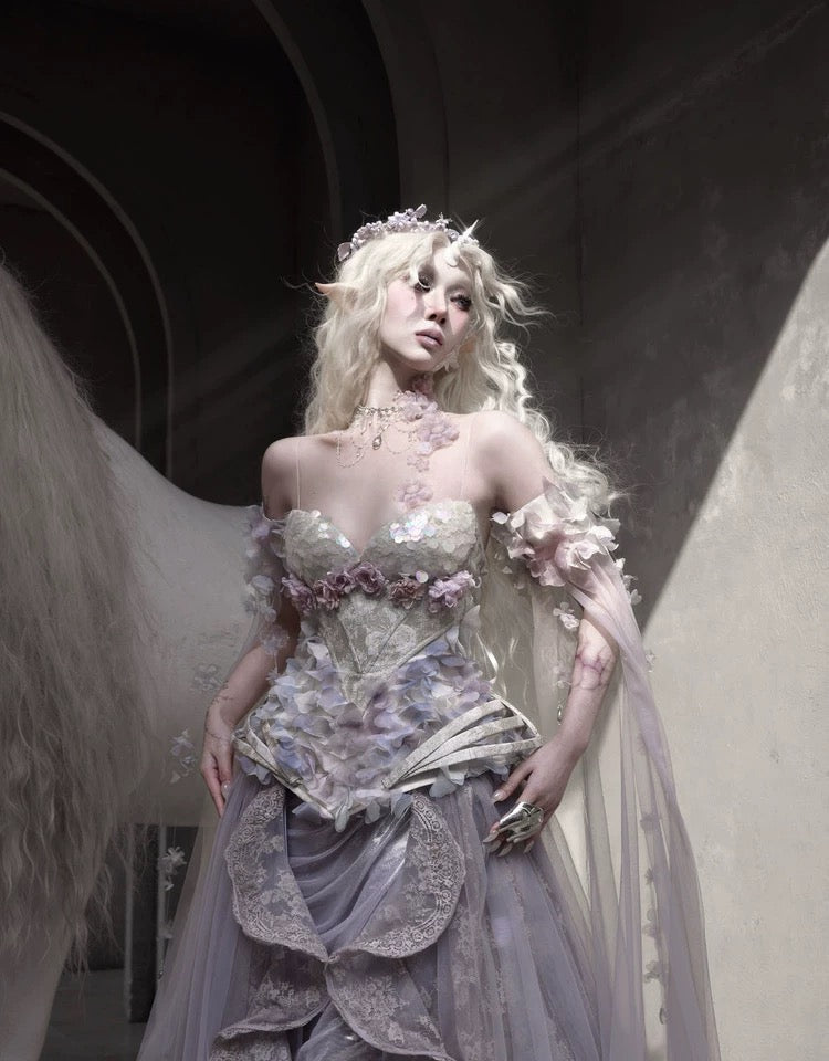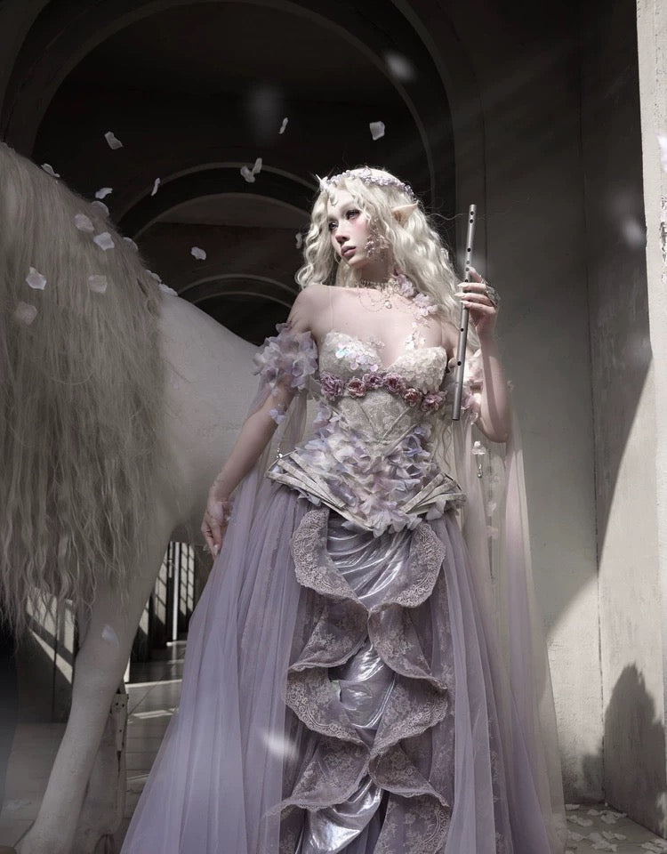 The shimmering textures and layered floral details create a dreamy silhouette that reflects soft silver and pale lavender tones. The design blends vintage elegance with a magical elven atmosphere, bringing a sense of quiet fantasy and graceful strength.