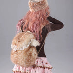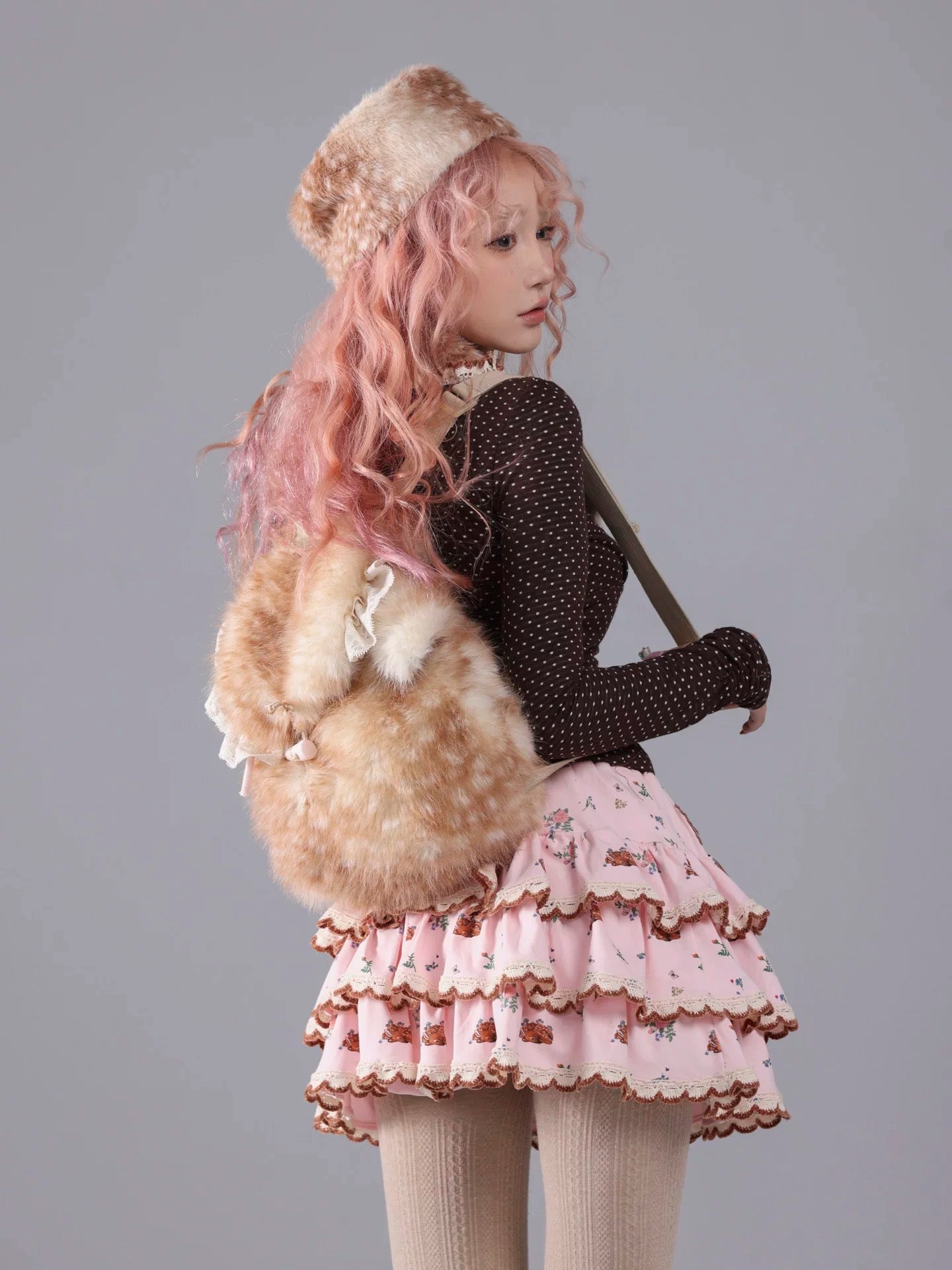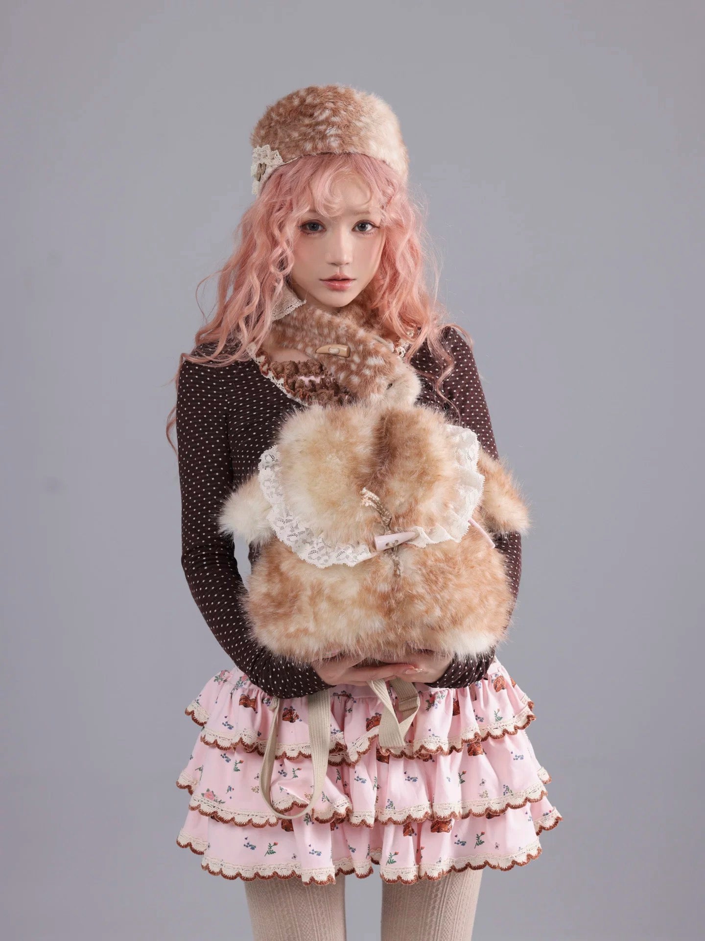 Made from soft fawn-pattern faux fur with vintage lace and hand-sewn wooden buttons — each button carved with a little deer. Cute and heart warming in cottage core fairyland.
