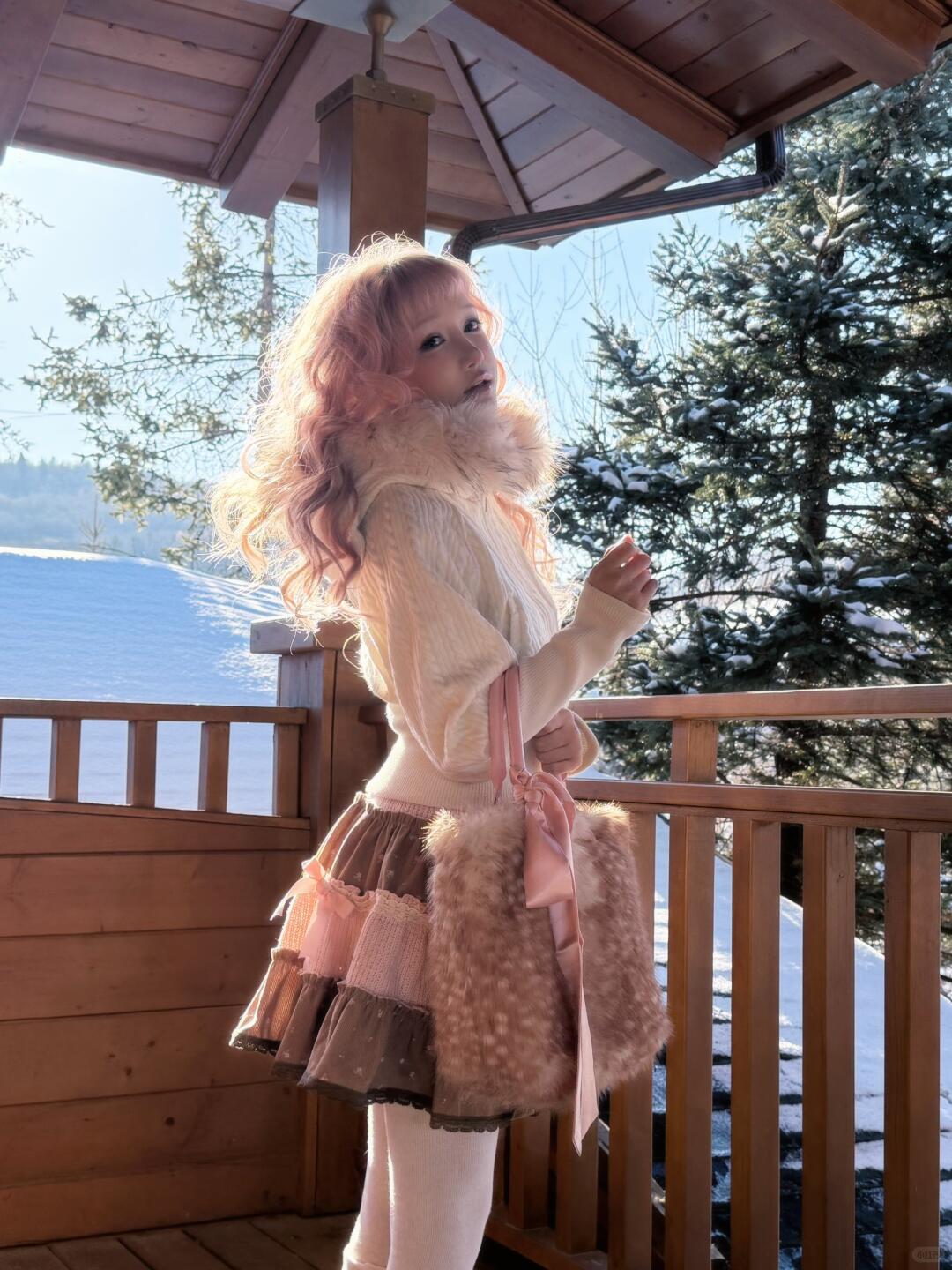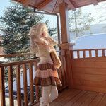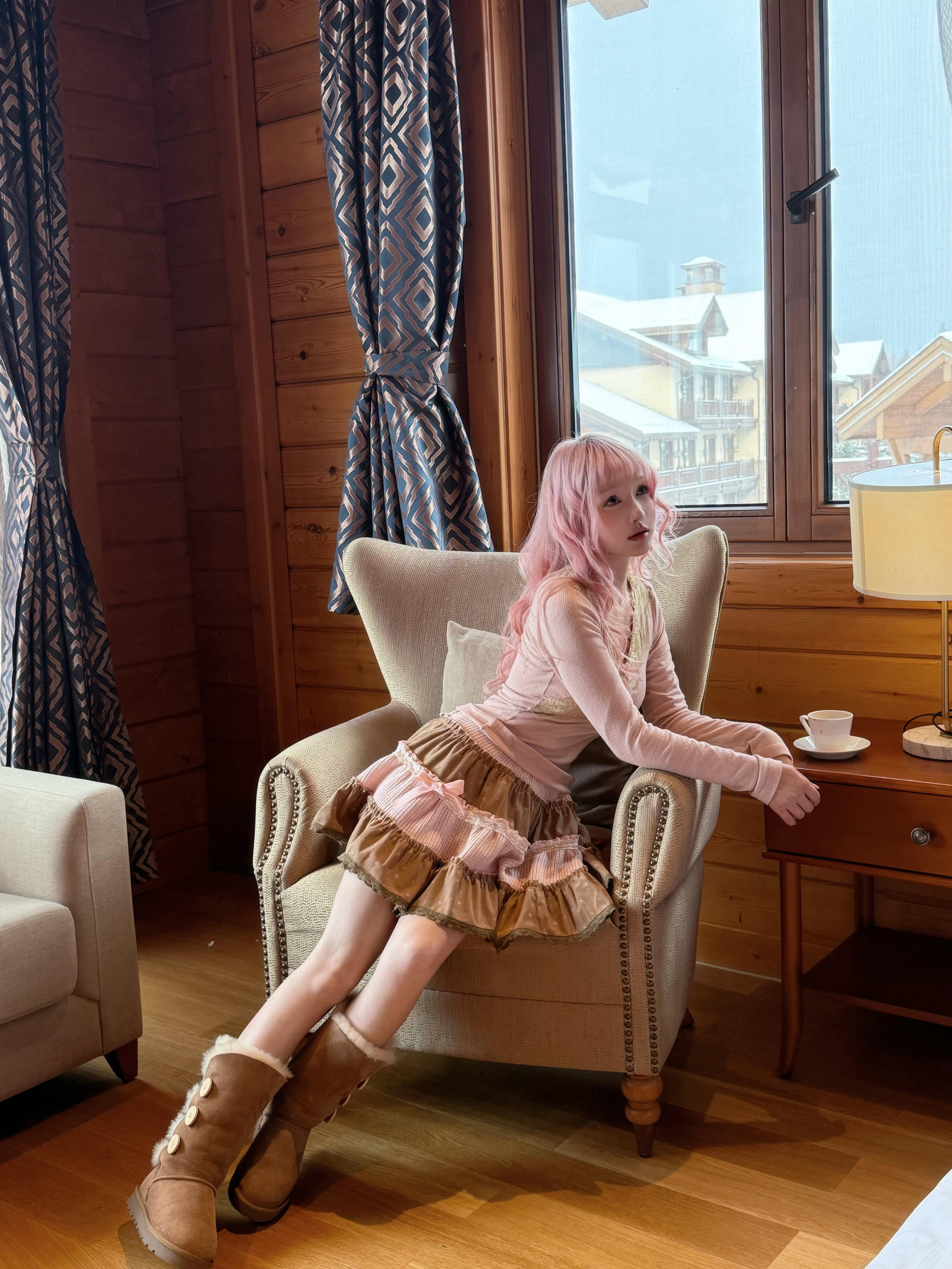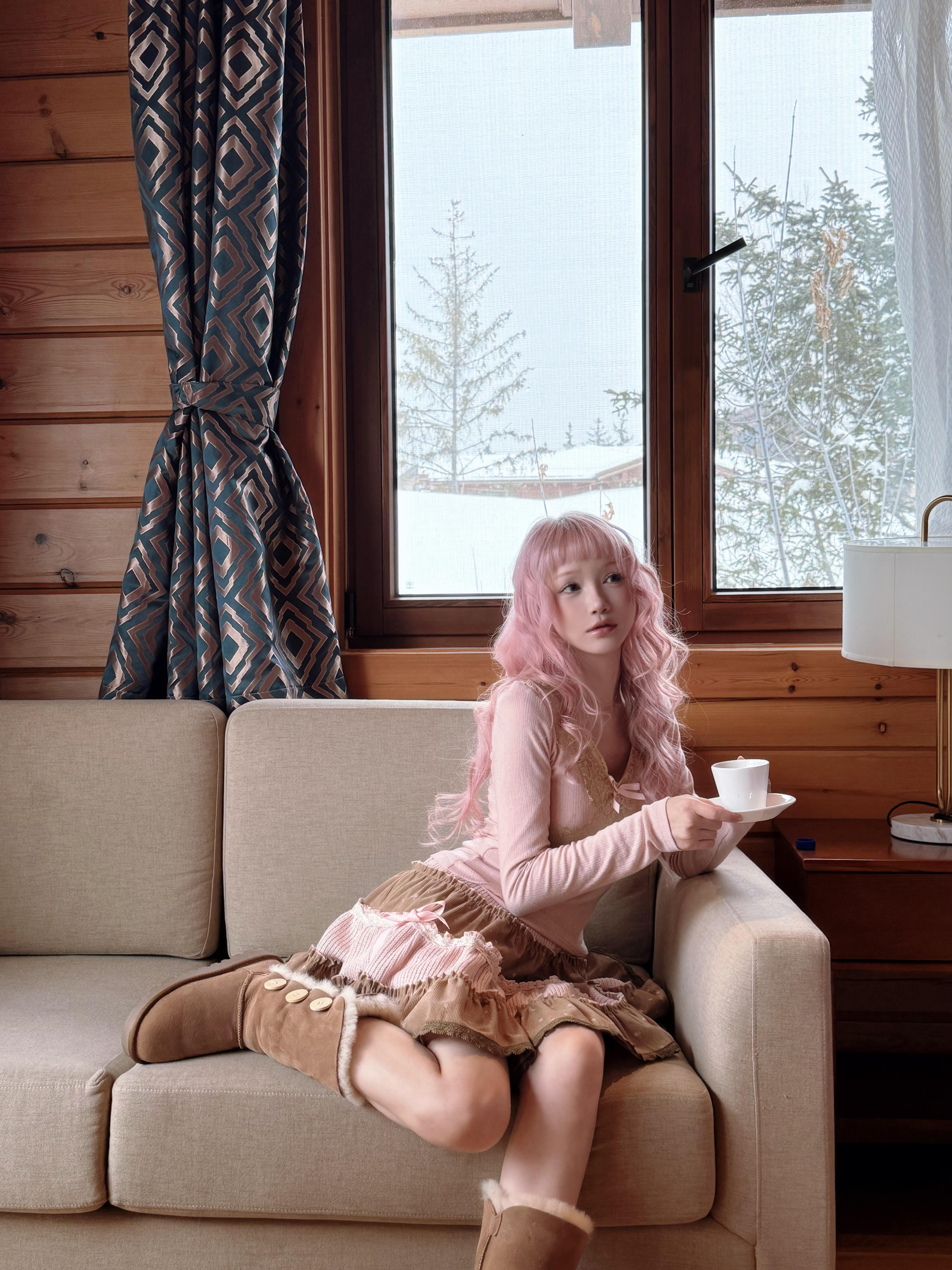 A mix of pink waffle knit, brown floral corduroy, and lace trim creates a sweet, handcrafted look—just like a warm dessert served in a winter cabin.