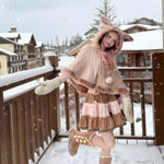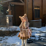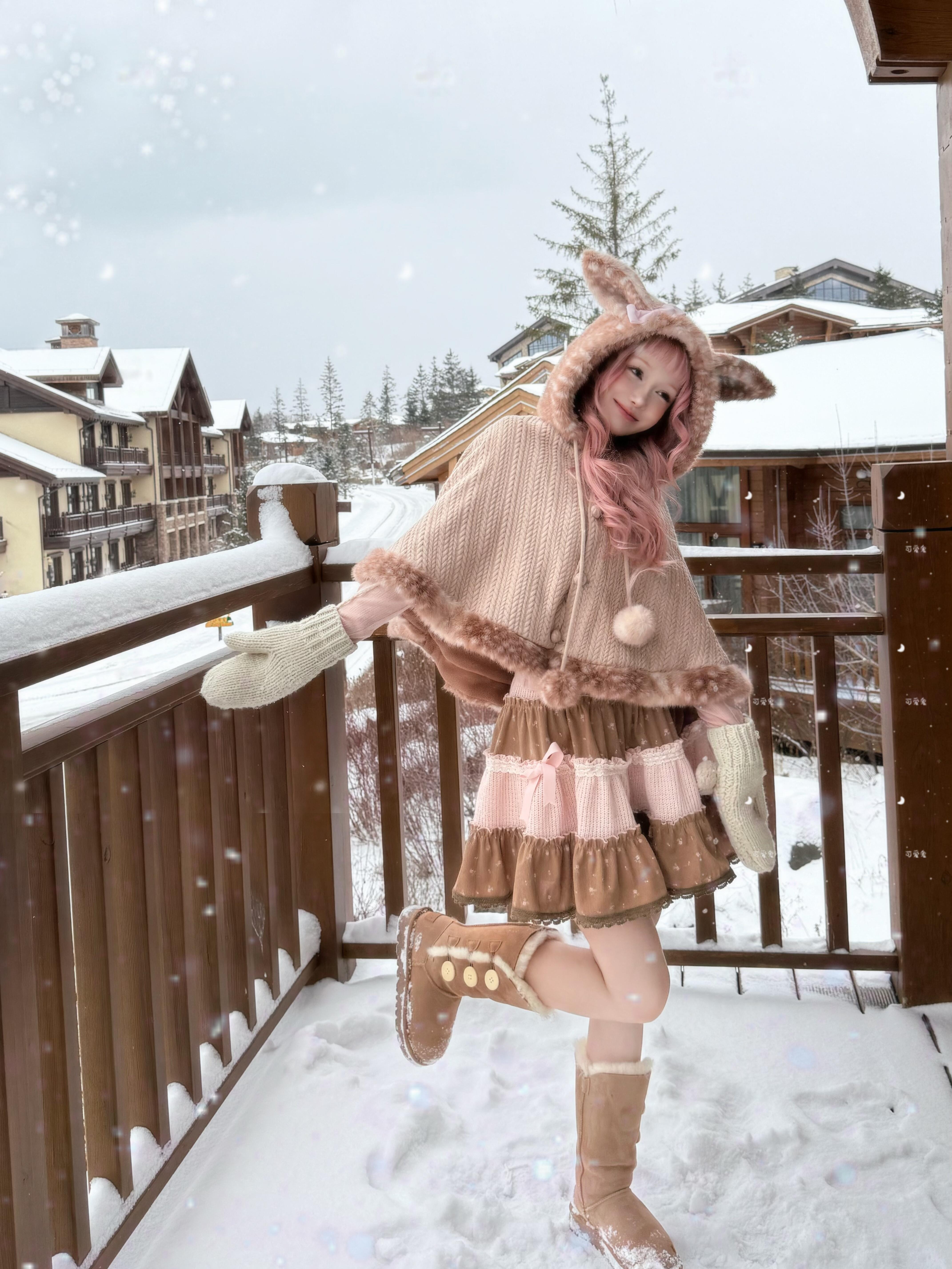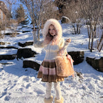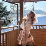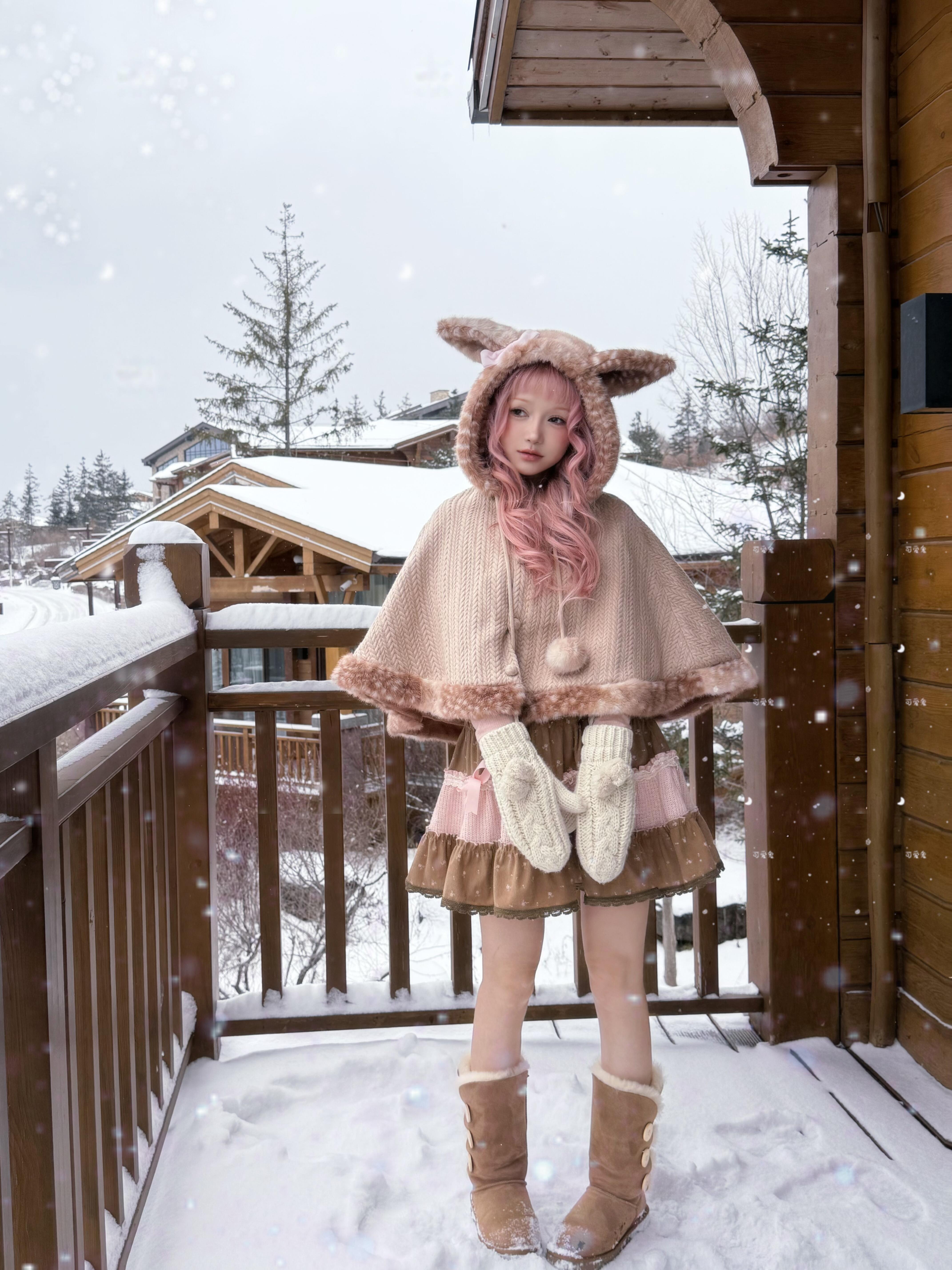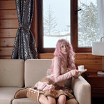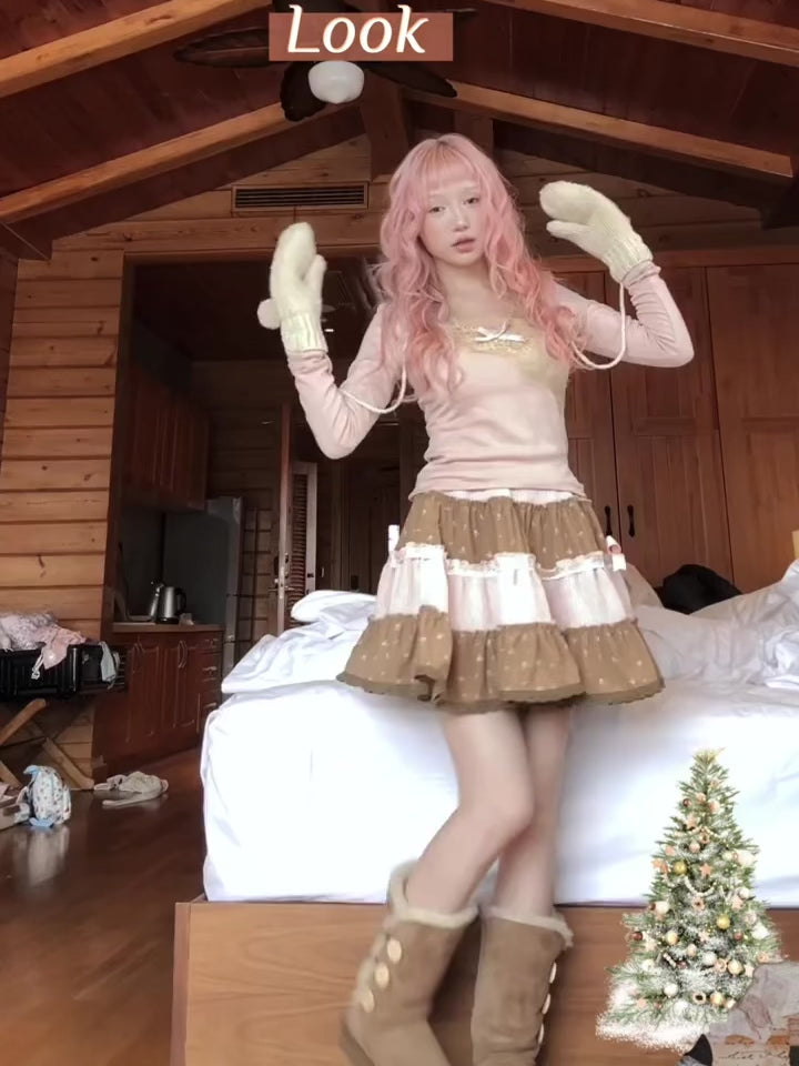 A mix of pink waffle knit, brown floral corduroy, and lace trim creates a sweet, handcrafted look—just like a warm dessert served in a winter cabin.