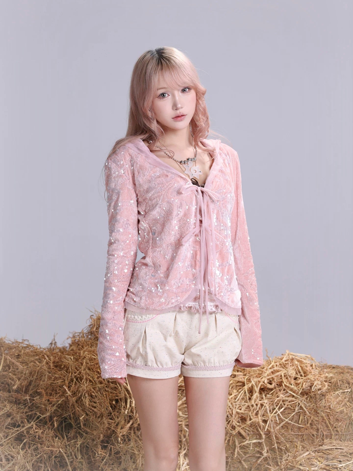 These shorts are designed for soft days of comfort. Speckled fabric adds a natural, cozy texture, while lace trim and delicate pleats bring a gentle vintage charm.