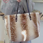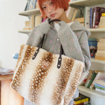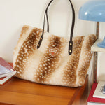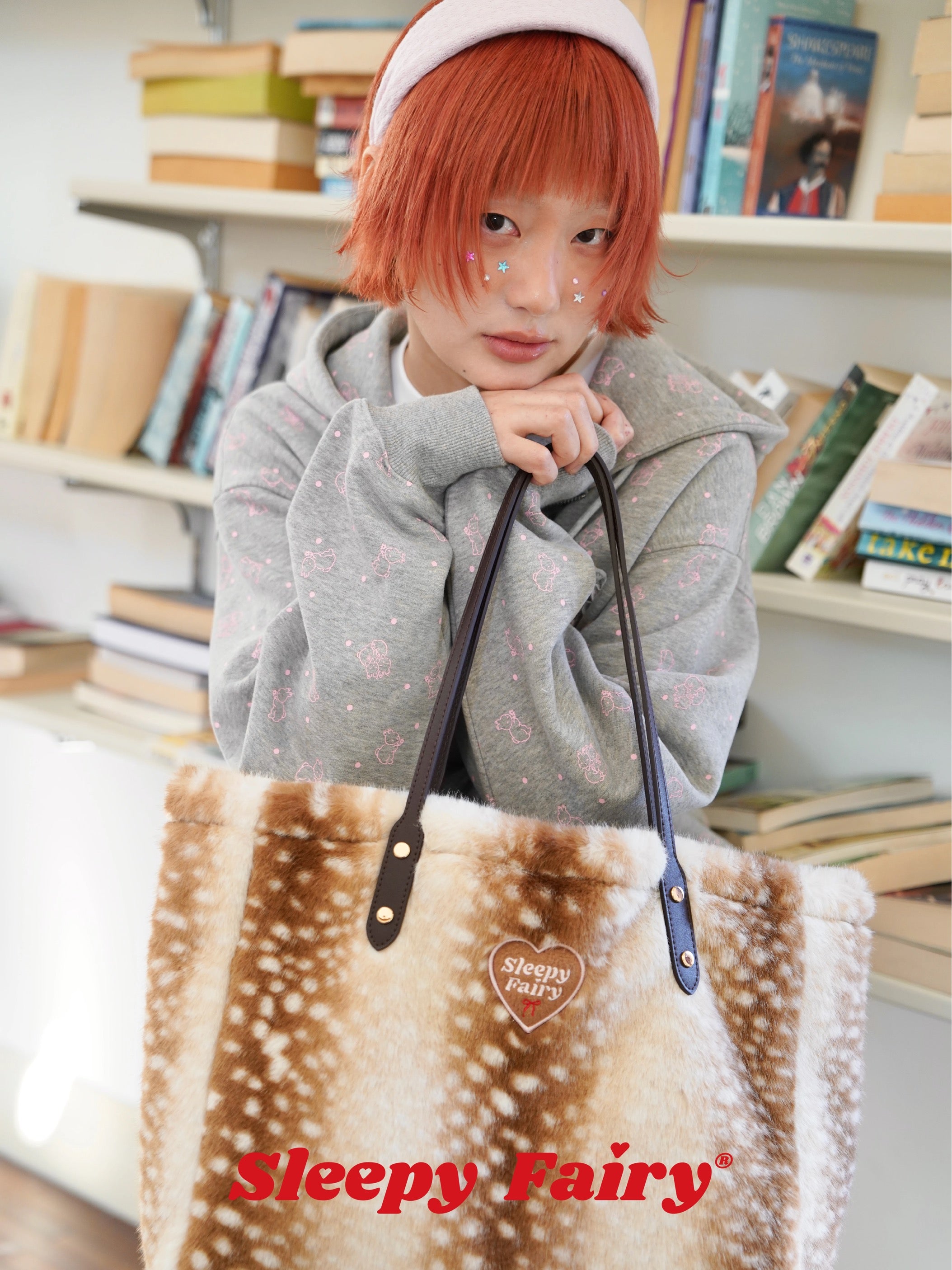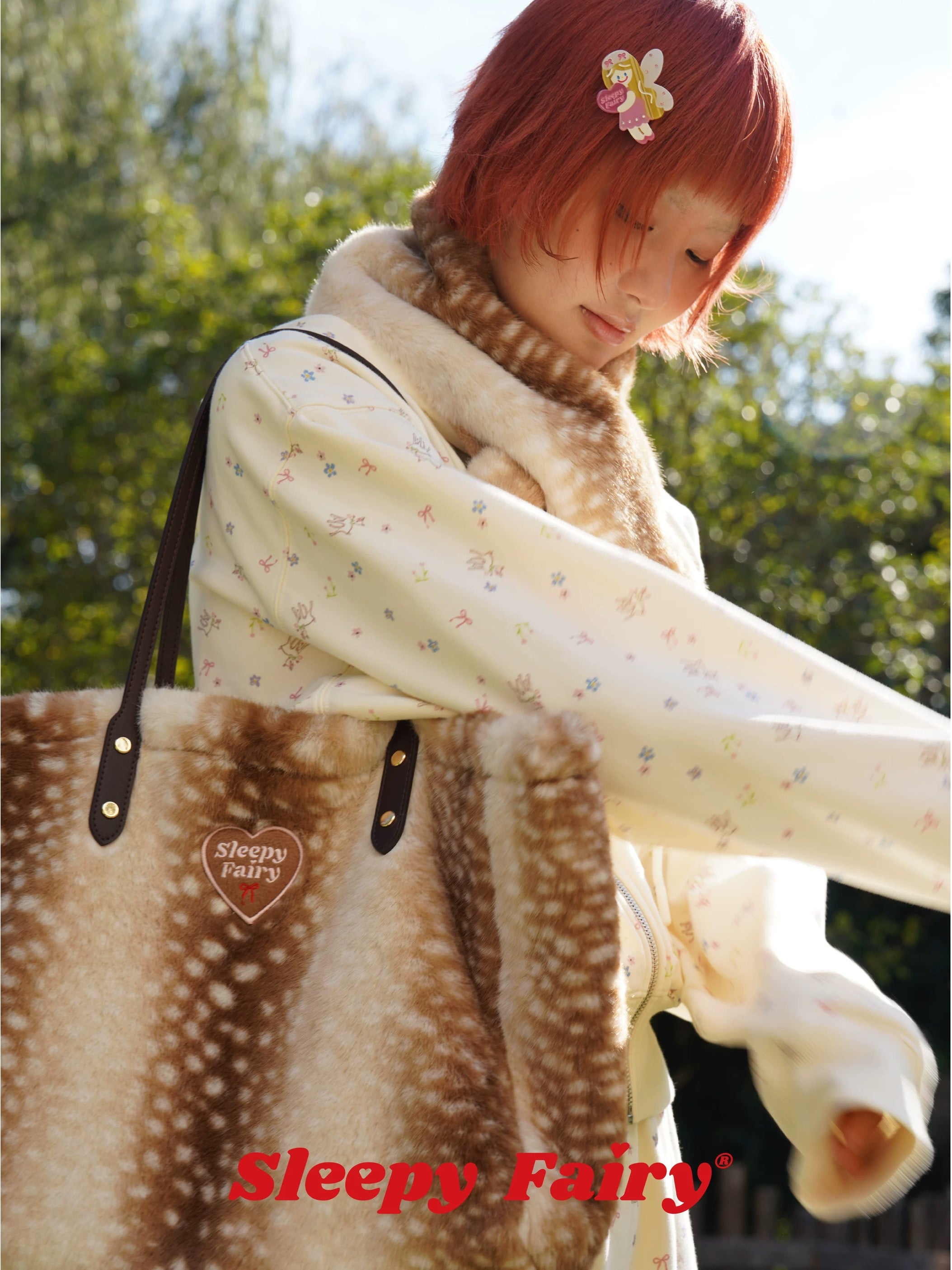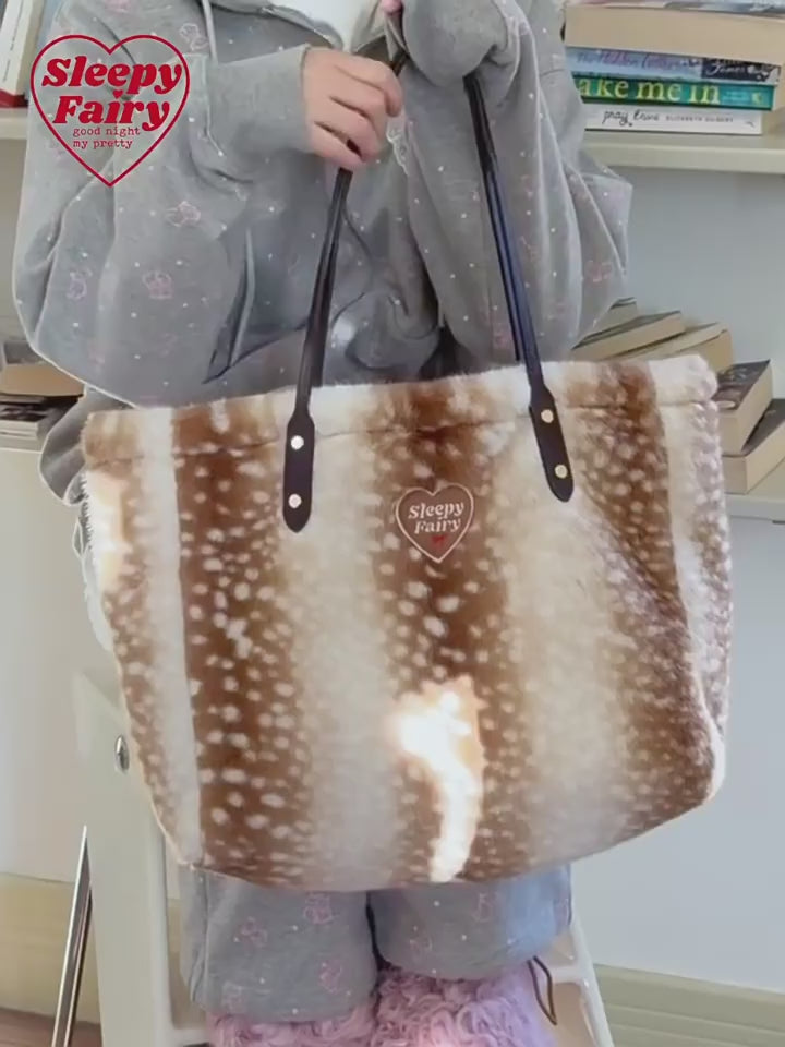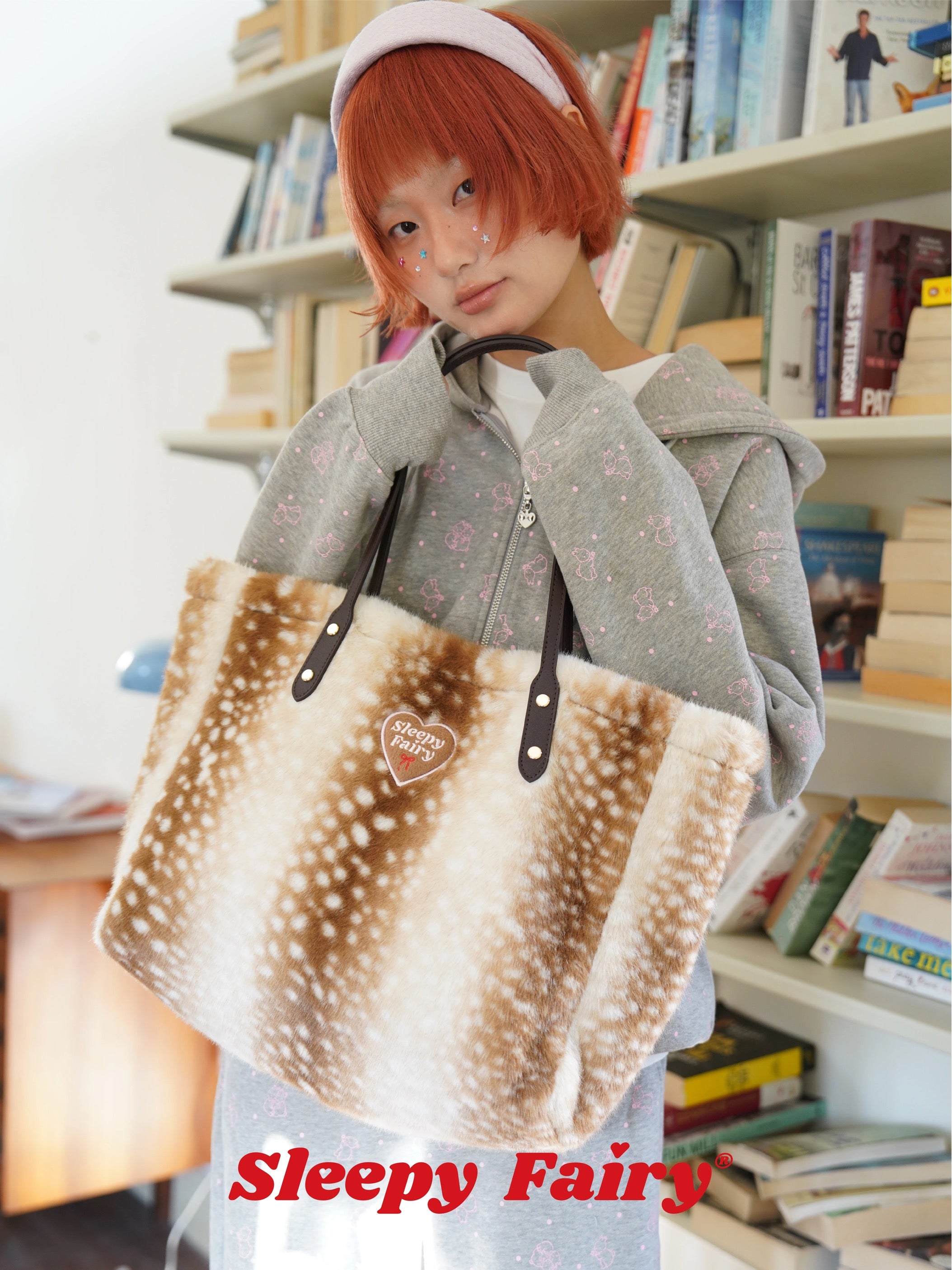 A soft and cozy Sleepy Fairy tote bag featuring a gentle deer-inspired faux fur pattern. Designed to be both cute and practical, this tote adds a warm, dreamy touch to everyday outfits.