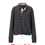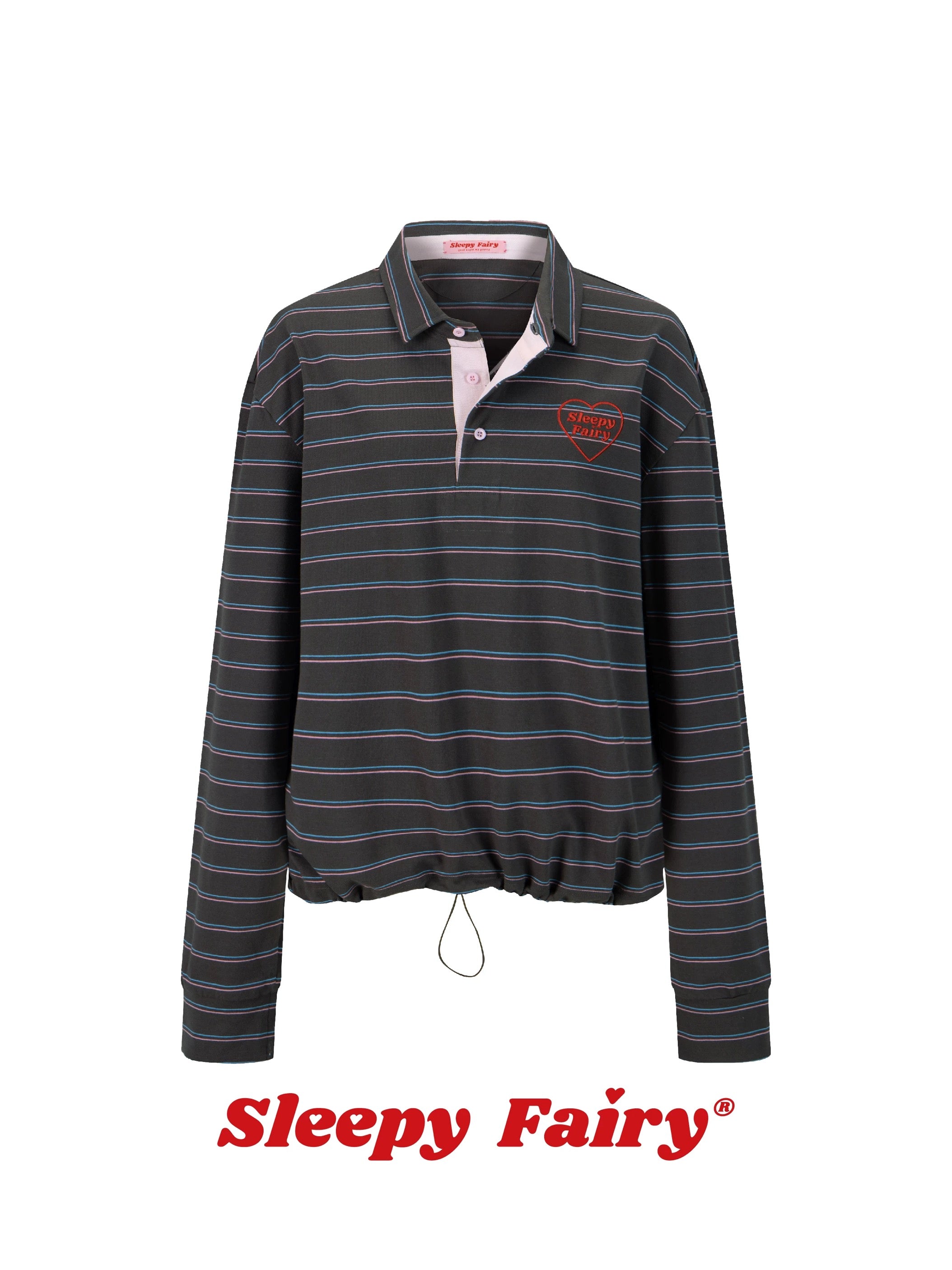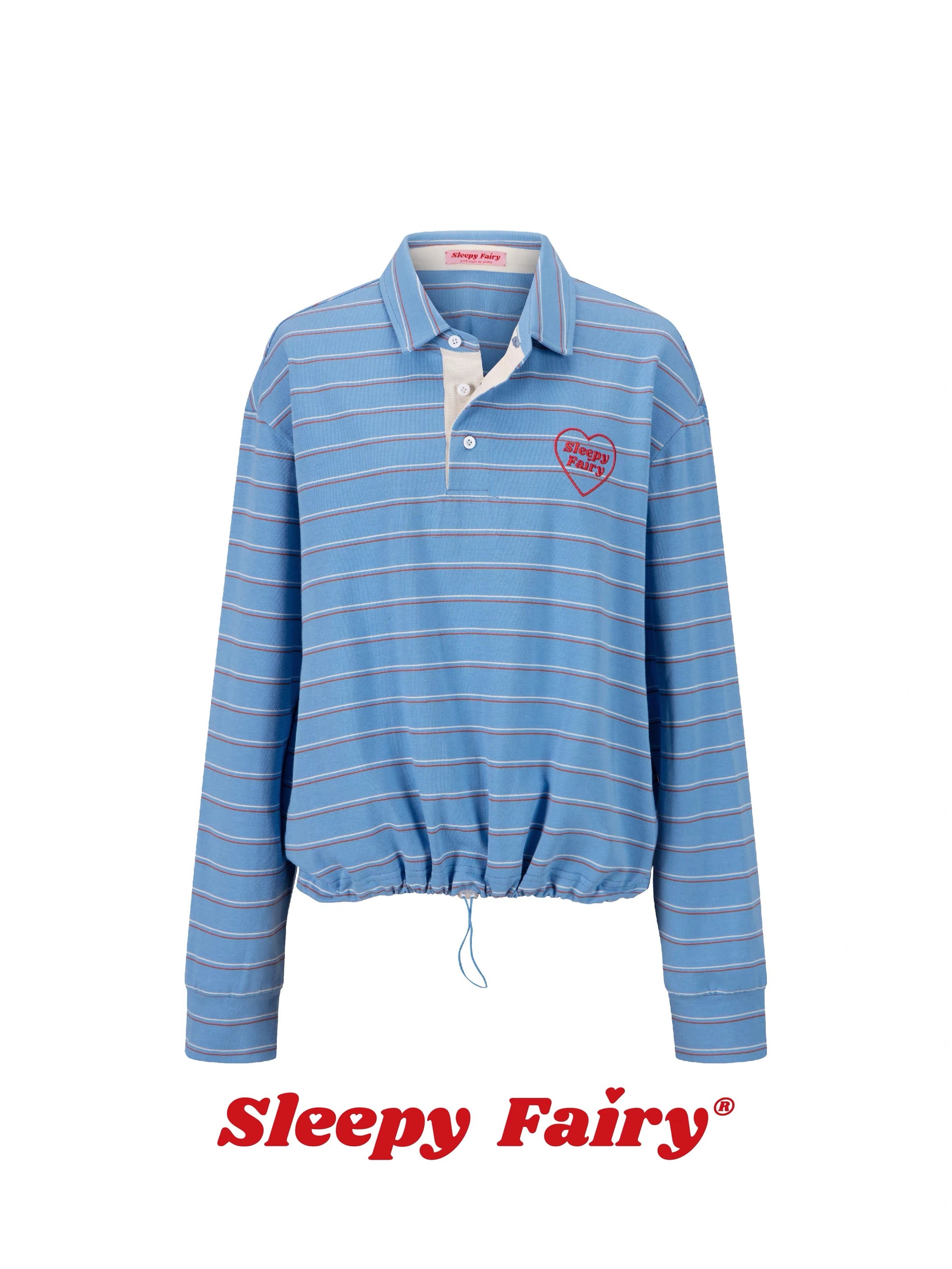 Features a classic polo collar with contrast placket, embroidered Sleepy Fairy heart logo on the chest, and an adjustable drawstring hem that allows two styling options: worn loose or gently cinched for a cropped silhouette.