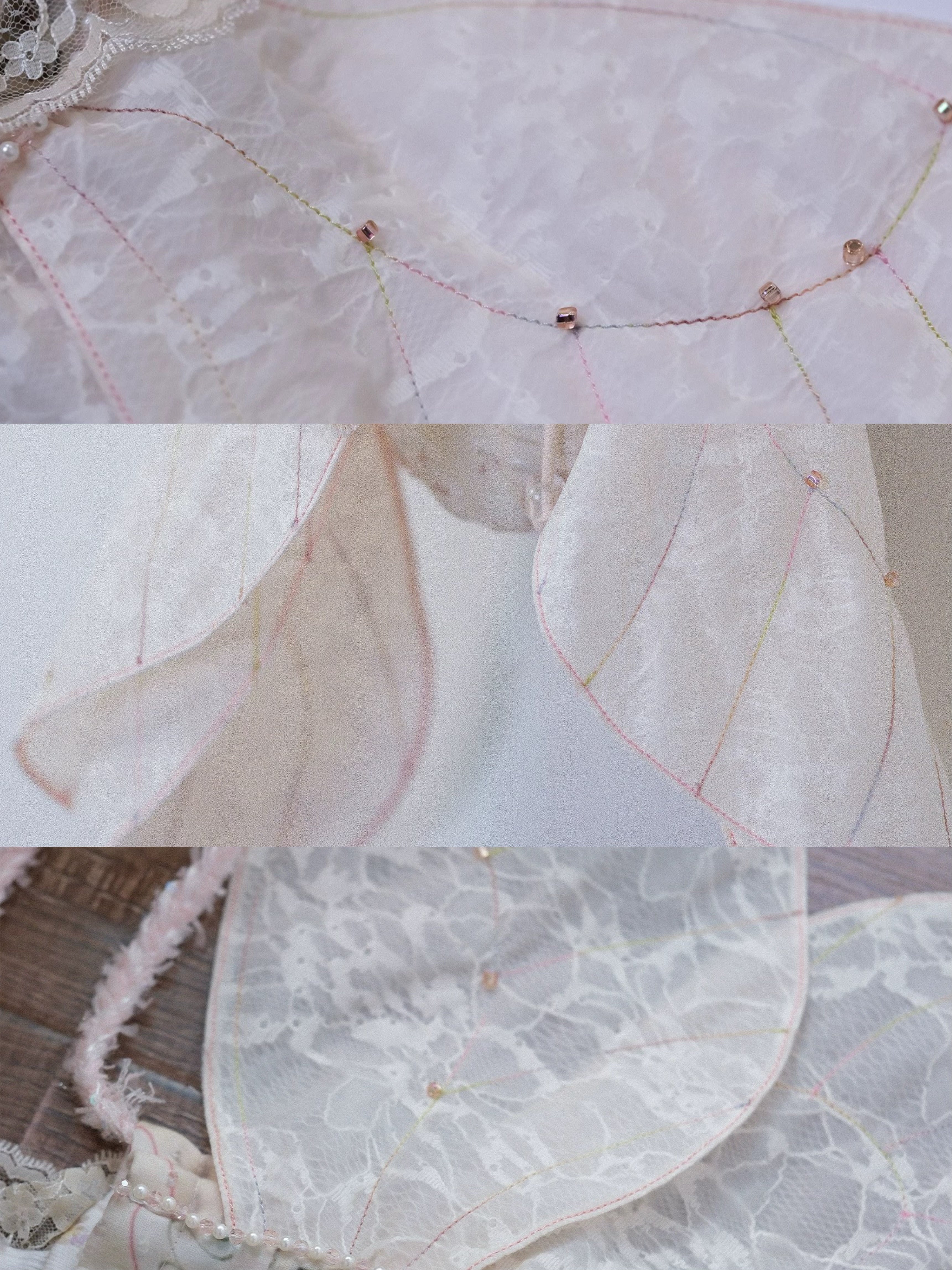 Designed with layered translucent wings, this piece features hand-applied bead details and delicate lace embellishments, creating a soft shimmer between reality and fantasy.