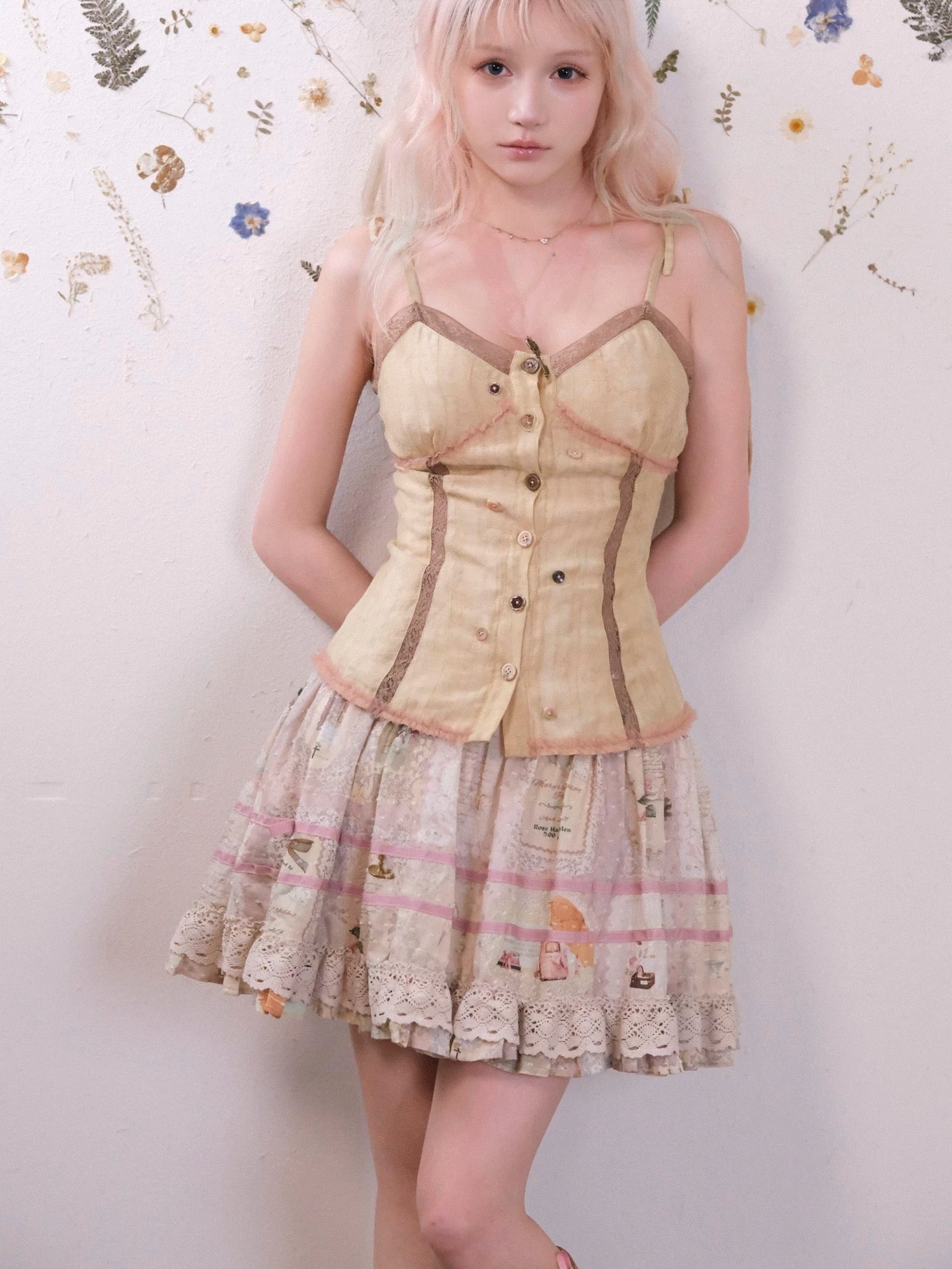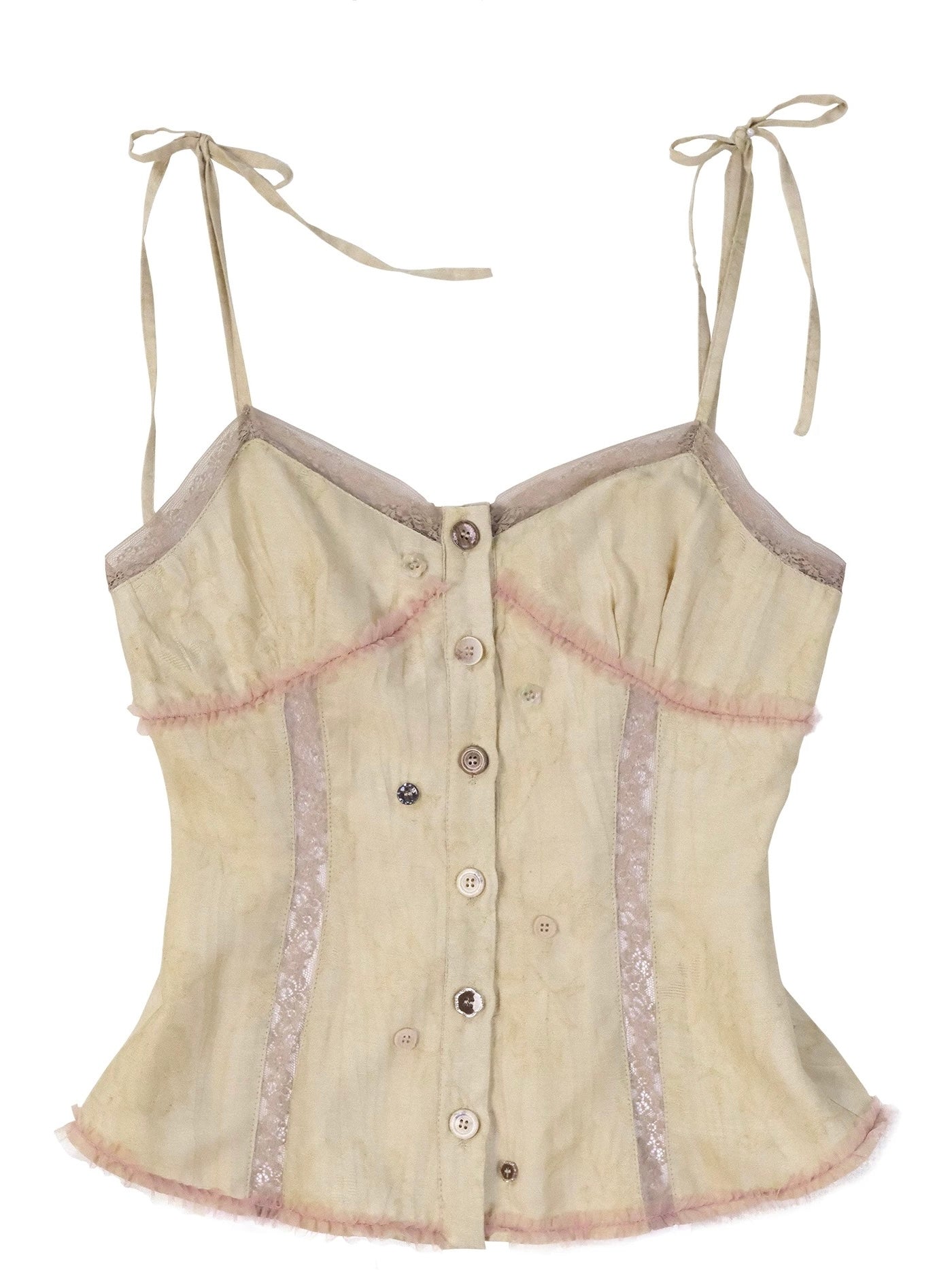Designed with a gentle sculpted silhouette, this piece features delicate lace paneling, irregular vintage-style buttons, and a naturally textured fabric that feels light and breathable.