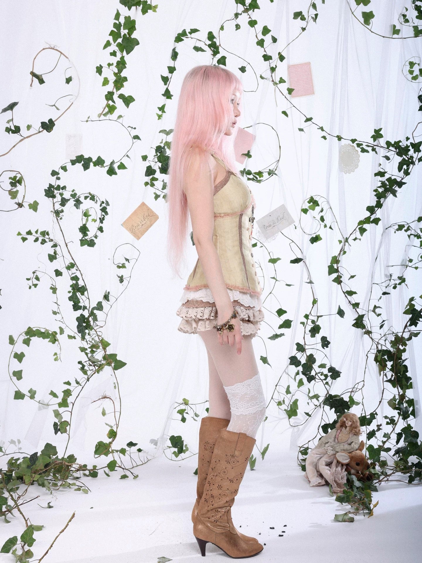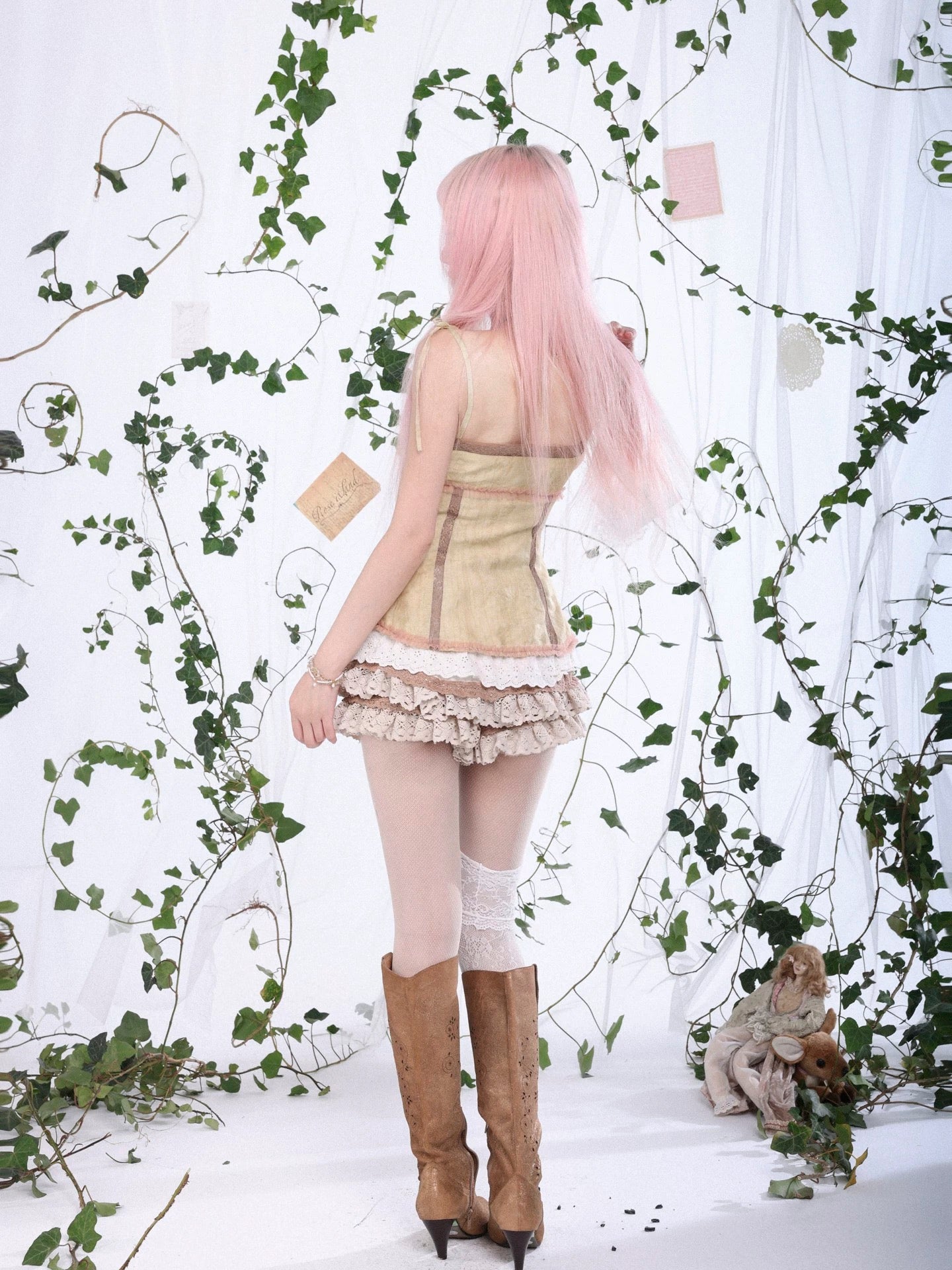 A soft fairycore corset top inspired by forest light and cicada wings.