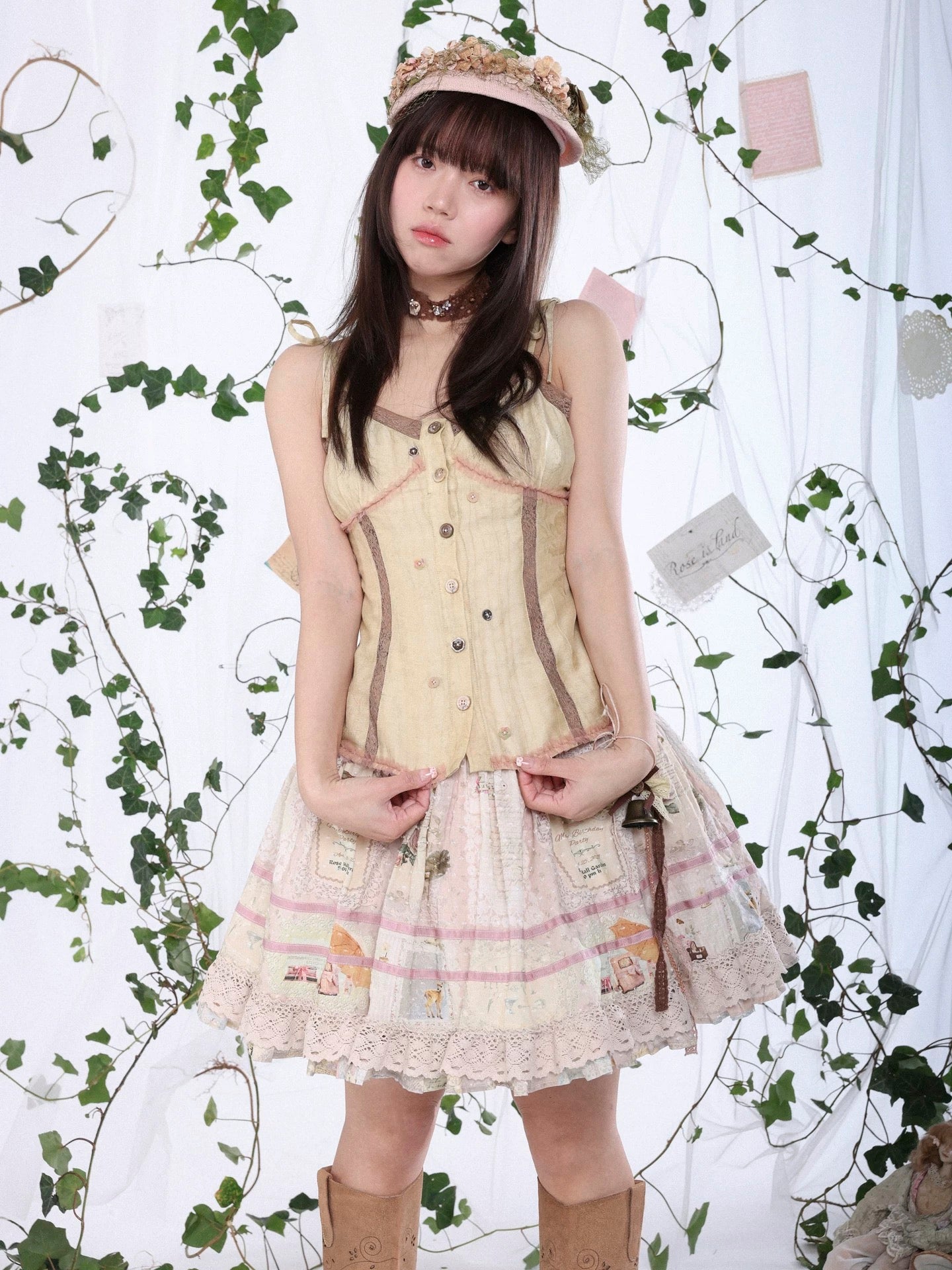 The tie-up shoulder straps add a dreamy, adjustable touch, while the faded tones give it a slightly worn, story-like charm.