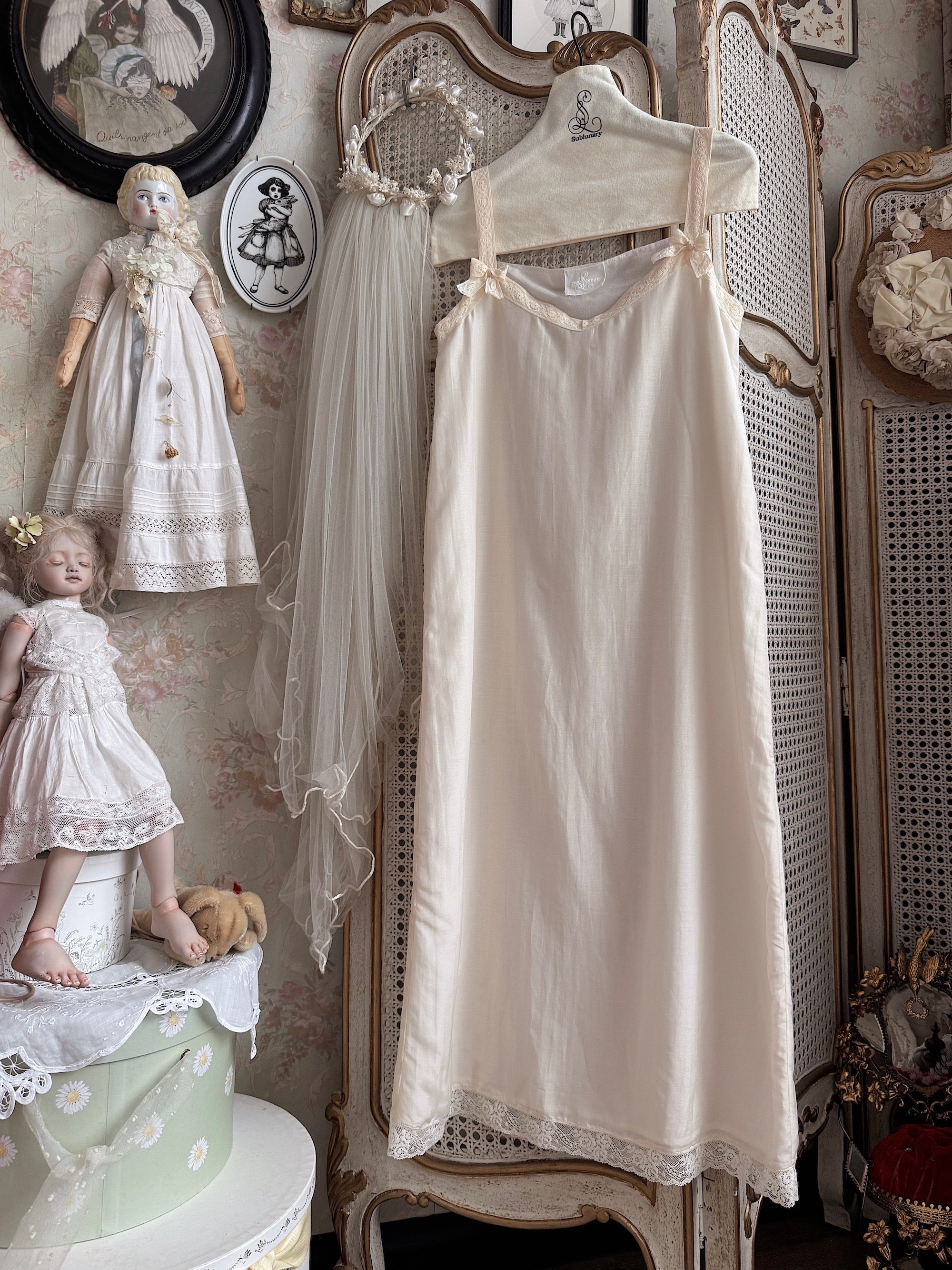 アンティークホワイトのスリップドレスに、淡いライラック色のシアーガウンを重ねた二点セット。シルクコットンとフランス製レース、天然シェルボタンで仕立てられ、ヴィクトリア時代のロマンティックな雰囲気を漂わせながら、軽やかな着心地を叶えています。幾重にも重なるフリルとスモッキングのディテールが、夢のように浮遊感のあるシルエットを生み出します。