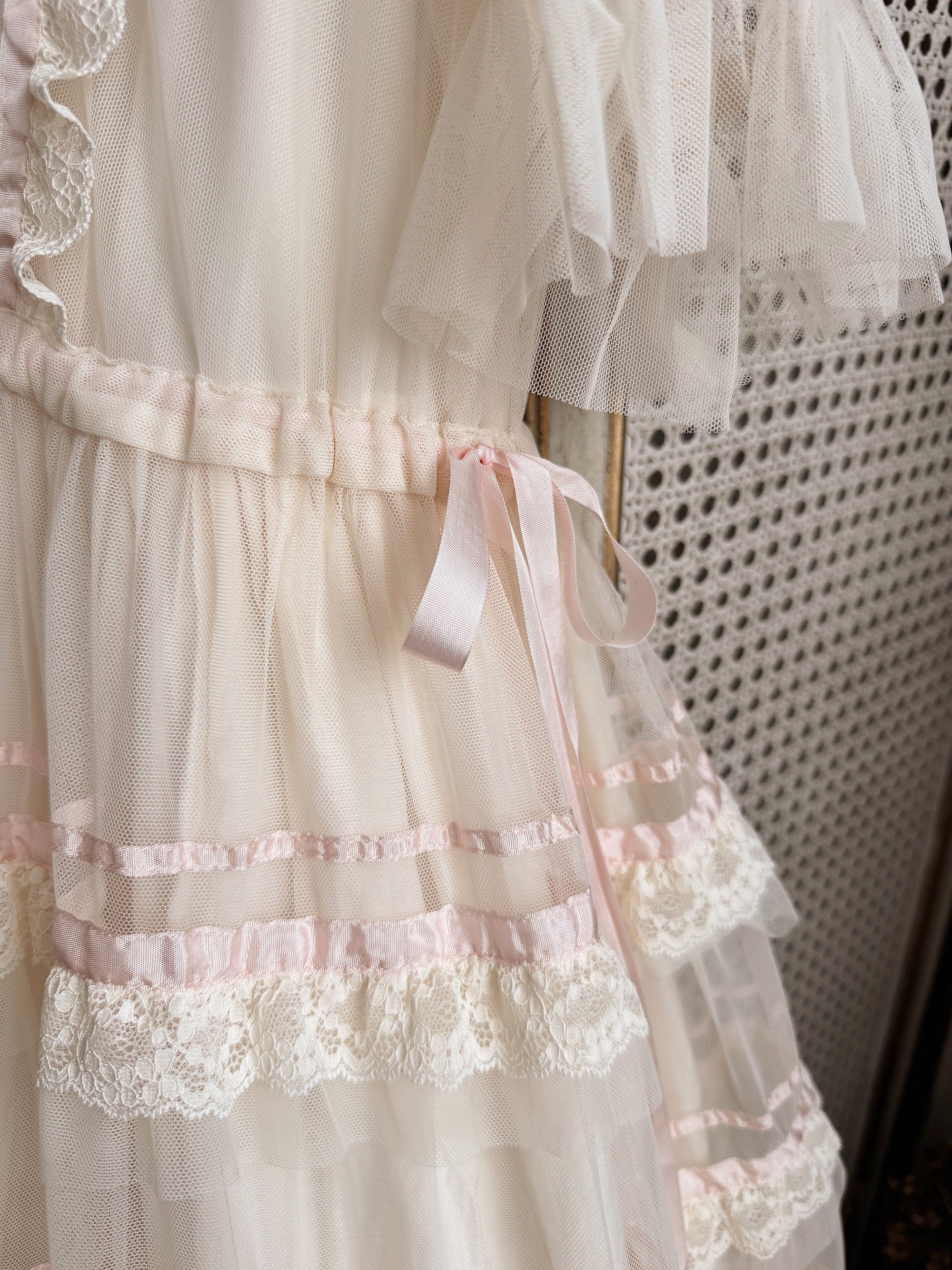 This gown set pairs a sheer tulle overlay adorned with pastel ribbons and lace, layered over an ivory slip dress. Crafted from Japanese tulle, silk ribbons, and delicate lace, it evokes the innocence of antique gowns while offering graceful modern wearability. The cascading ruffles and ribbon detailing create a silhouette that feels both ethereal and nostalgic.