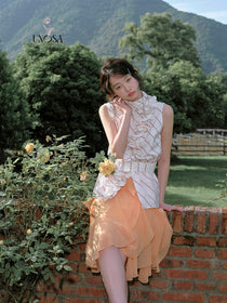Inspired by morning walks through rose-covered terraces, golden afternoon tea, and whispered secrets under apple trees, this collection captures the soft innocence and quiet elegance of a nostalgic summer dream. Each piece carries a whisper of vintage elegance — from airy ruffles and delicate floral prints to flowing skirts kissed by the breeze.