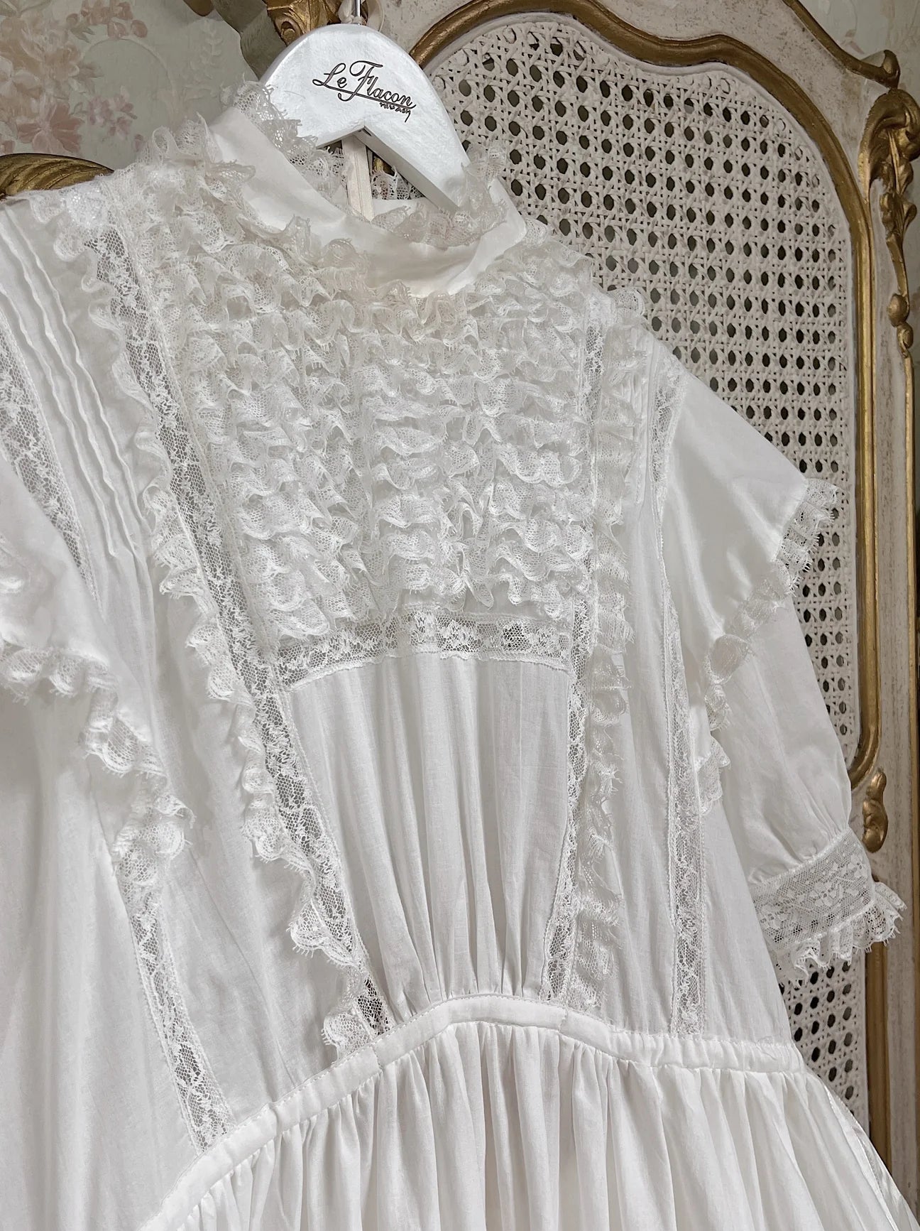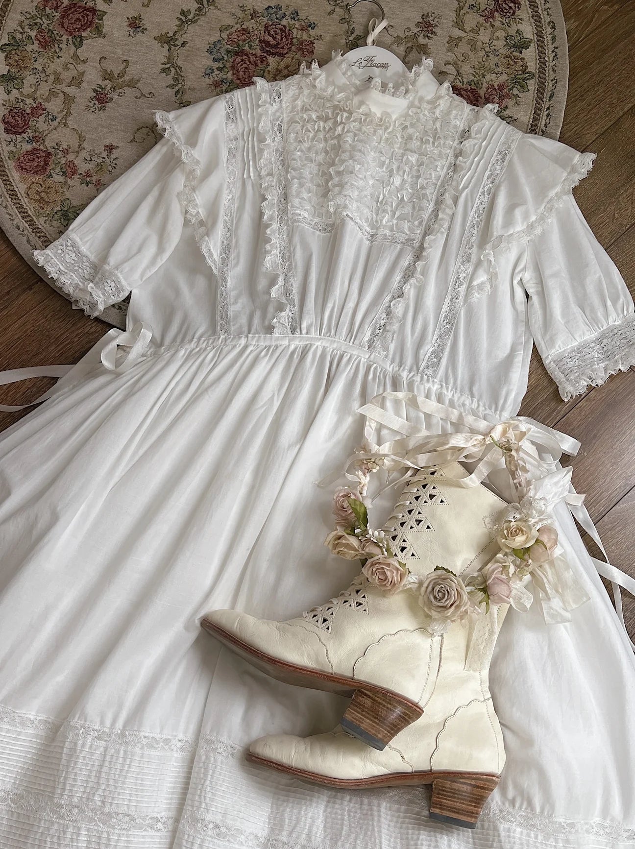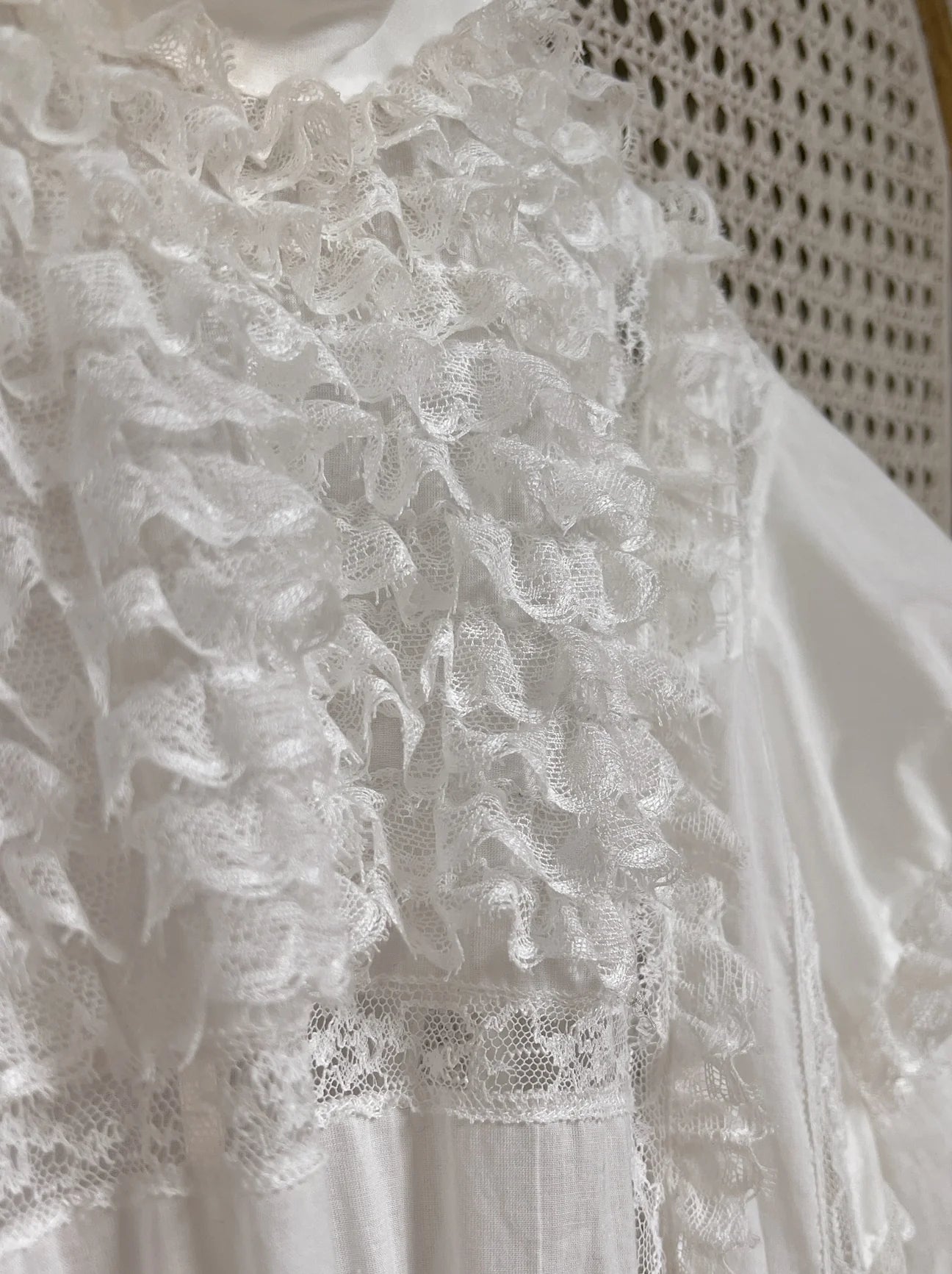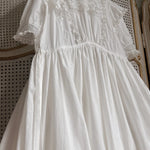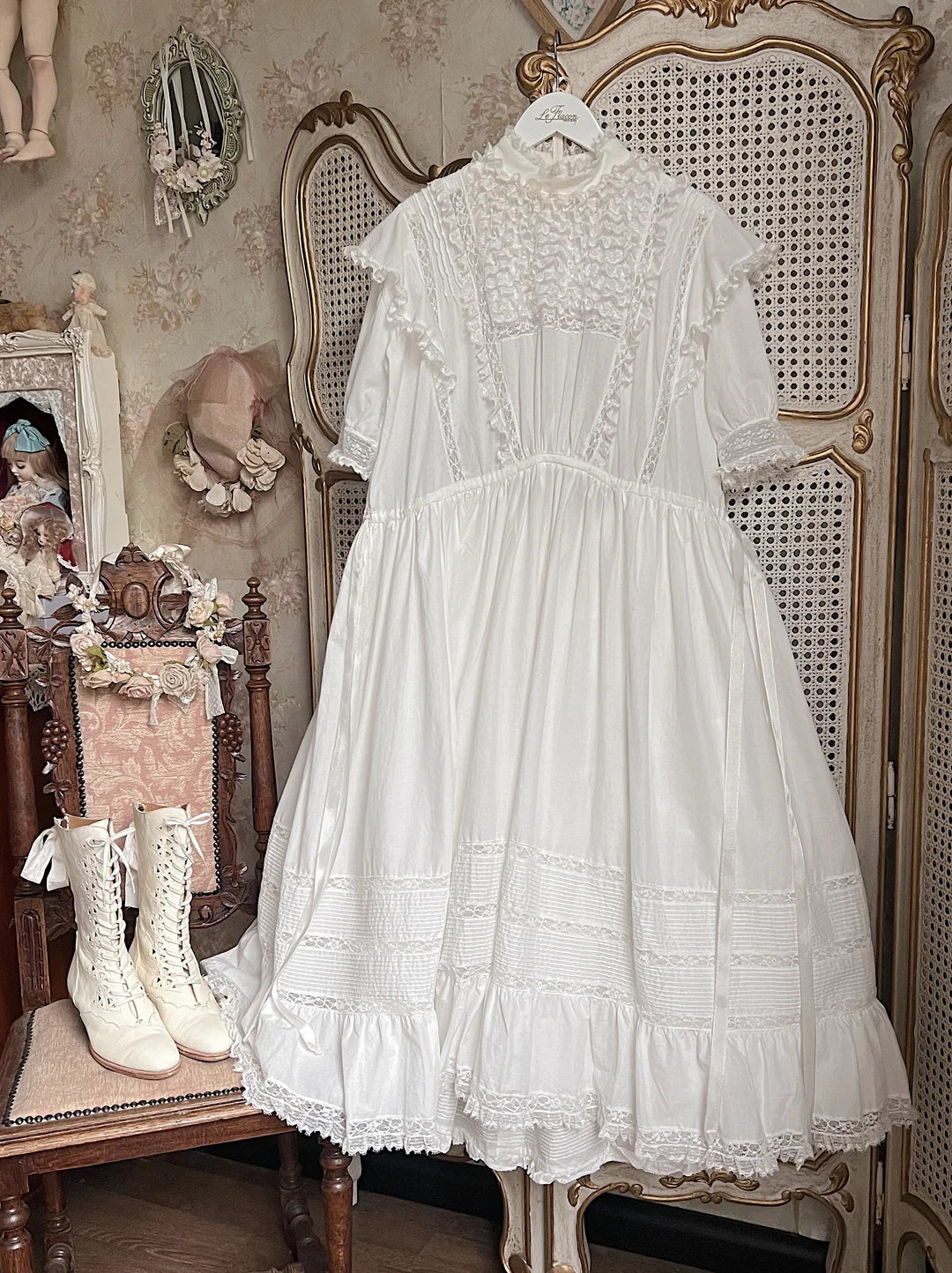 繊細なコットンレースと流れるようなフリルが重なり合い、まるで遠い別荘の庭に佇むような幻想的な雰囲気を纏わせてくれます。クラシカルで高貴なシルエットは、時を超えたロマンティックな物語を奏でます。