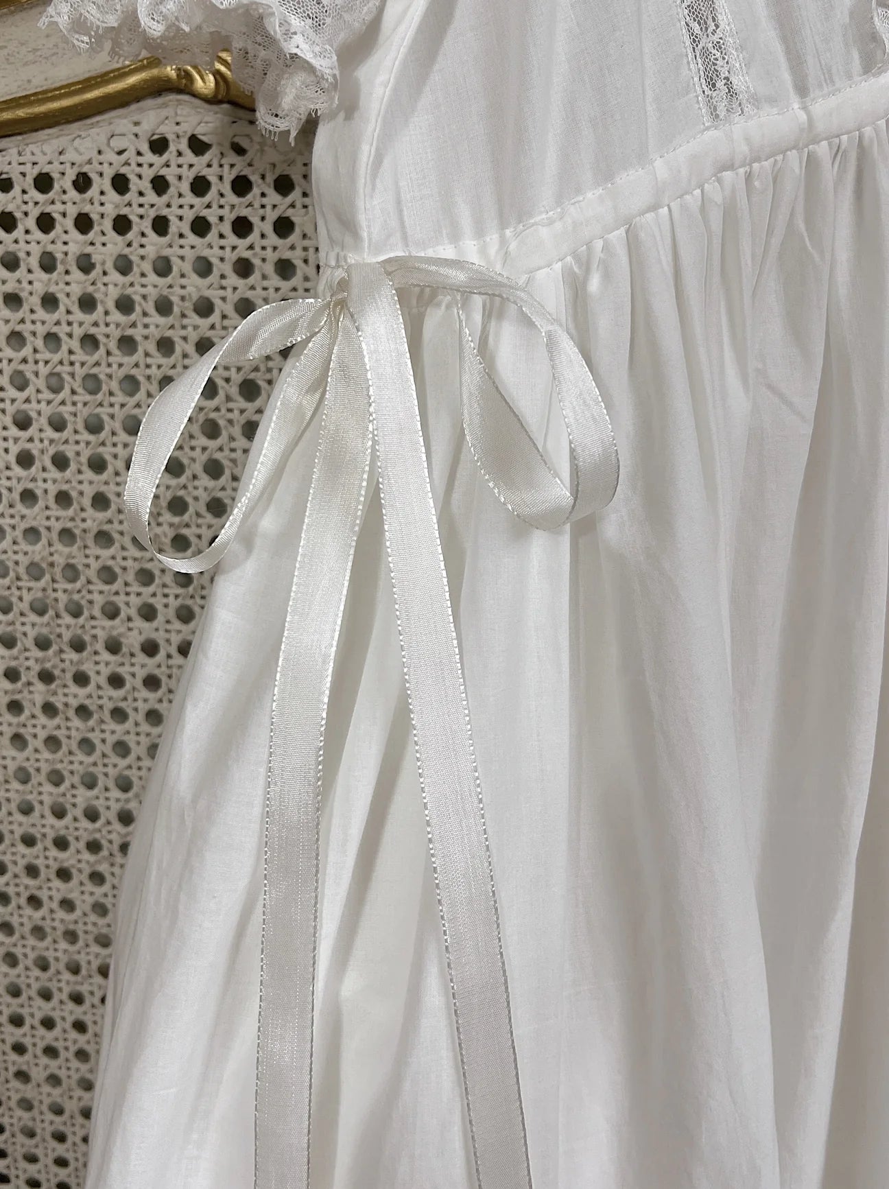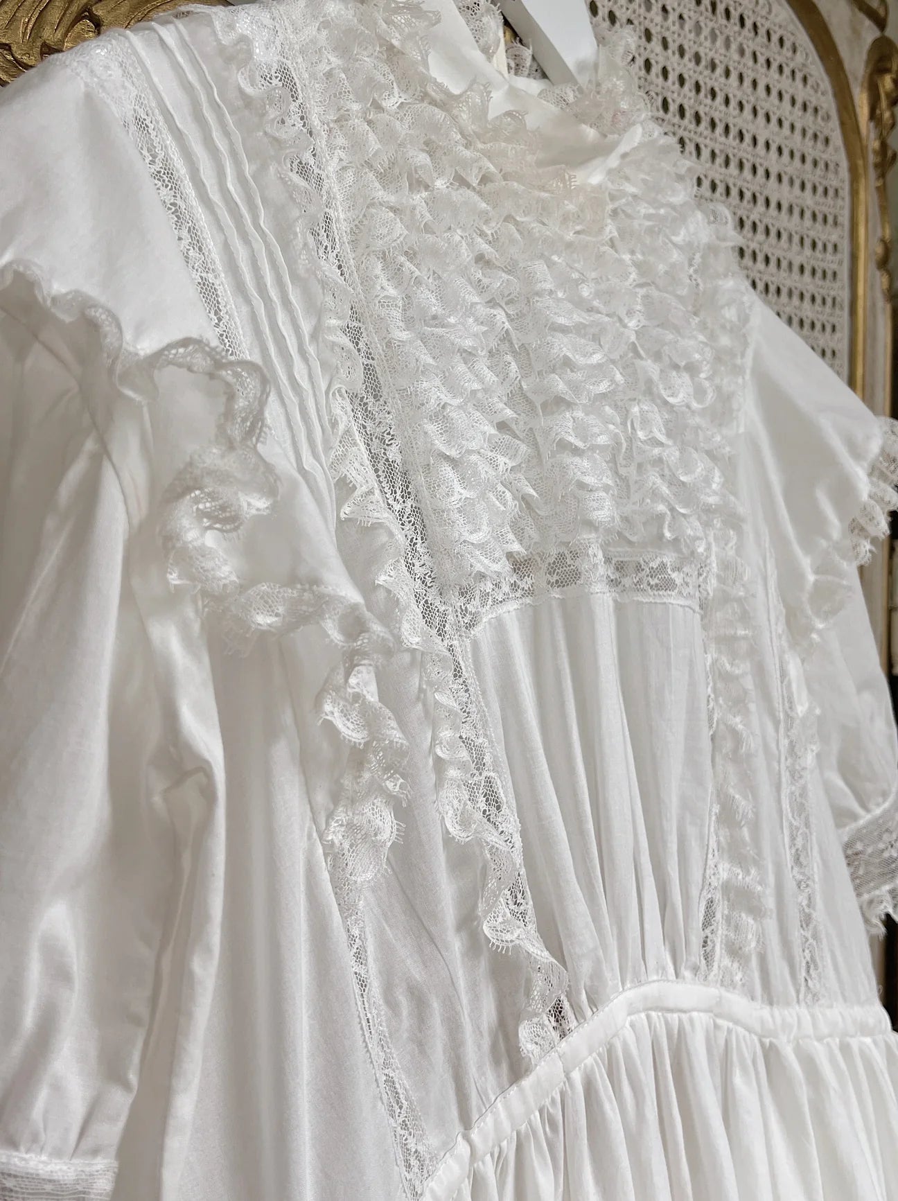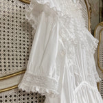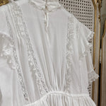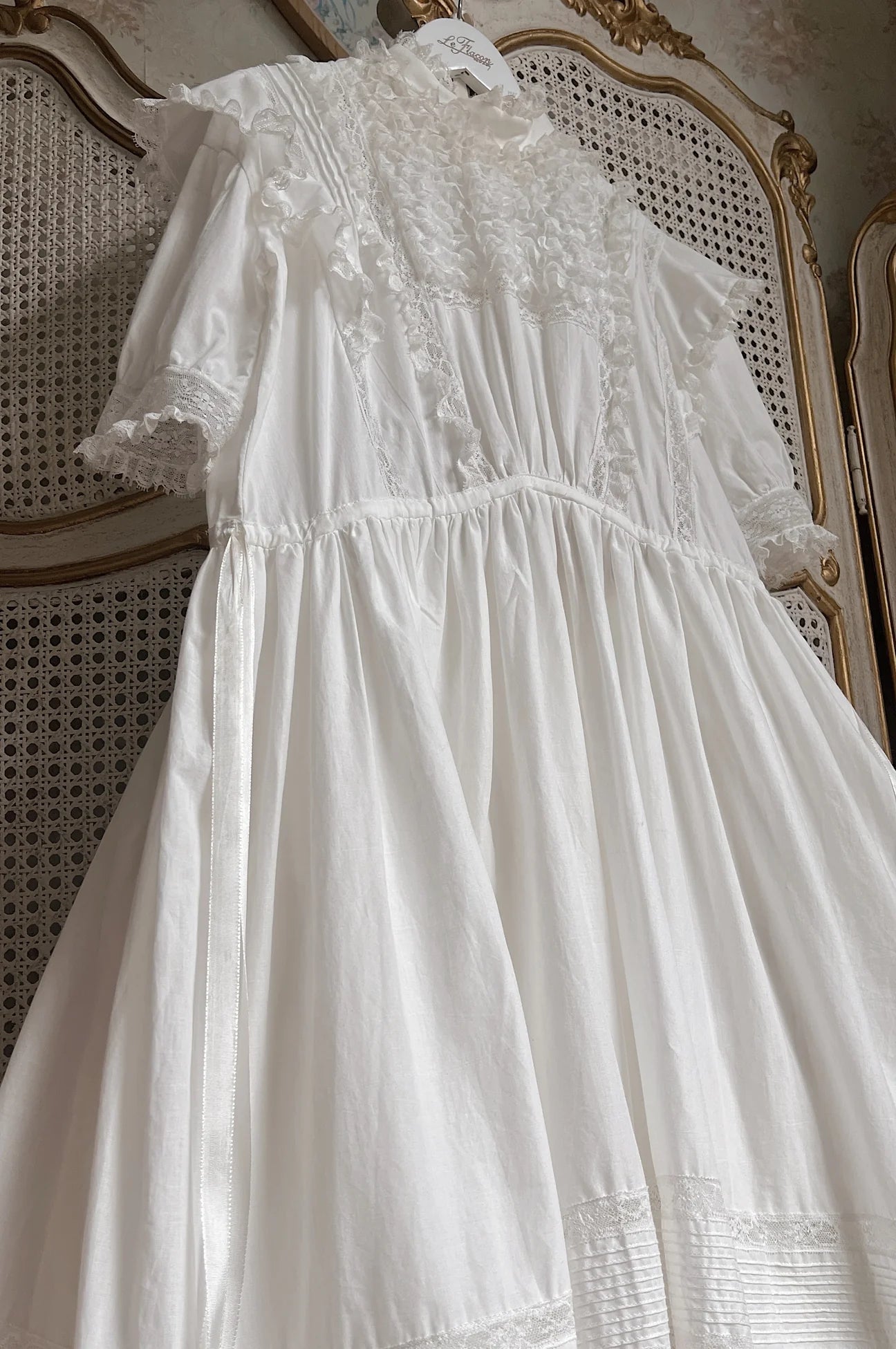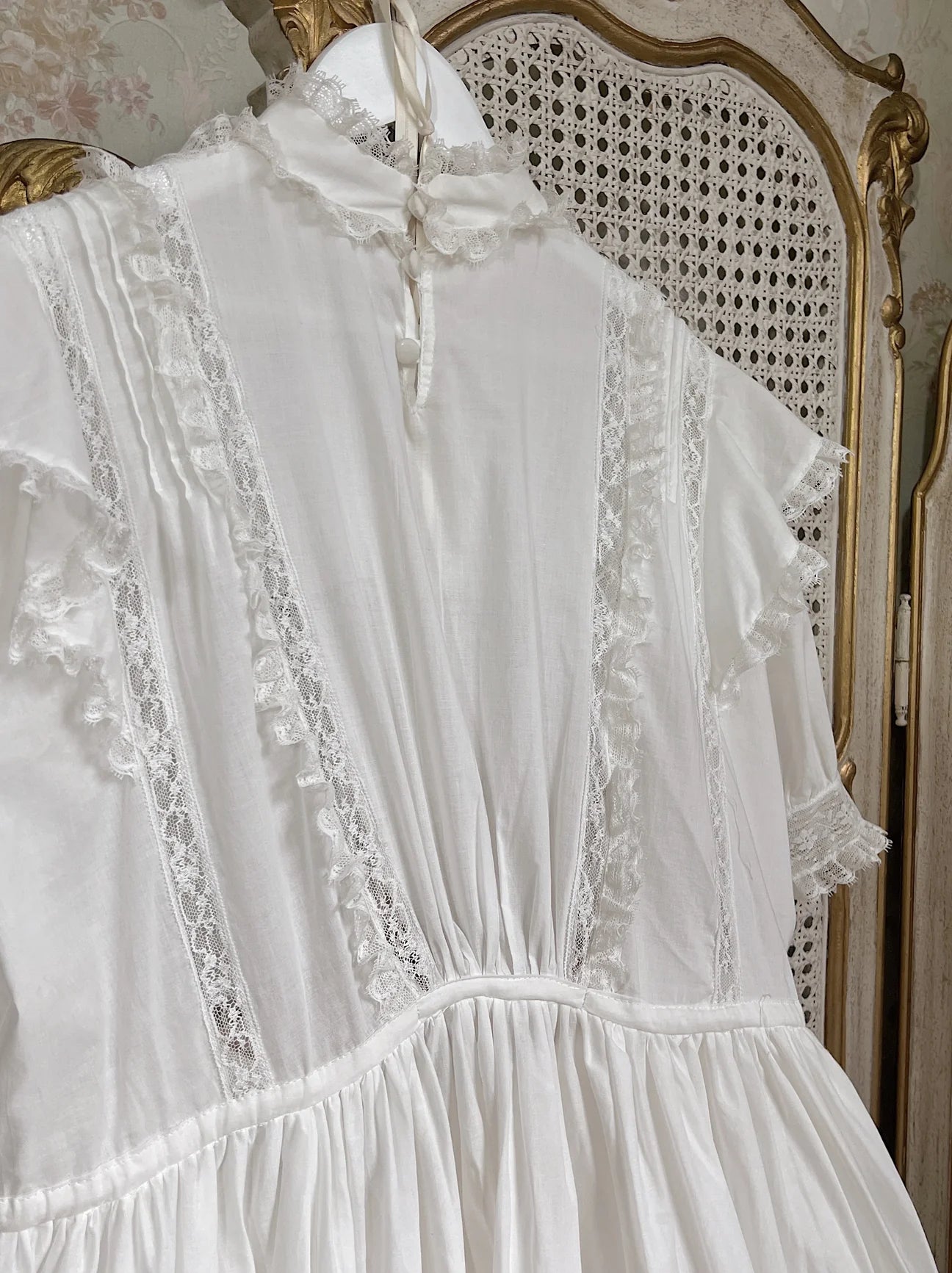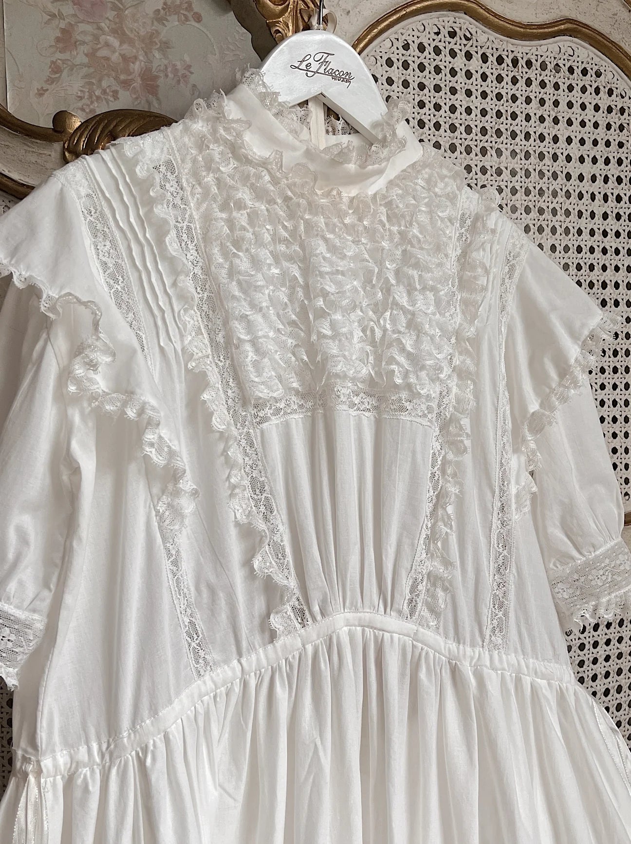 繊細なコットンレースと流れるようなフリルが重なり合い、まるで遠い別荘の庭に佇むような幻想的な雰囲気を纏わせてくれます。クラシカルで高貴なシルエットは、時を超えたロマンティックな物語を奏でます。
