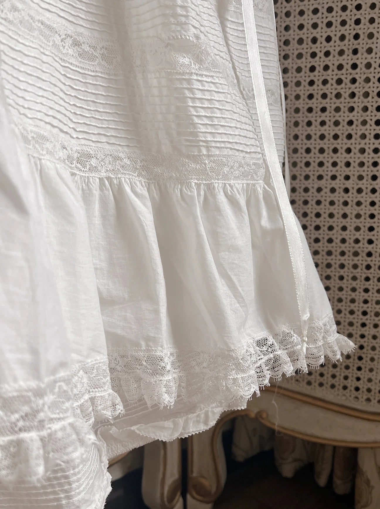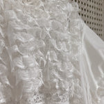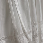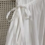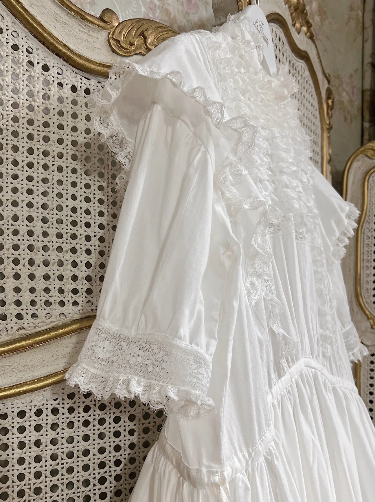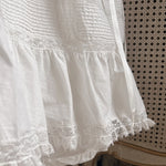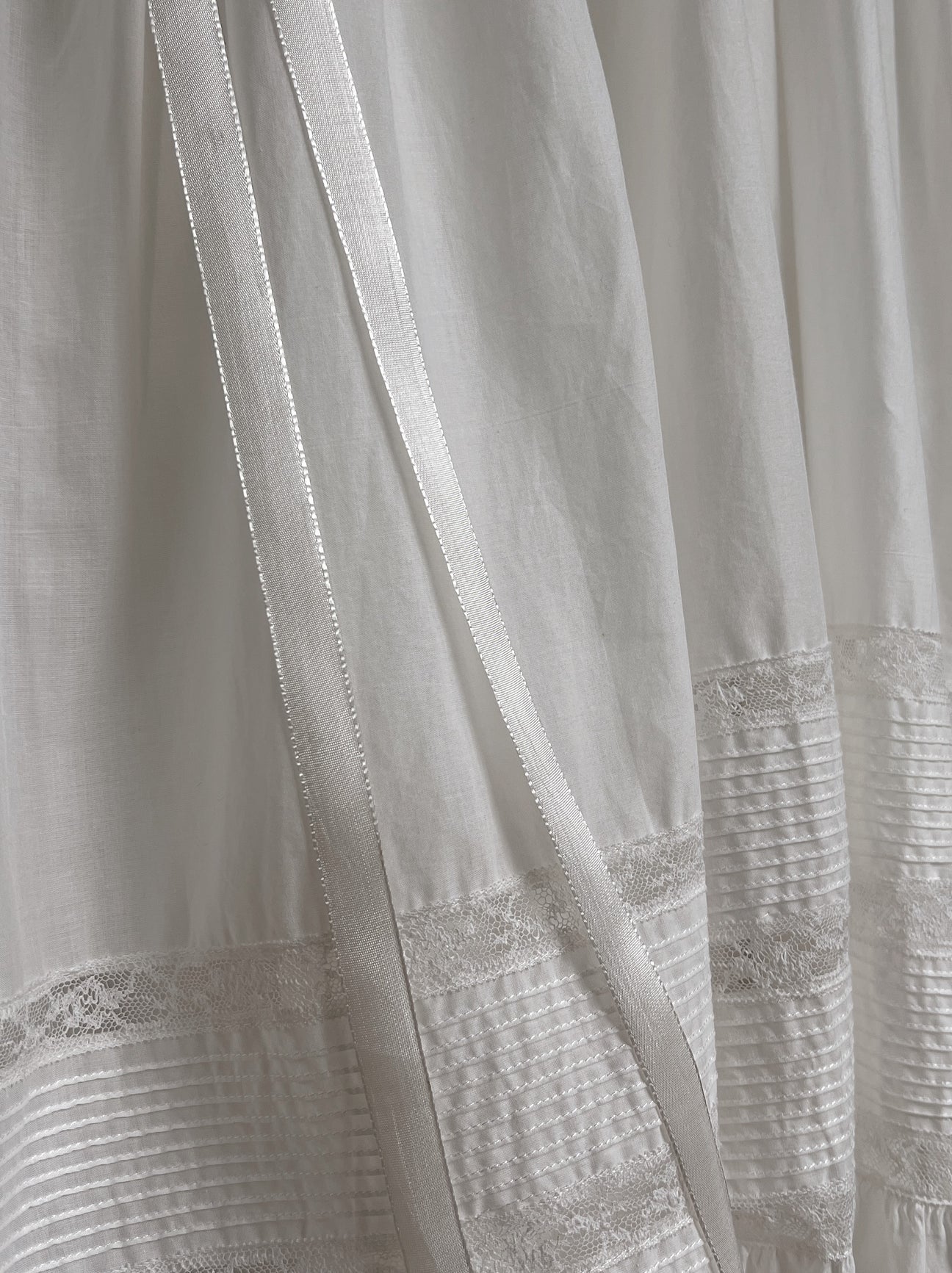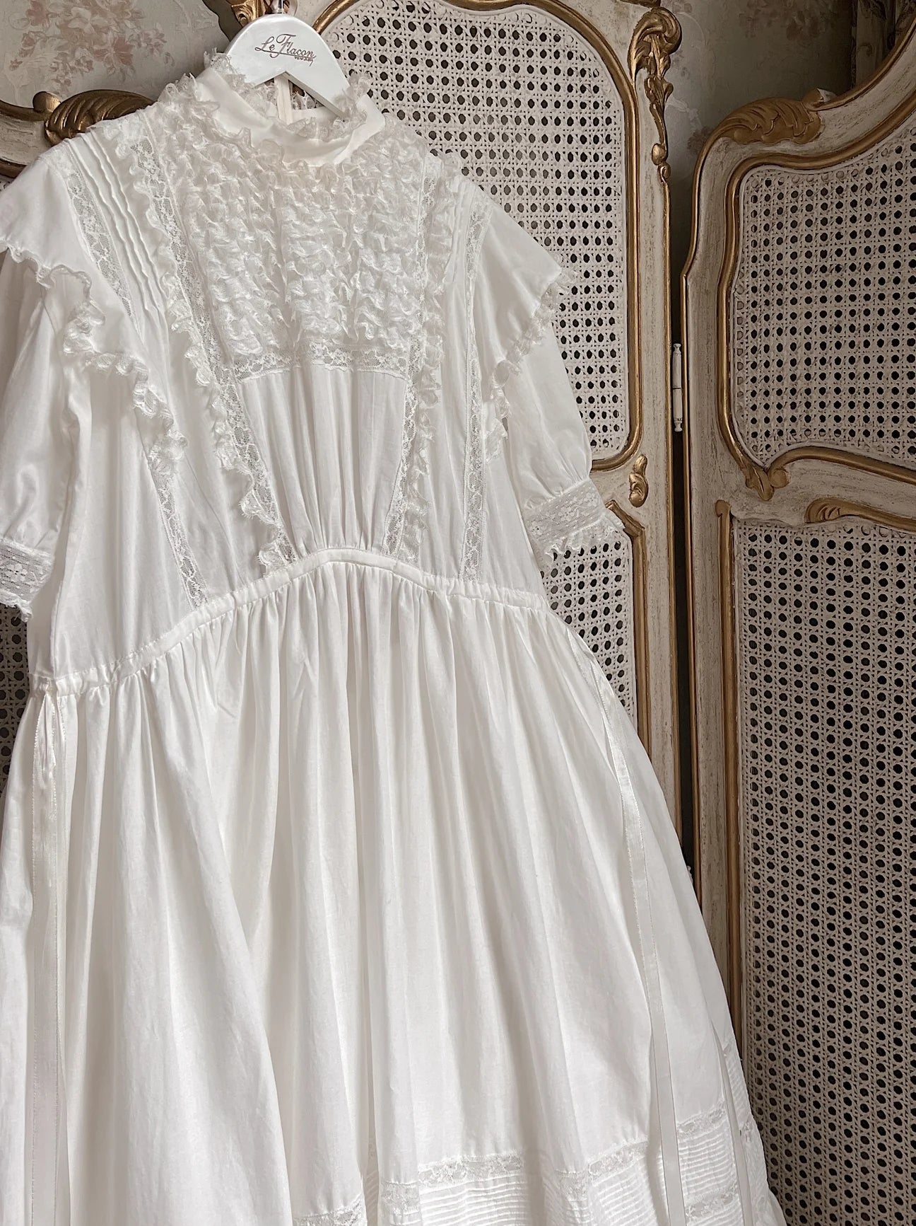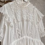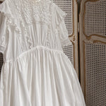 繊細なコットンレースと流れるようなフリルが重なり合い、まるで遠い別荘の庭に佇むような幻想的な雰囲気を纏わせてくれます。クラシカルで高貴なシルエットは、時を超えたロマンティックな物語を奏でます。