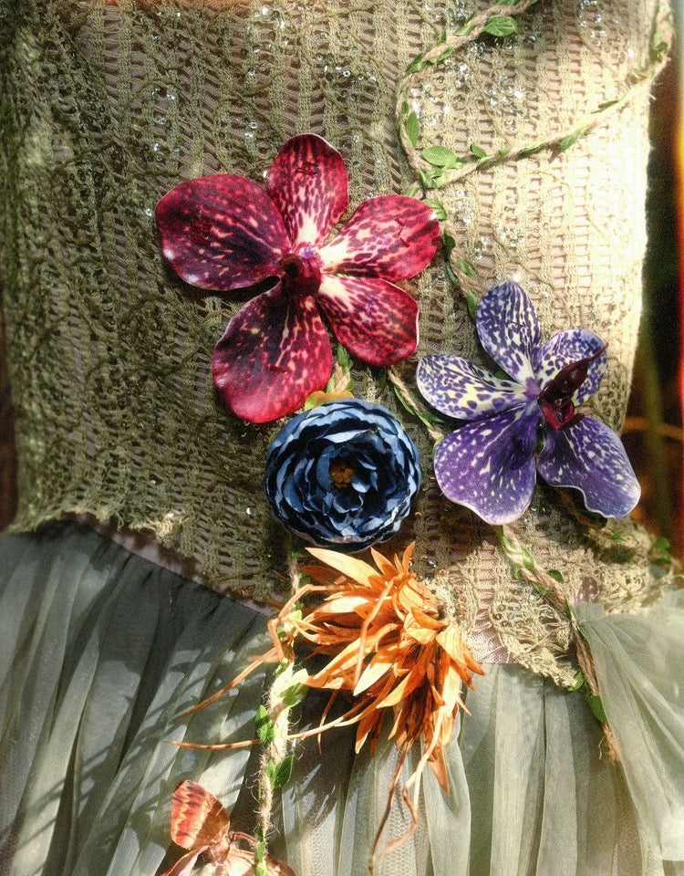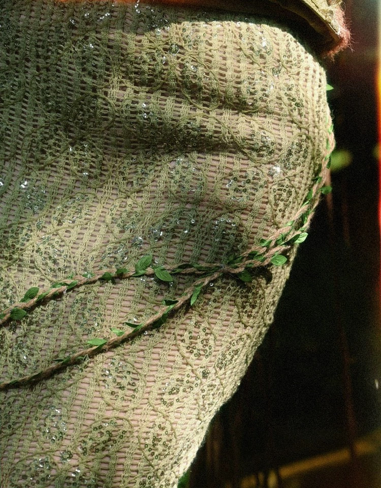 銀色のスパンコールをちりばめたクローバーレースが、太陽の光を浴びて黄金色の魚の鱗のようにきらめき、繊細な枝や咲き誇る花々と絡み合い、魅惑的で異次元の世界の物語を紡ぎ出します。このガウンをまとえば、あなたは神秘的な霞に包まれ、森の奥深くにニンフのささやきが響き渡るでしょう。