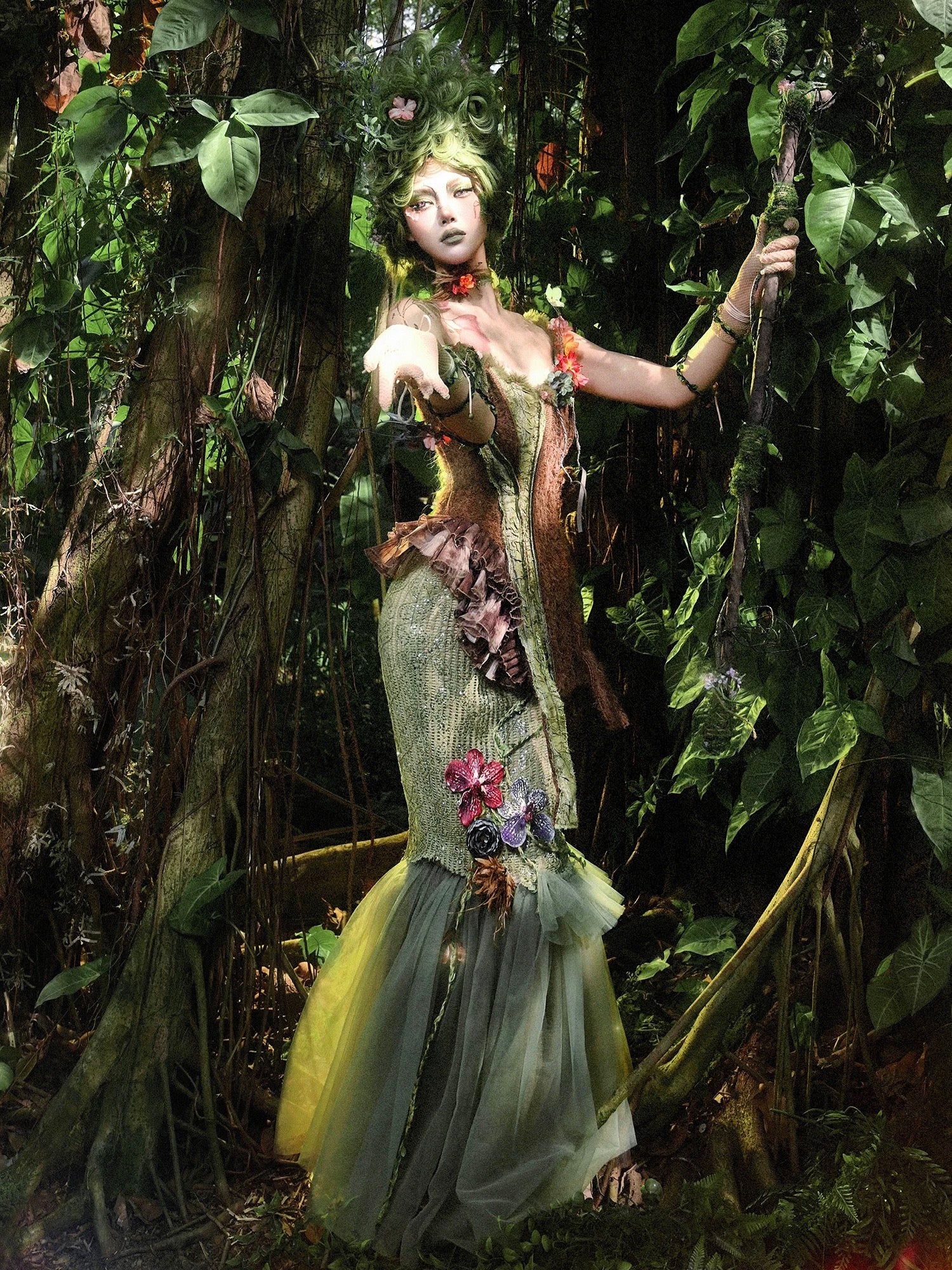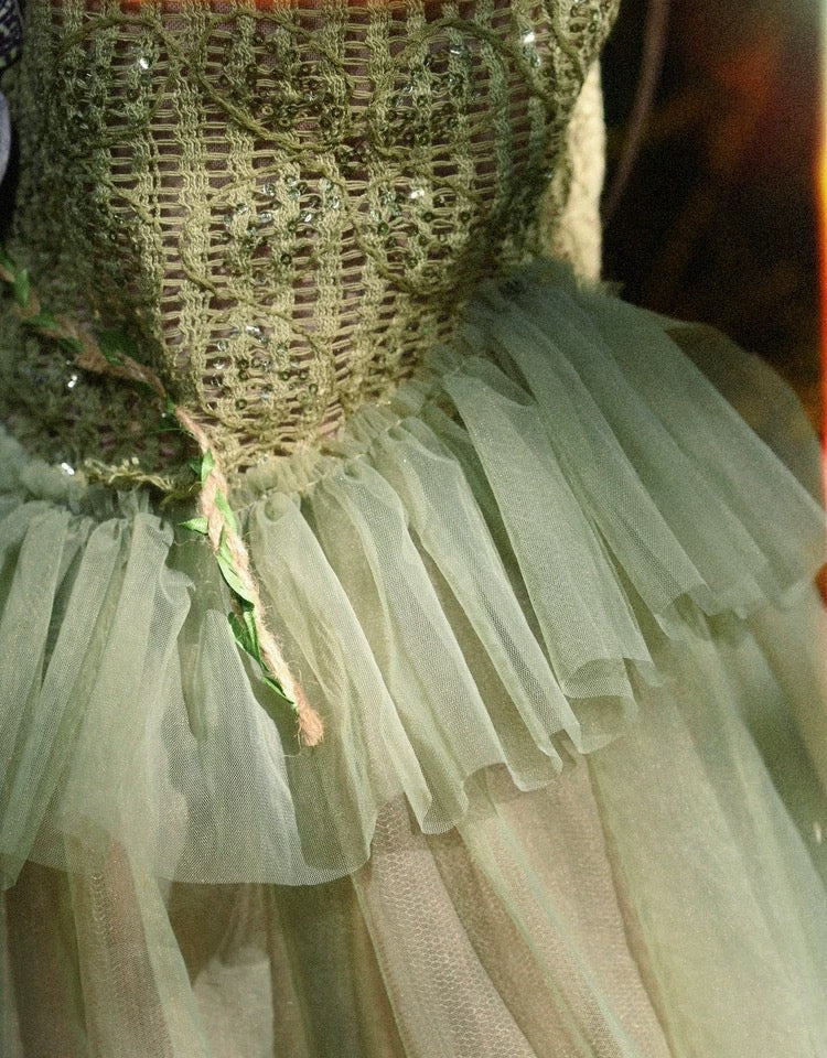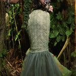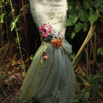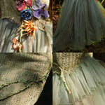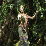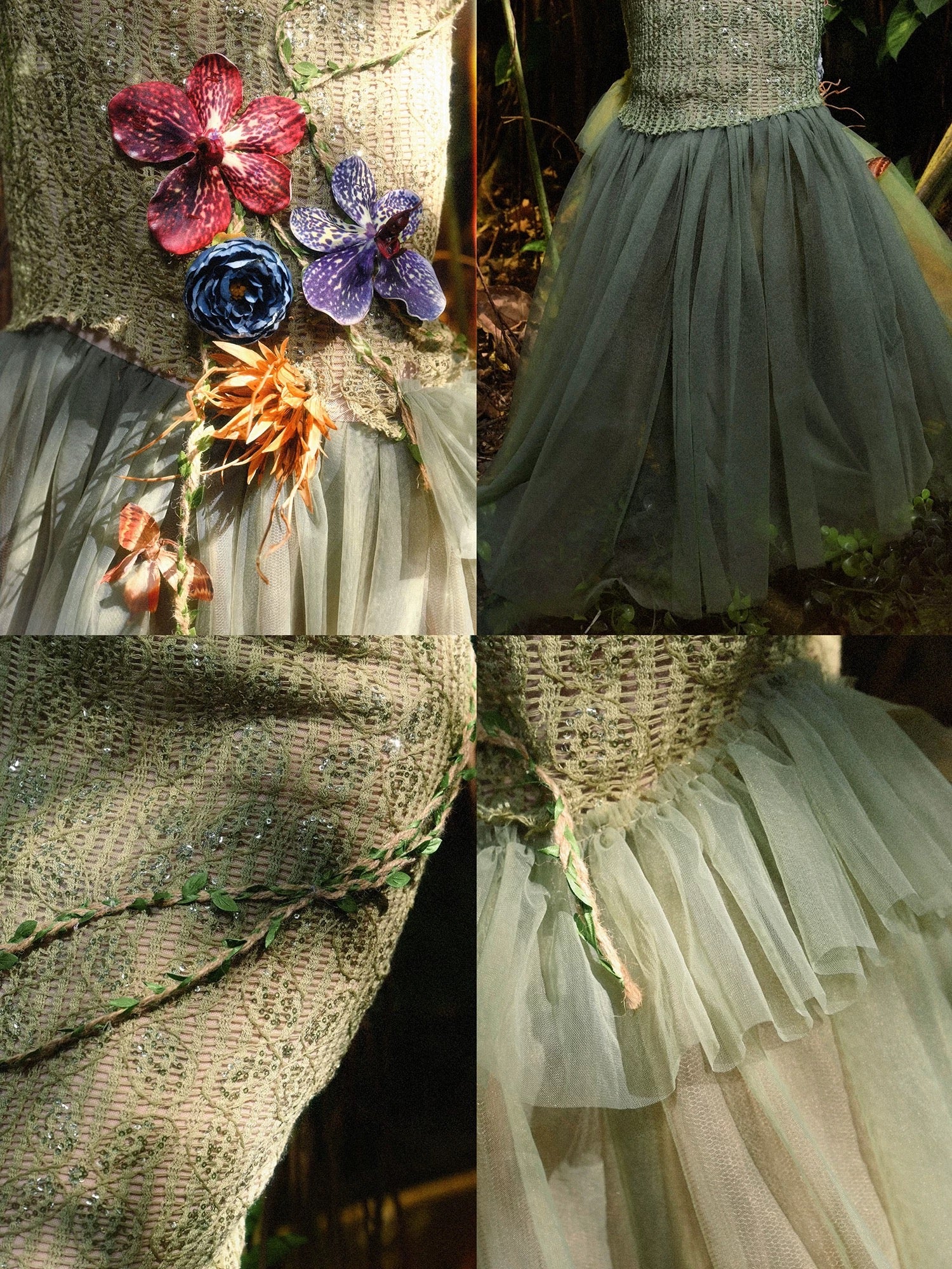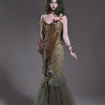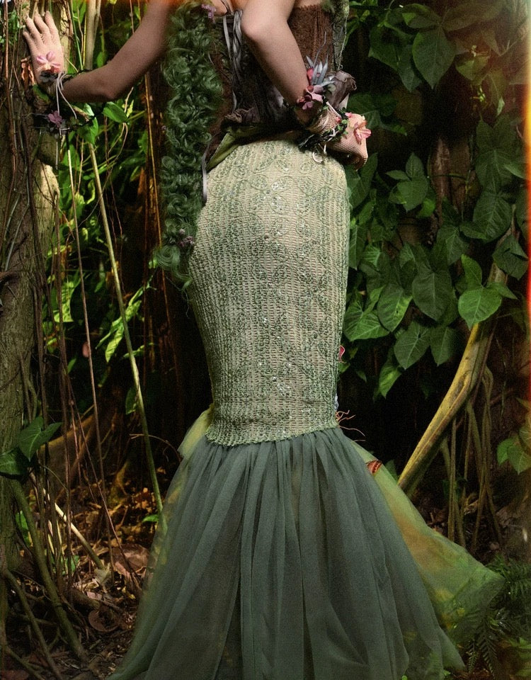 雨に濡れた森にひっそりと佇む隠れ家のように、この幽玄なフィッシュテールドレスは、静かな小川に漂う水草を思わせる落ち着いたモスグリーンに揺れ動きます。霧深い沼地のセイレーンのエッセンスと、雨季の不気味な花々が織りなす、そんな雰囲気を漂わせています。