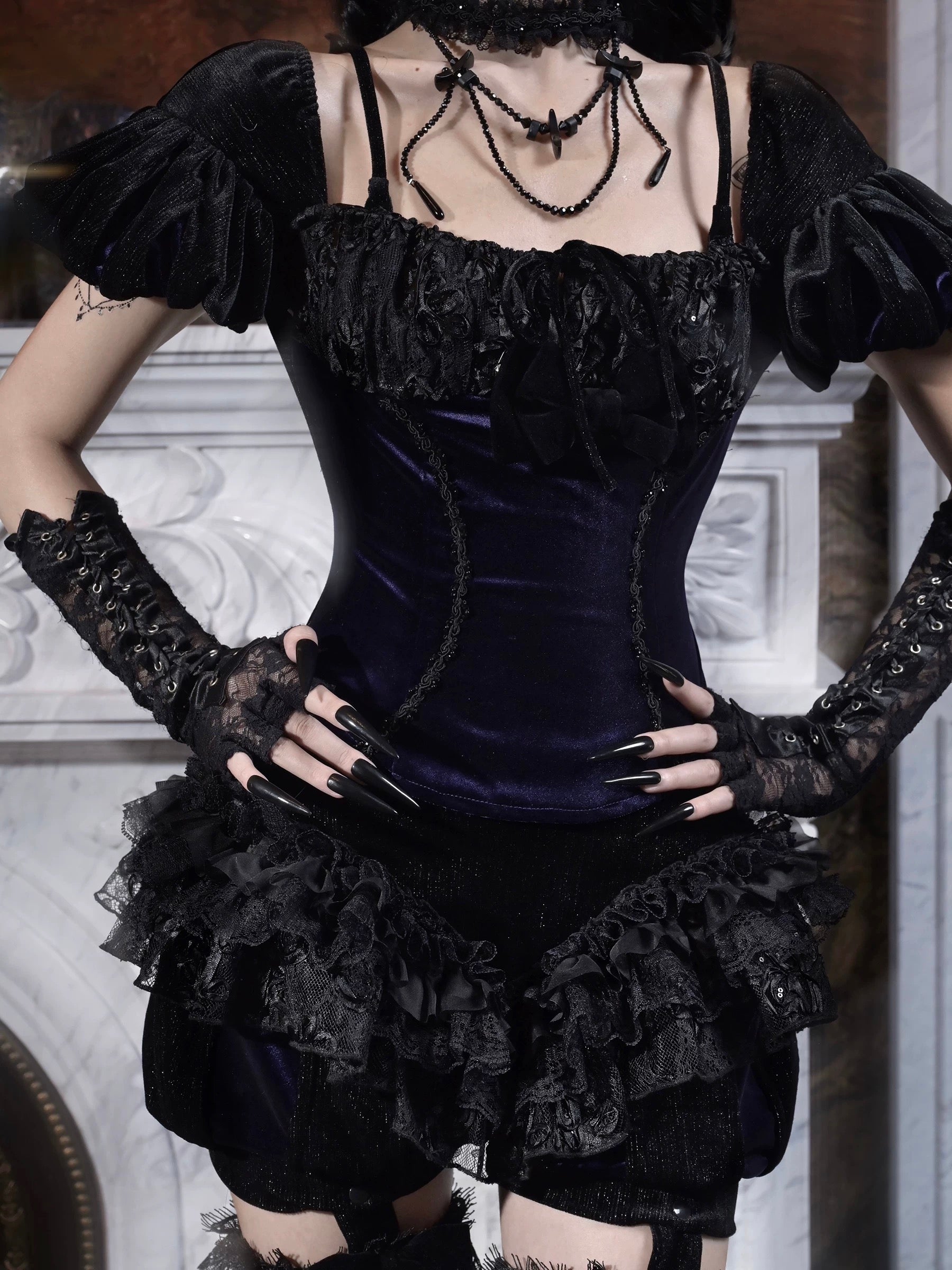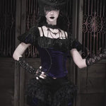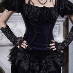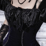 A relic of elegance and sorrow, the Velvet Lament Puff-Sleeve Top channels the opulent spirit of Blood Supply’s Moon Funeral collection. Deep midnight velvet is crowned with sculpted puff sleeves and a ruched lace neckline, finished with a velvet bow like a keepsake from the wake. Curved trim lines trace the bodice with quiet, chapel-dark shimmer.