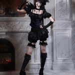 At the back, satin lacing creates a ceremonial closure—part corset, part farewell ribbon—while the soft lining keeps the piece wearable from dusk to procession. Poetic, dramatic, and timeless, it pairs with bloomers or skirts to complete a mourning-chic silhouette worthy of moonlit halls and Halloween rites.
