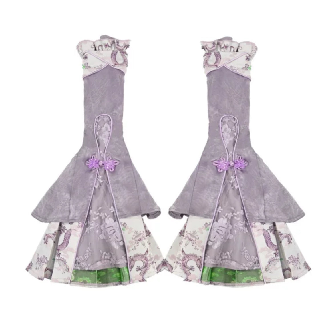 パステルパープルのカラーは、滑らかで光沢のあるサテン仕上げと、きらめく立体的な衿元ラインを織り込んだジャカード織りがエレガントさを醸し出します。ジャカード織りの表面にあしらわれた鮮やかな龍の模様は、光を受けて独特の輝きを放ちます。