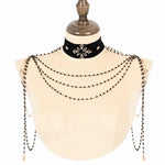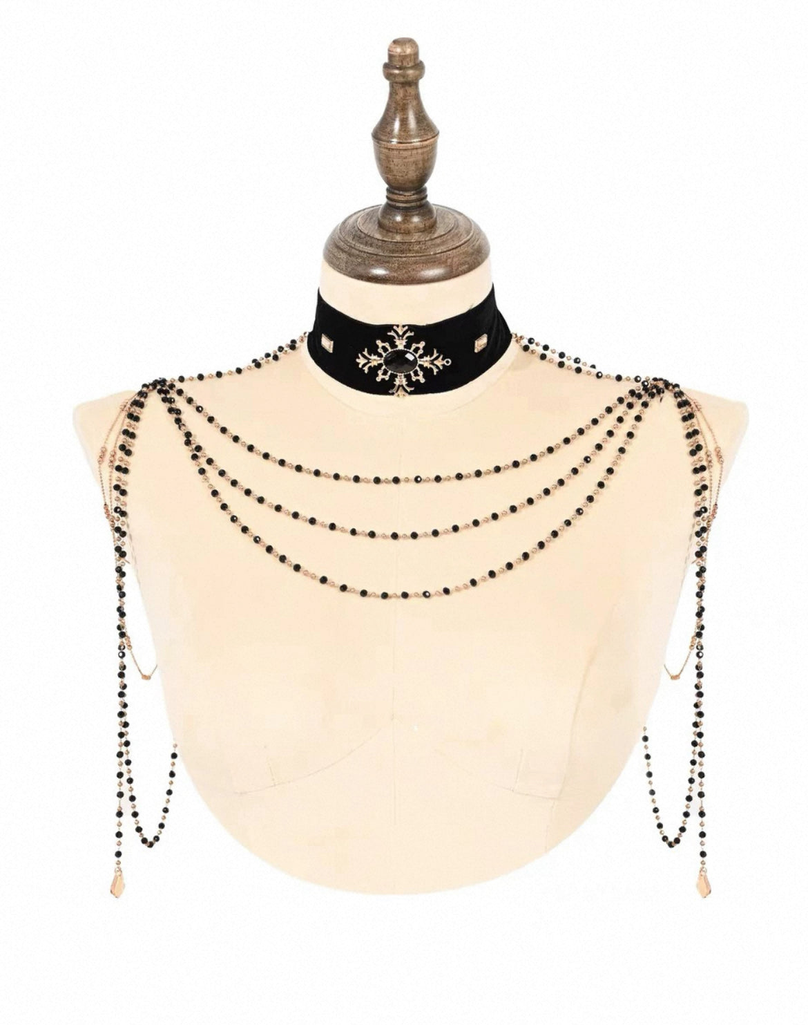 Made from soft velvet with delicate embroidery, the choker is adorned with sparkling crystal accents and drop-chain details. Draped over the shoulders, the layered chains shimmer under the light, creating a dramatic silhouette that feels both vintage and modern.
