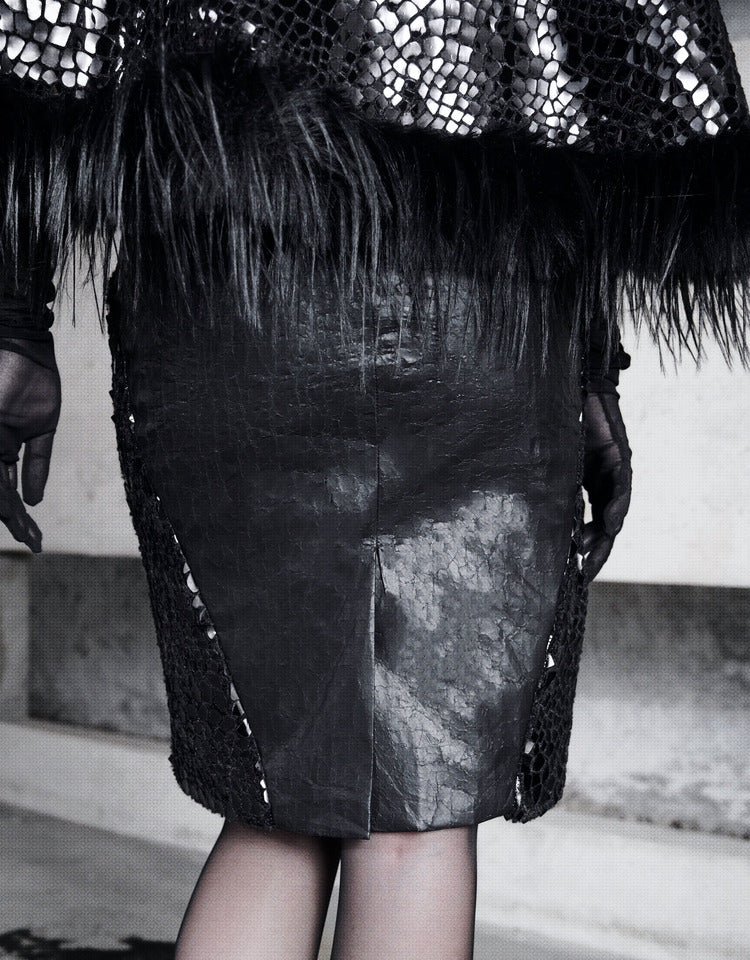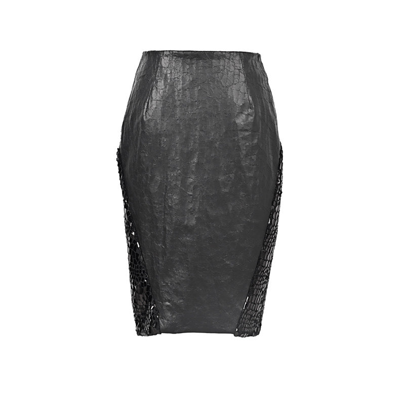 シンプルでありながらエレガントな流線型のカットが、体のラインを優しく包み込み、クリーンでありながら力強い美しさを放ちます。バックスリットとジッパーデザインがシンメトリーな印象を与え、エレガントで優美なスタイルを際立たせています。両サイドに配した贅沢な生地のパネルが、全体のルックに遊び心をプラスしています。洗練されたショート丈のスーツと合わせても、体にフィットするニットトップスと合わせても、このスカートは比類なきエレガンスと洗練さを醸し出します。