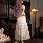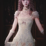 This midi dress from the Venus Reliquary collection is sculpted in soft ivory with layered lace and embroidered detail, evoking the delicate language of devotion. Inspired by vintage poetry and gothic silhouettes, it merges vintage elegance with a gothic Lolita fashion look.