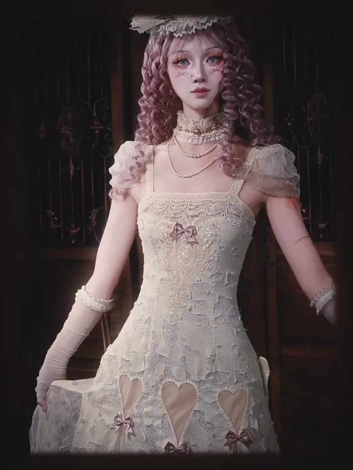 Featuring a square neckline with fluttering sleeves and intricate heart-shaped cut-outs along the skirt, each heart is lined with sheer mesh and adorned with pale pink satin bows—like love letters stitched into fabric. The bodice is gently shaped with raised embroidery and a butterfly bow at center front, offering a sweet contrast to the sculptural lace.