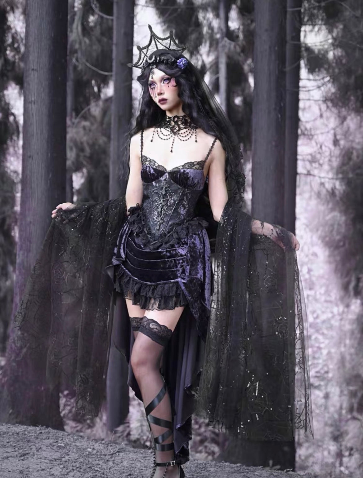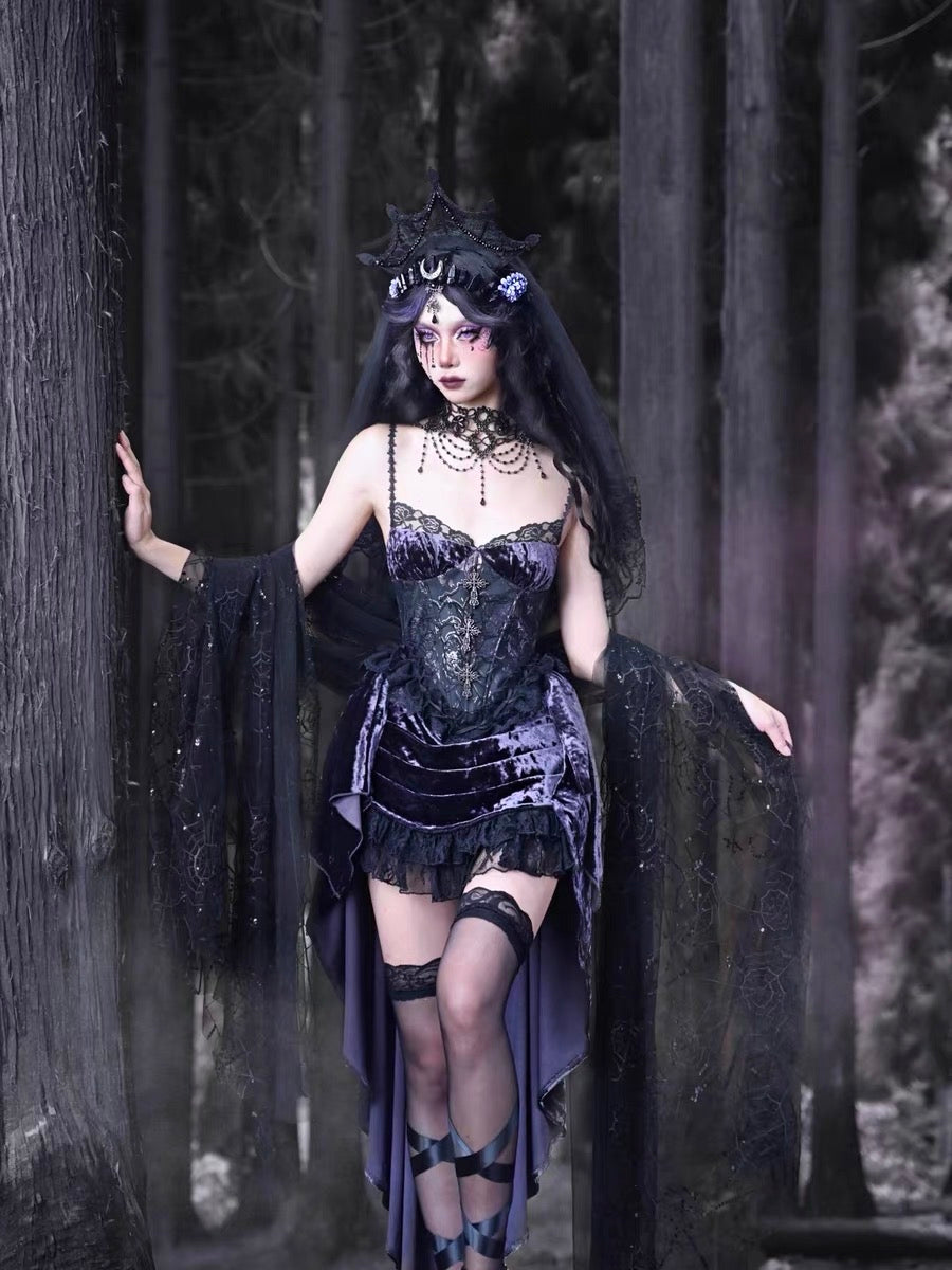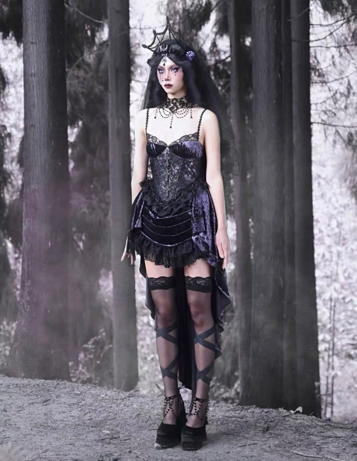 月の女神ゴシックベルベットハロウィンドレスのご紹介です!溶けるレースを使用し、繊細で小ぶりなストラップは、調節可能なバックルで簡単にアレンジできます。繊細な立体的なカッティングとレースのディテールが特徴的な、繊細で芸術的な胸元デザインが、美しさを際立たせます。