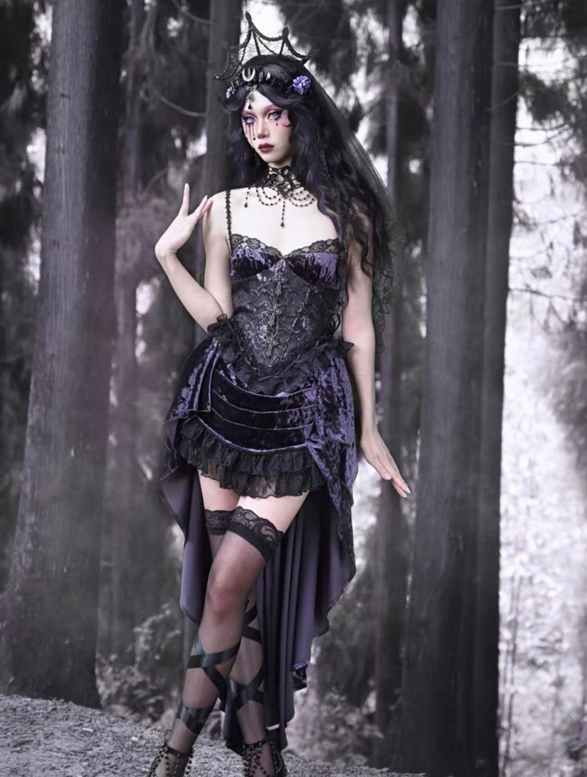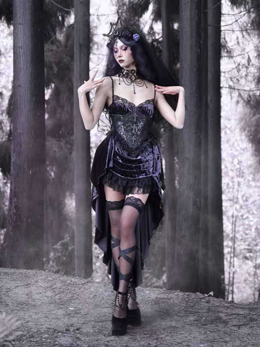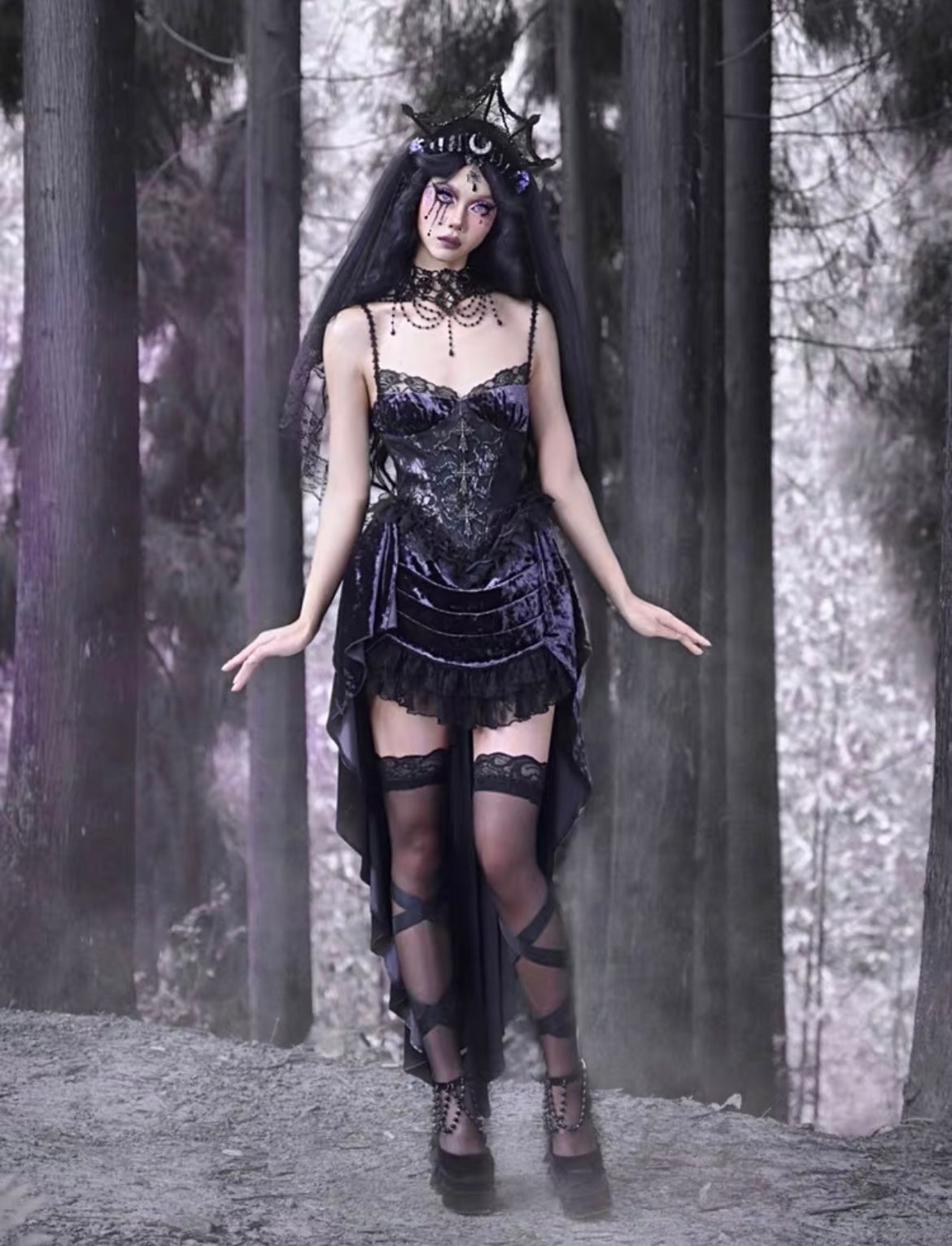 月の女神ゴシックベルベットハロウィンドレスのご紹介です!溶けるレースを使用し、繊細で小ぶりなストラップは、調節可能なバックルで簡単にアレンジできます。繊細な立体的なカッティングとレースのディテールが特徴的な、繊細で芸術的な胸元デザインが、美しさを際立たせます。