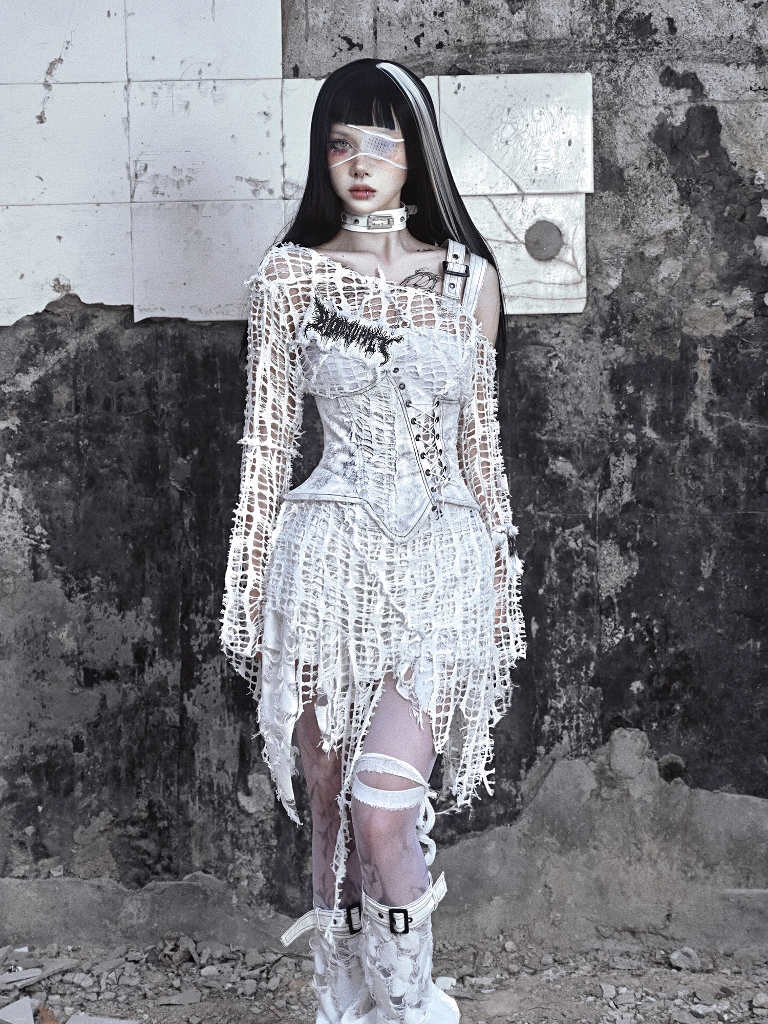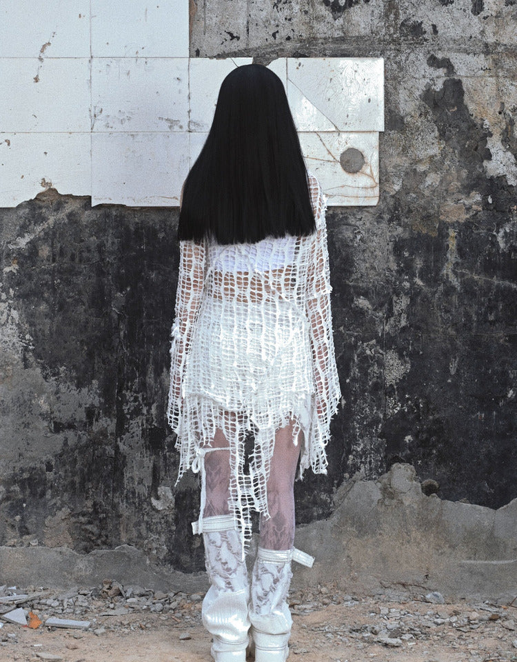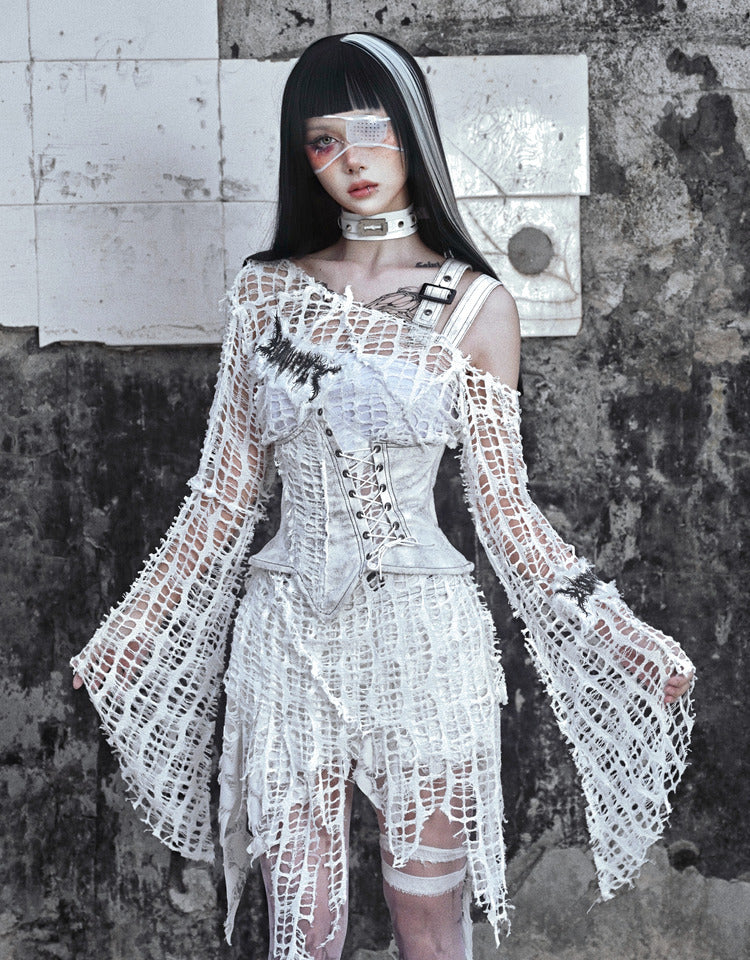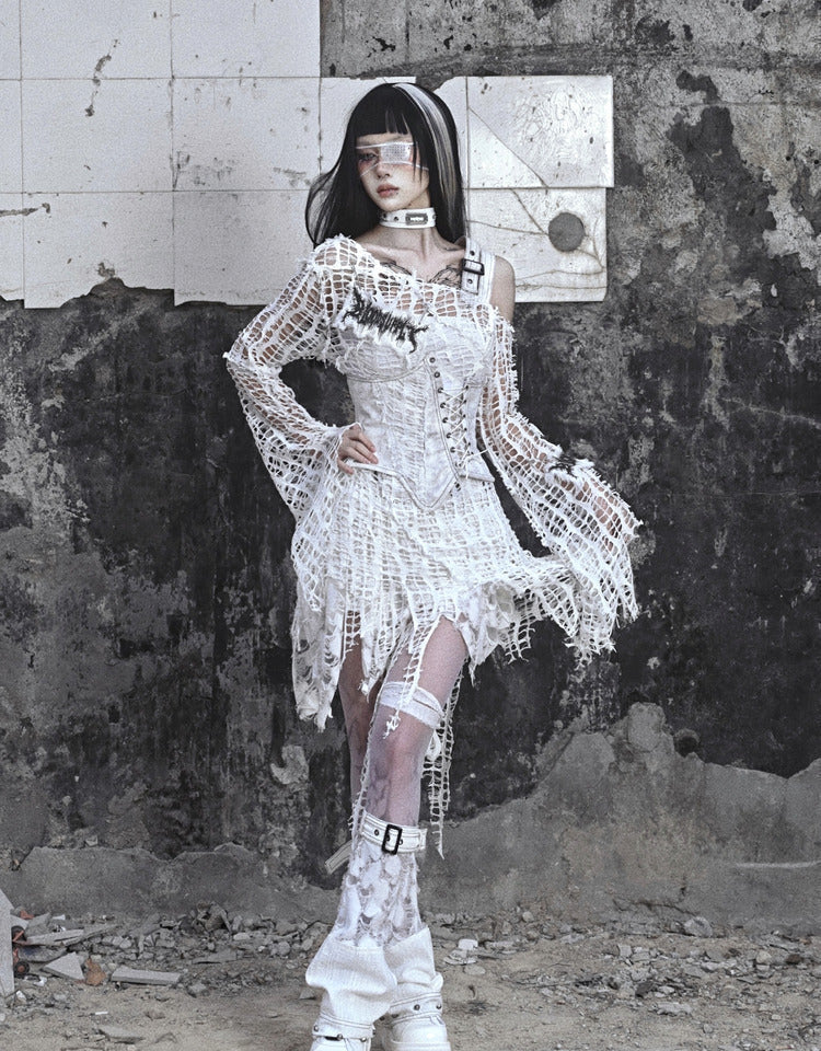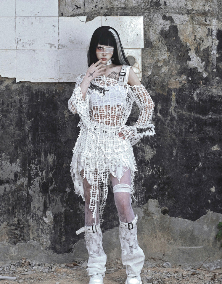 このトップスは、取り外し可能な布パッチが特徴で、汎用性を高めています。パッチは簡単に取り外したり、付け替えたりできるので、自分らしいスタイリングを楽​​しめます。ダメージ加工されたフィッシュネットデザインは、反骨精神と個性を想起させ、パンク、ゴス、グランジといった様々なサブカルチャーの精神を捉えています。